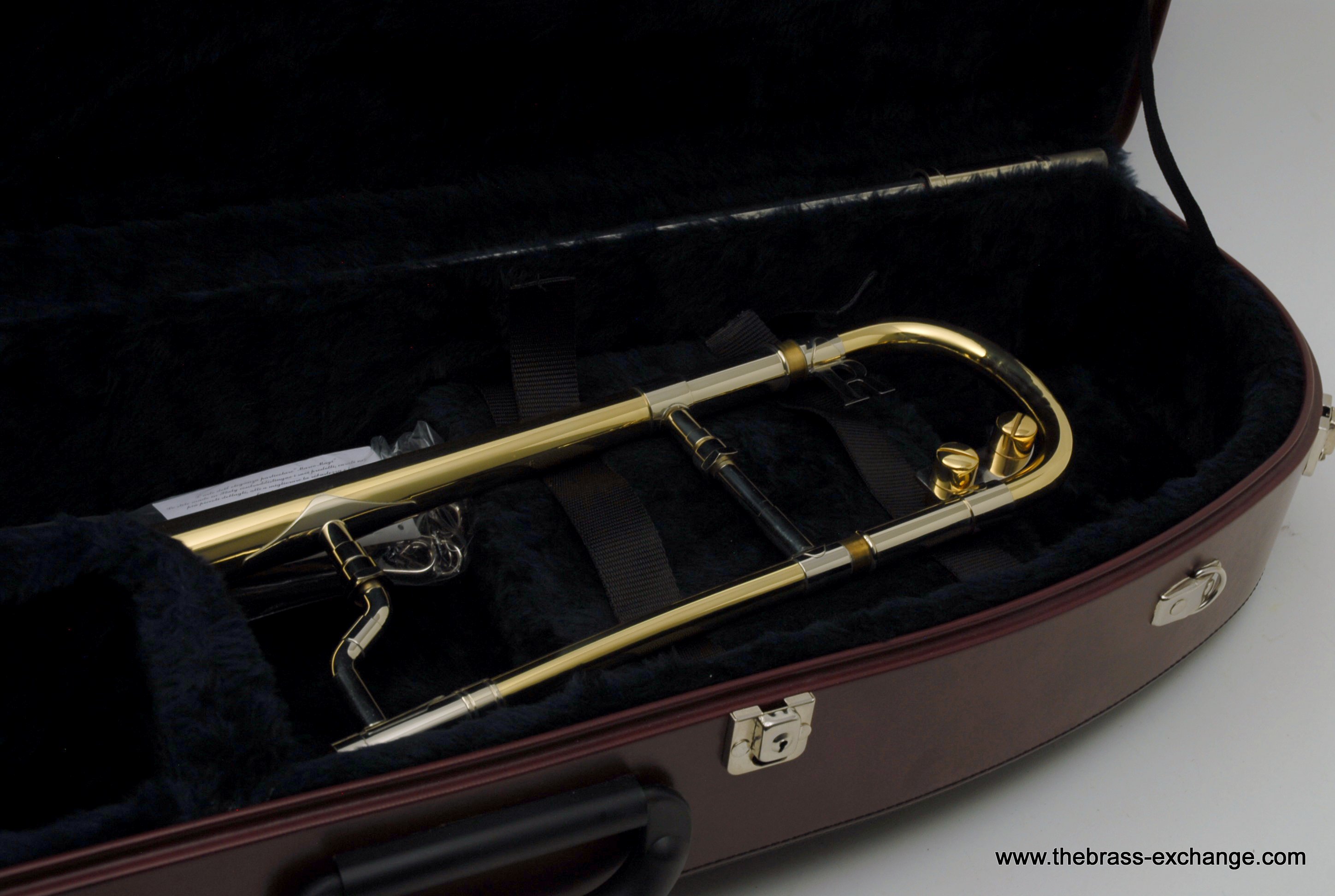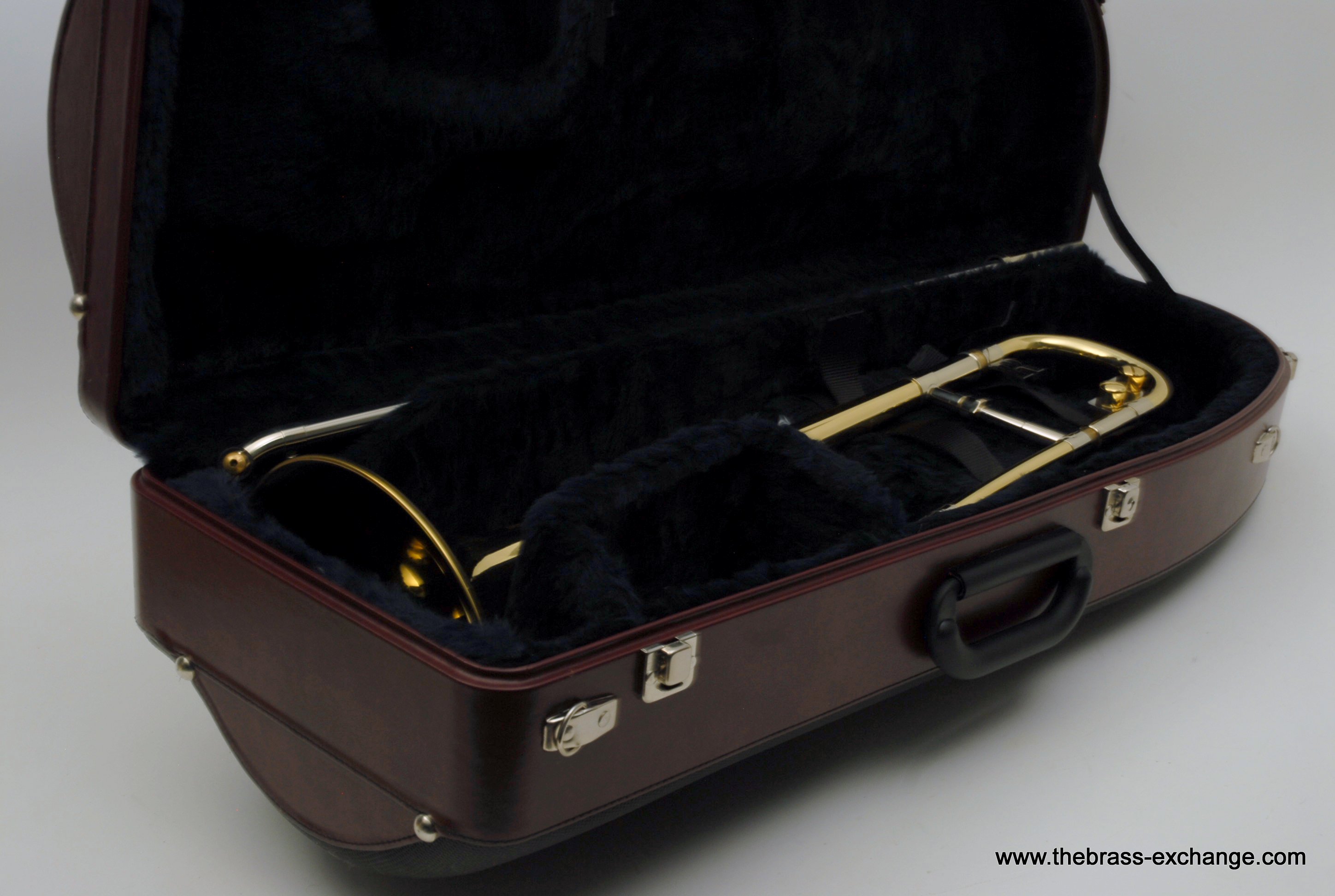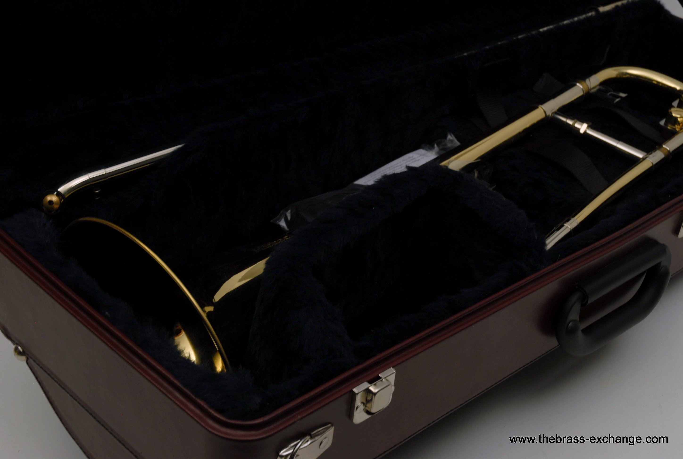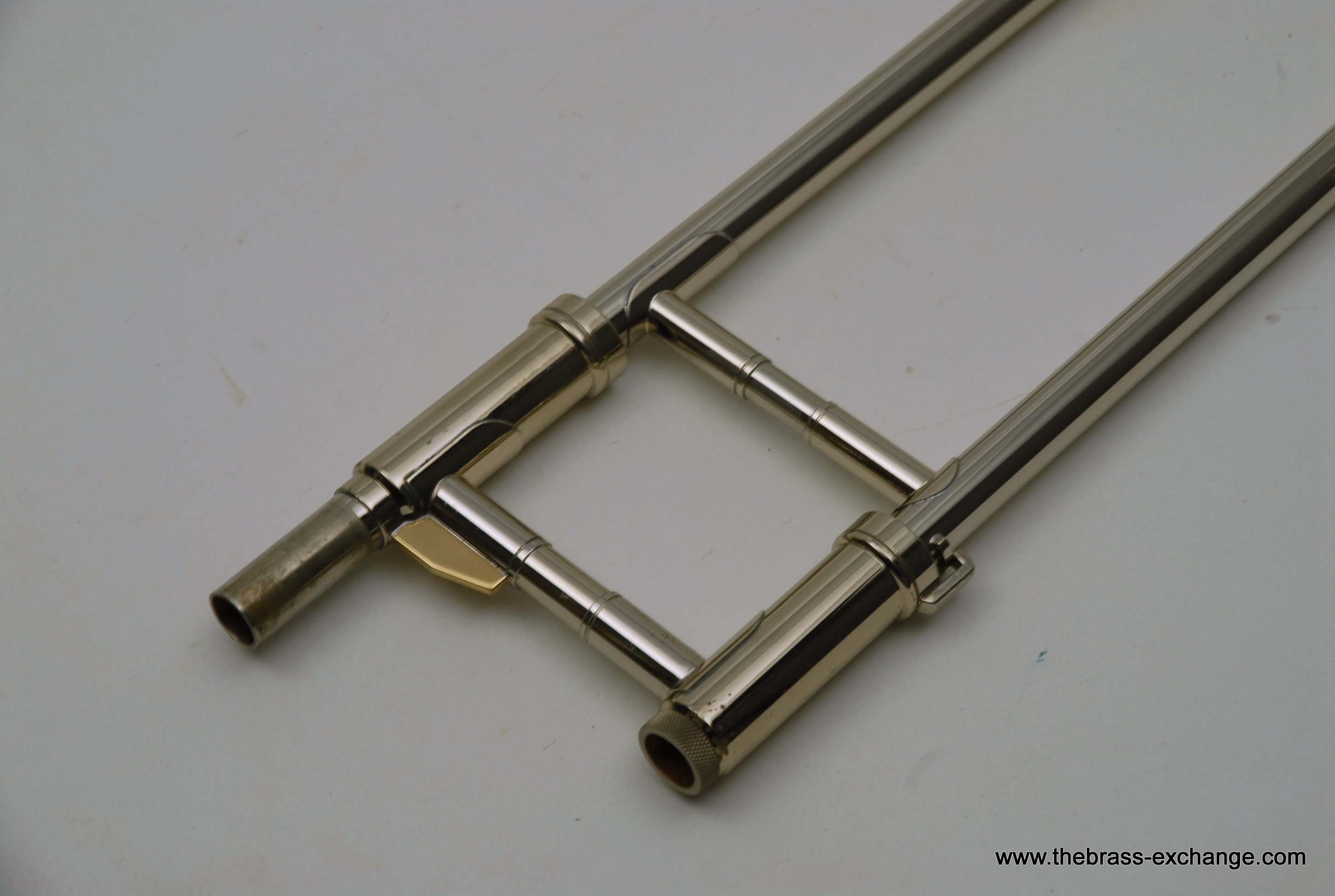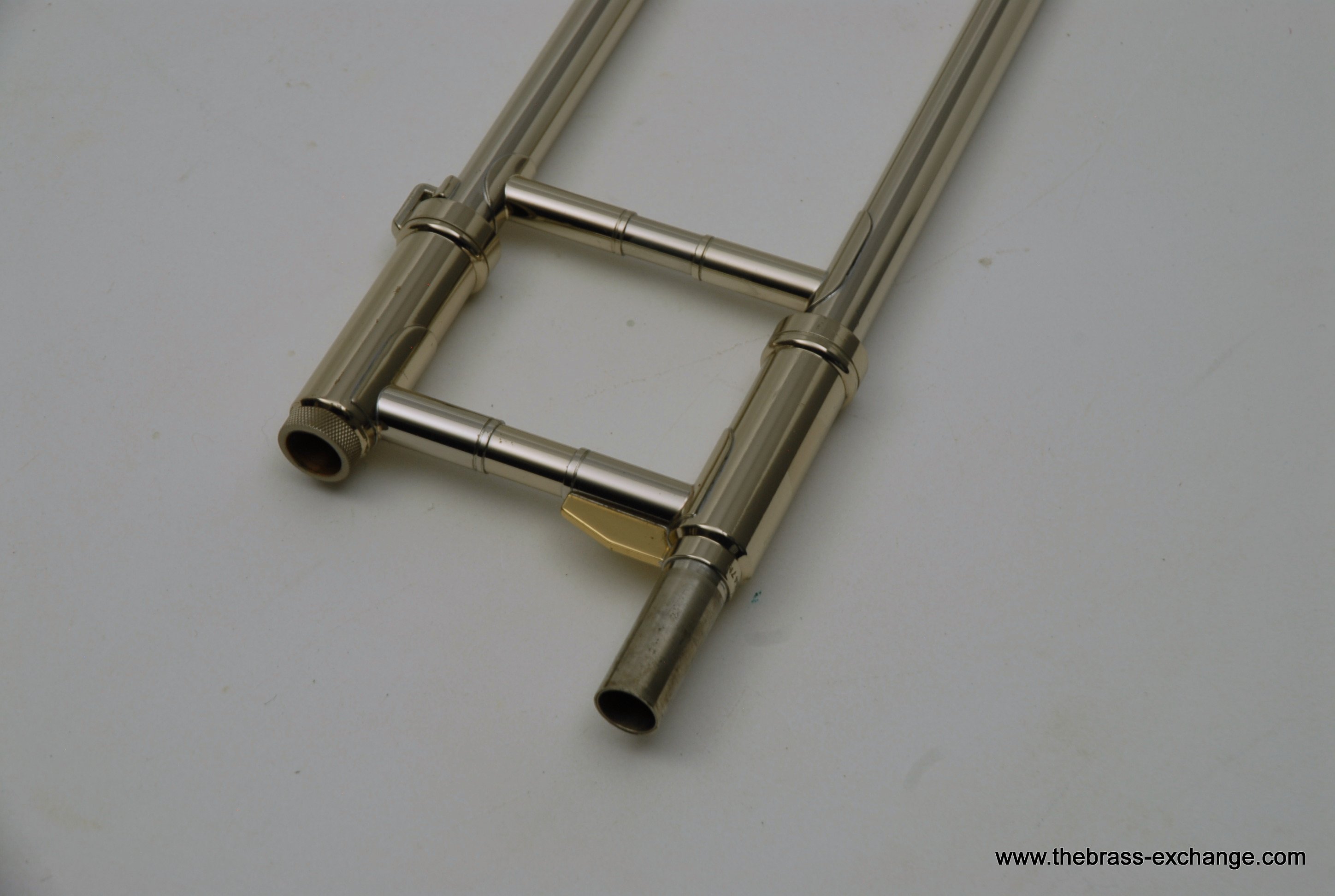 Rath R3 Professional Custom Medium Bore Tenor Trombone Made in England. Pre-owned super excellent condition .525 bore with removable neck pipe, nickel silver slide. Has 8" yellow brass bell, model 750Y. Standard yellow brass tuning slide with signature Rath Balance weight built into tuning slide. Is an excellent playing .525 bore with a complex sound and plays easily. Handslide is fantastic. Minor dings removed from tuning slide crook, is fine now. Overall lacquer is in excellent condition. Would be an excellent choice for anyone looking to play a unique .525 size, or add to your collection of other Rath modular components. Is compatible with Rath custom valve sections. Includes a new Marco Magi NN-TKR case, made in Italy. Also includes 3 removable leadpipes, 2 of the pipes take large shank mouthpiece, 1 pipe takes small shank mouthpiece. Would be great jazz/commercial style trombone.