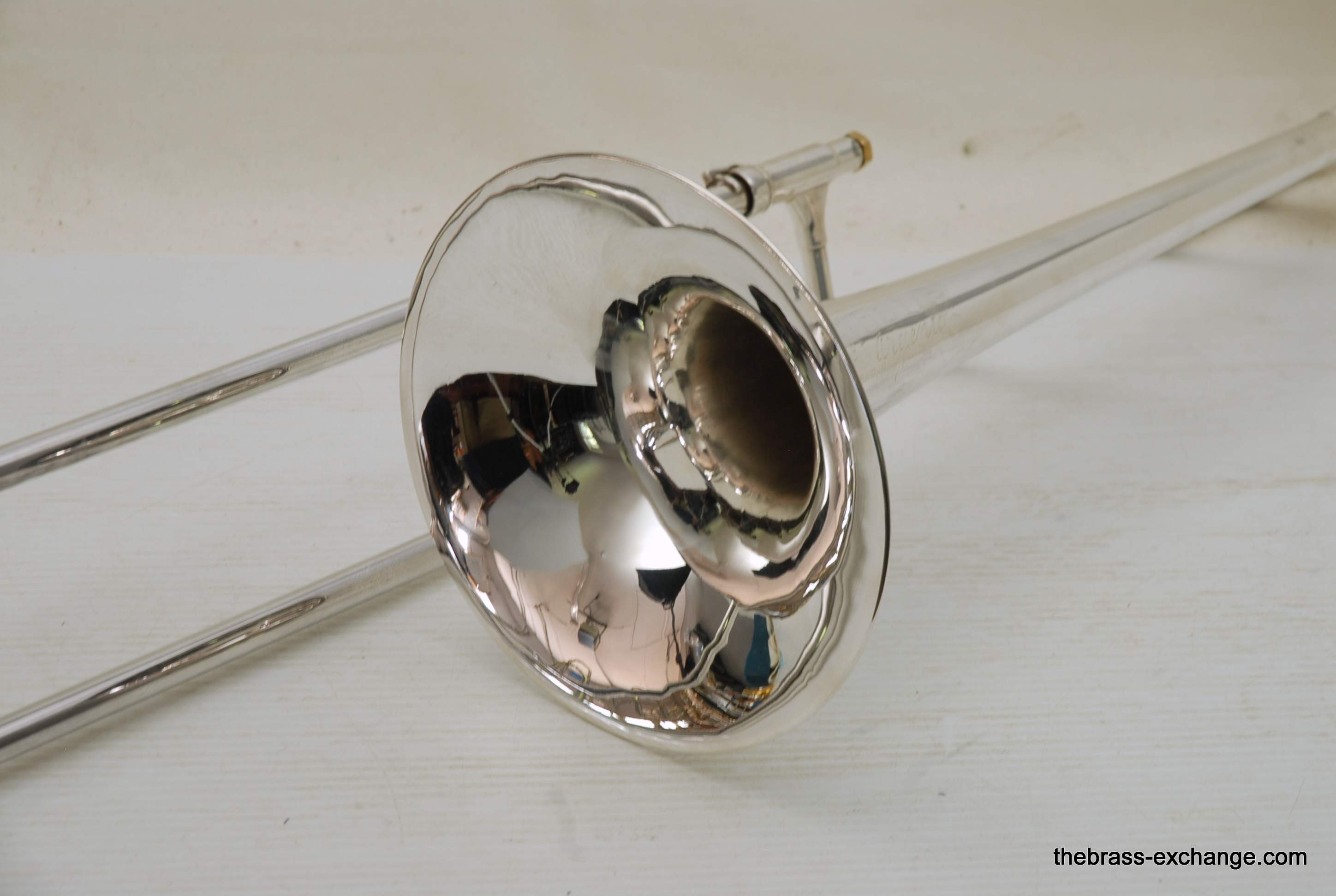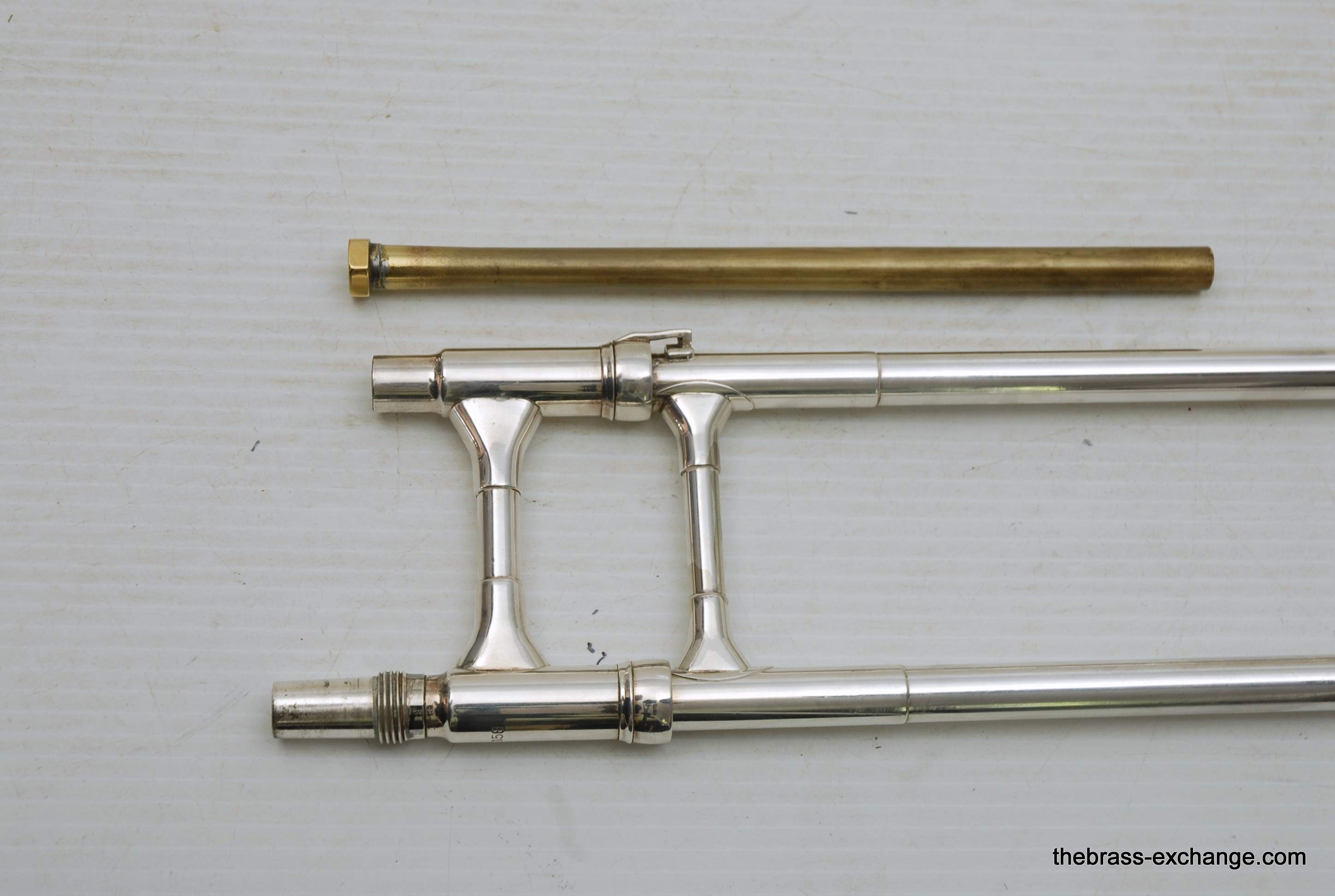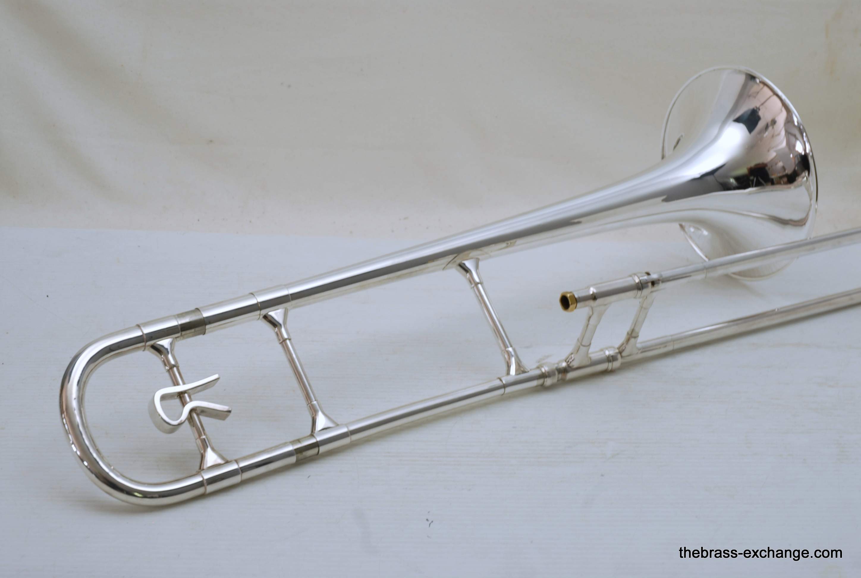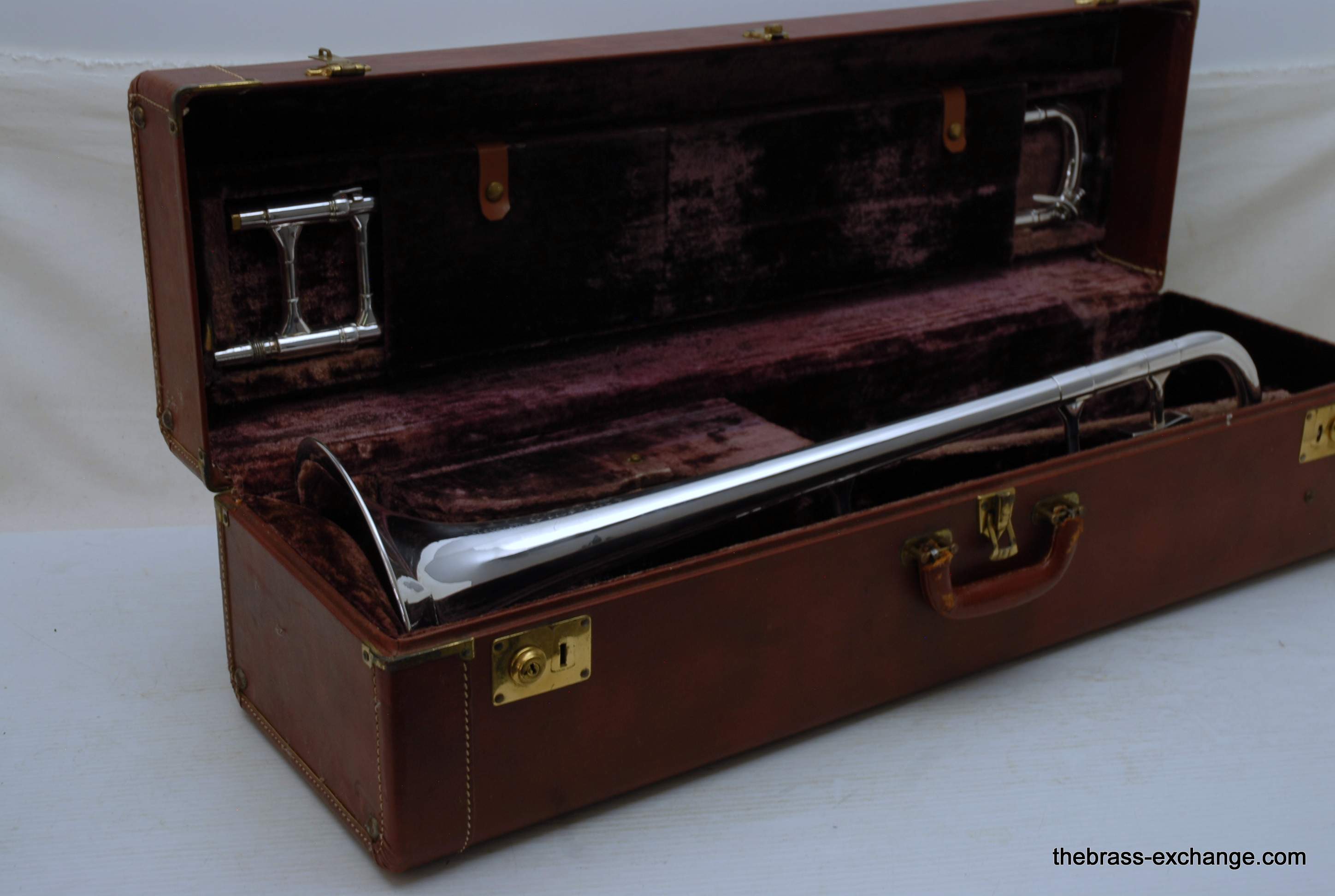 Reynolds TO-26 Medium Bore .520 Silver Plated Tenor. Has 8.5" Bell with .520 straight bore handslide and removable leadpipe. You could consider this a small big horn, or a big small horn. It plays like a medium, but a little extra width in sound with the 8.5" Bell. All original parts and silver plating. Made between 1061-1964. This is a Pro level instrument. Handslide is straight, some minor plating wear. It's a 60 year old instrument and still plays great. Would be an excellent all around tenor for band, jazz band, anywhere when and F trigger is not desired, and small bore is too small. This is a medium size horn with a gorgeous sound. Has had full shop service and is gig ready. Original case included. In-stock for immediate delivery.