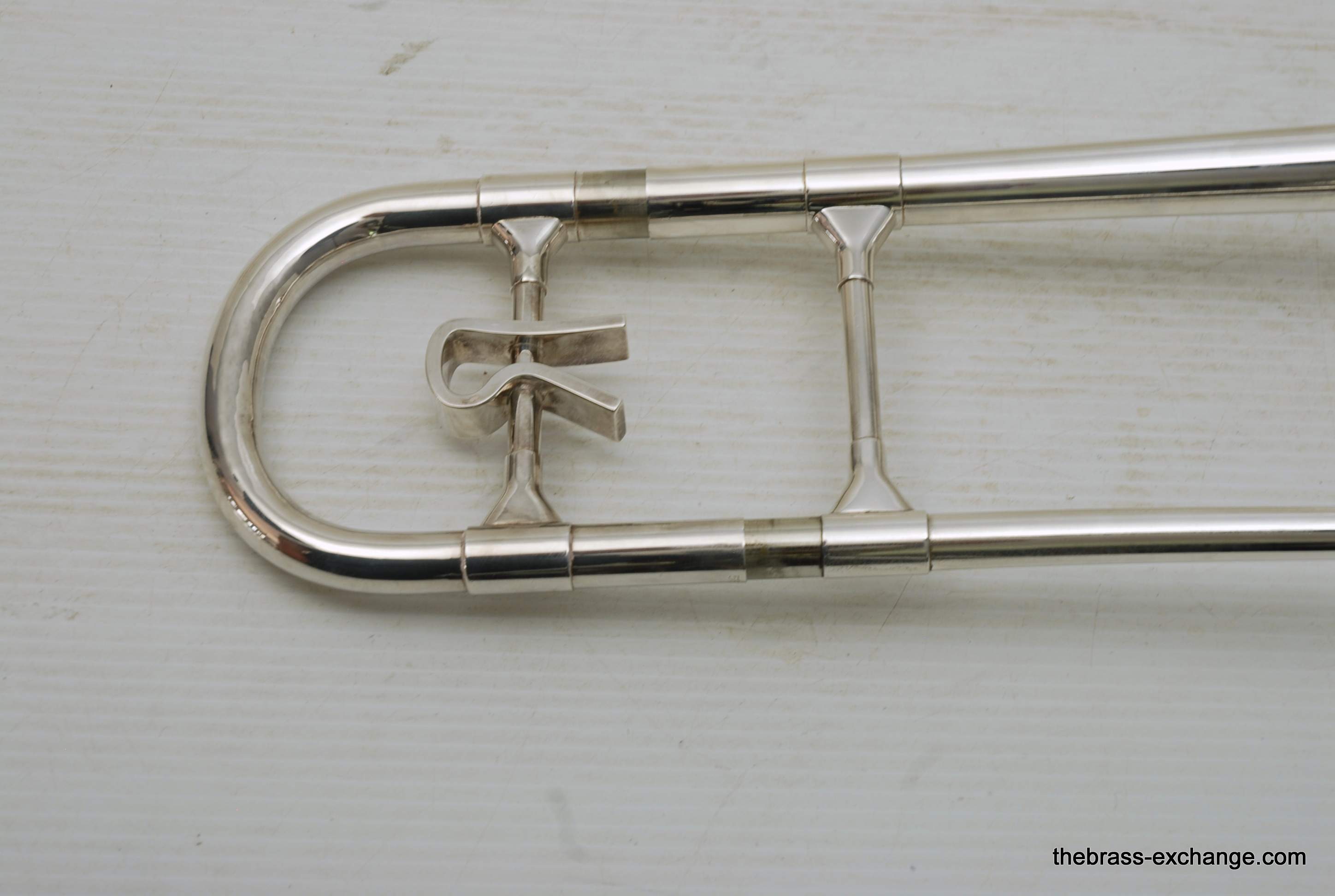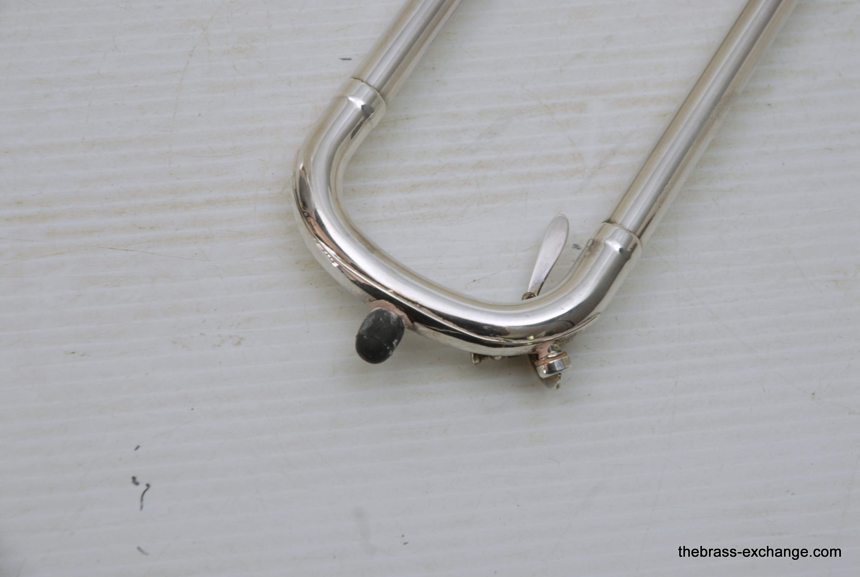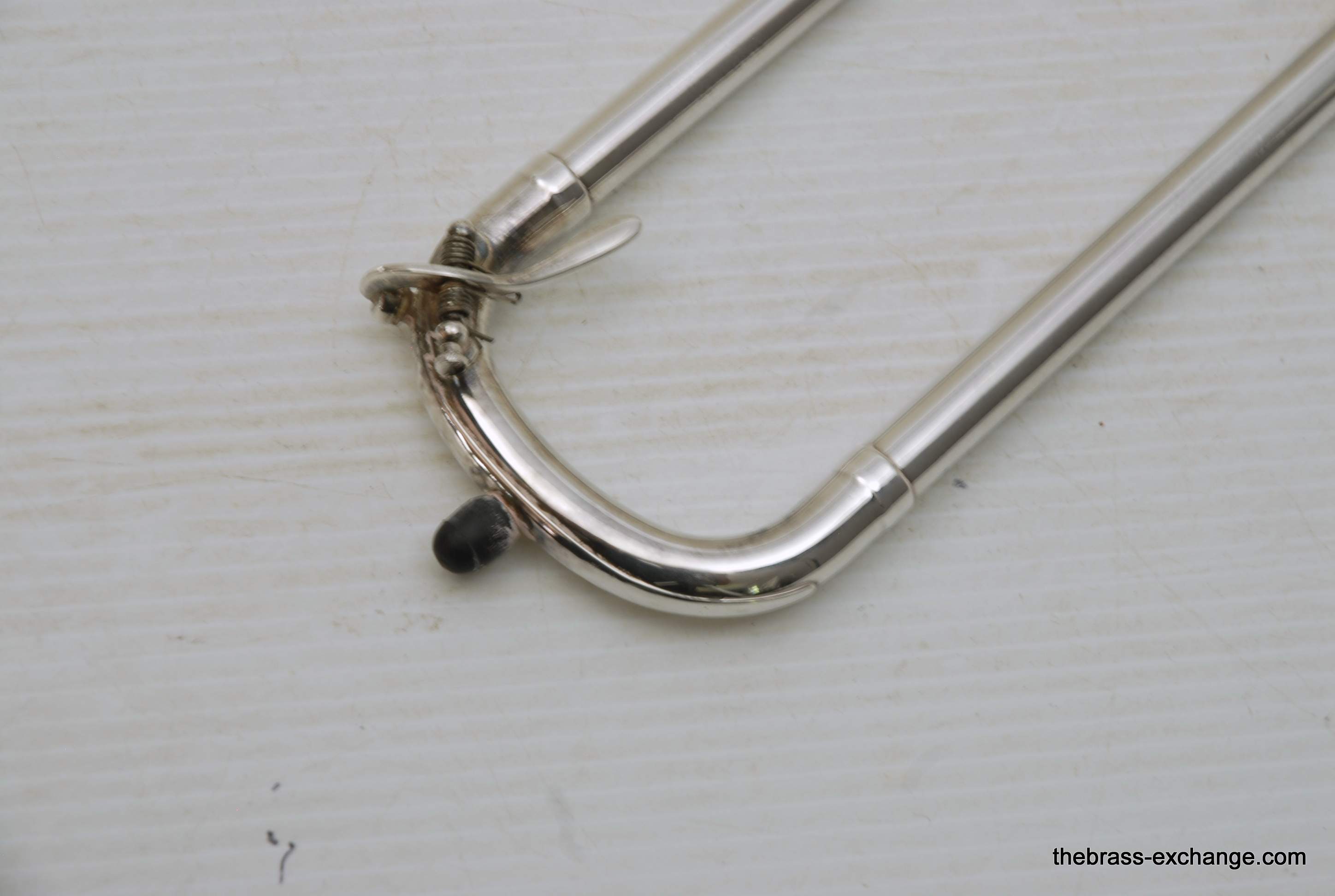 Reynolds TO-26 Medium Bore .520 Silver Plated Tenor. Has 8.5" Bell with .520 straight bore handslide and removable leadpipe. You could consider this a small big horn, or a big small horn. It plays like a medium, but a little extra width in sound with the 8.5" Bell. All original parts and silver plating. Made between 1061-1964. This is a Pro level instrument. Handslide is straight, some minor plating wear. It's a 60 year old instrument and still plays great. Would be an excellent all around tenor for band, jazz band, anywhere when and F trigger is not desired, and small bore is too small. This is a medium size horn with a gorgeous sound. Has had full shop service and is gig ready. Original case included. In-stock for immediate delivery.
