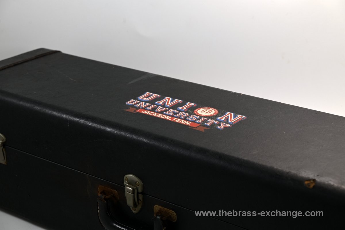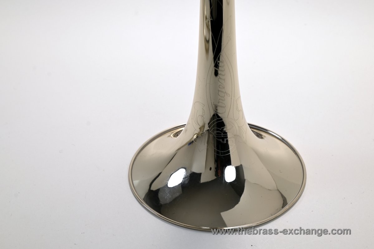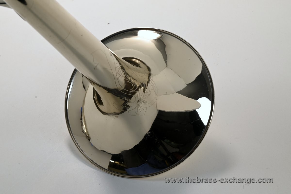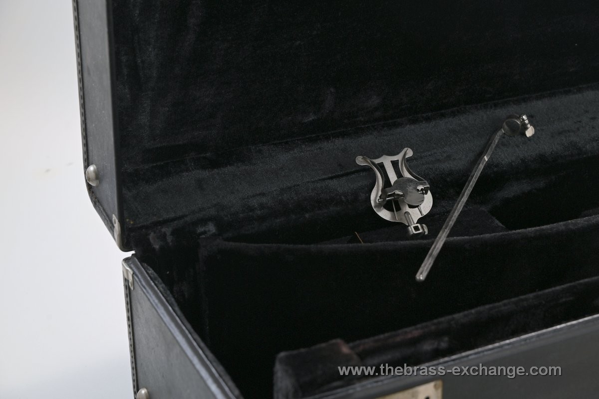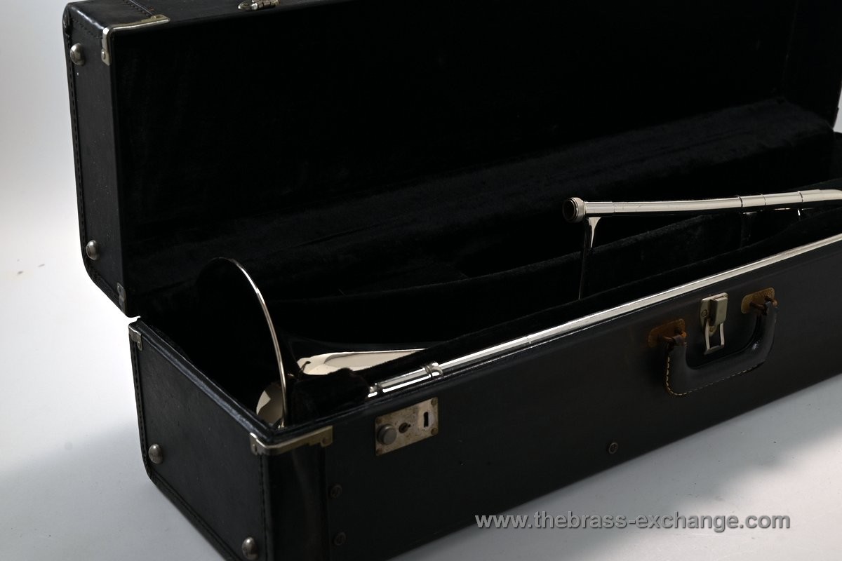 The horn is in exceptional condition, with no history of major damage or repair. The lacquered finish shows only minimal signs of use and presents as close to mint as you're likely to find on a horn of this vintage. The handslide is excellent, with no inner slide plating defects — a rare feature on instruments of this age. Our shop has performed full service including a chemical bath, once-over, and precision slide setup. The result is a smooth, responsive, and highly playable horn.
