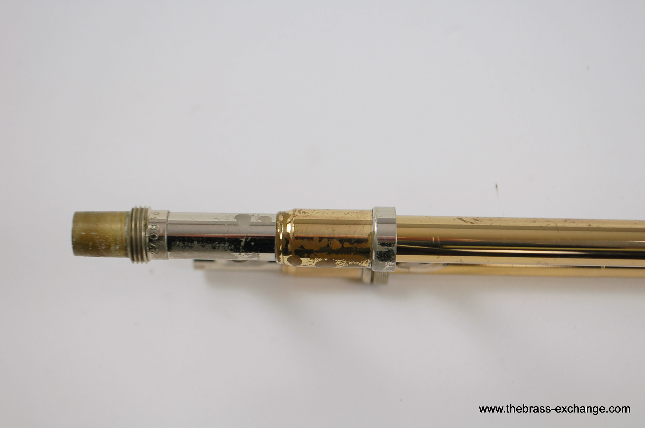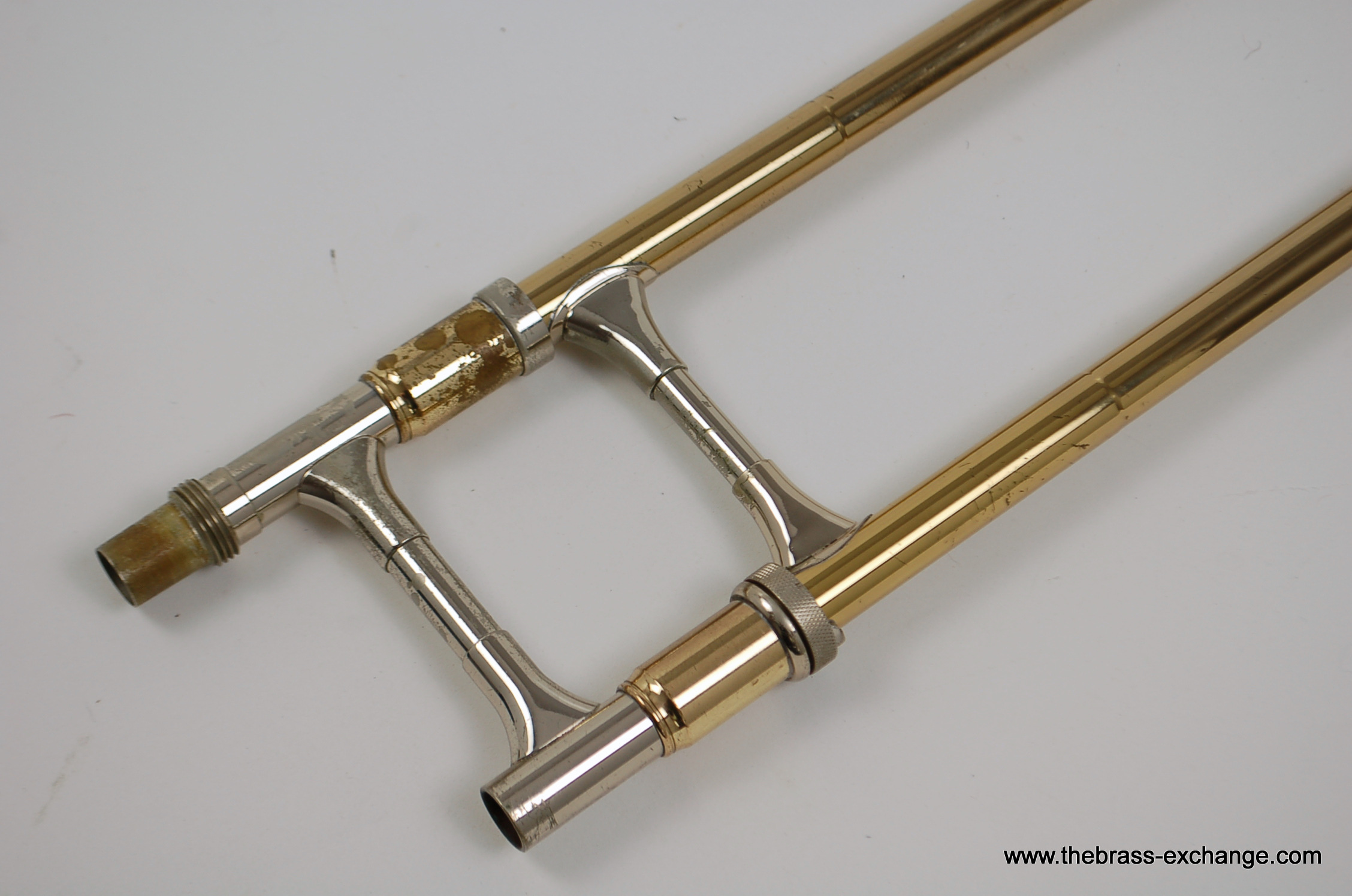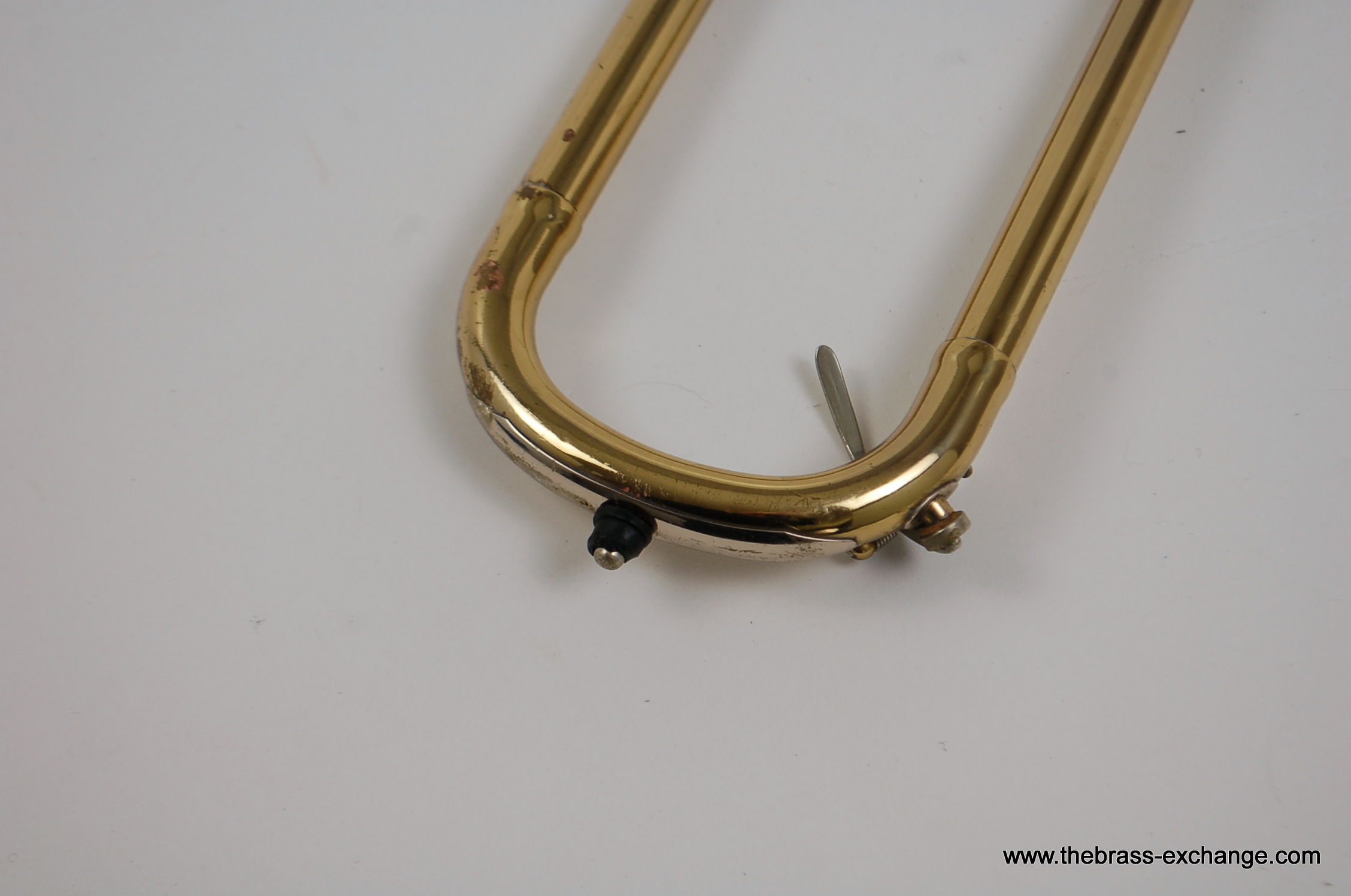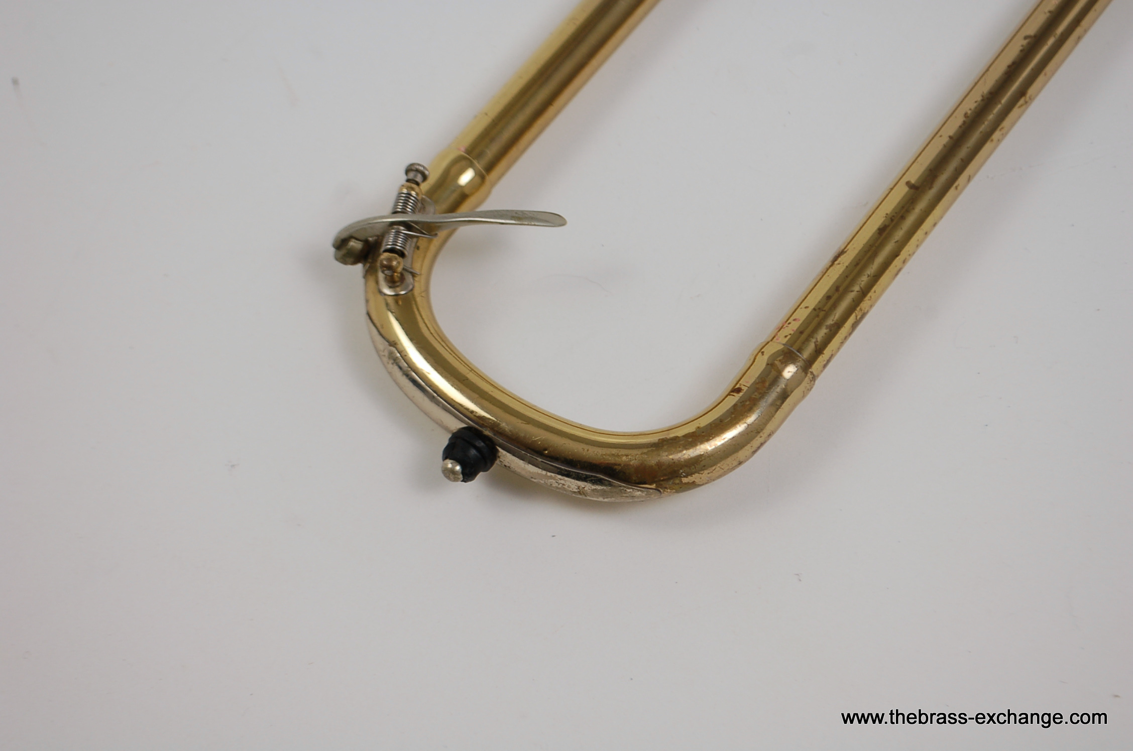 The handslide is straight, well-aligned, and fully playable as-is, with no inner slide tube plating wear. It includes first-position springs similar to vintage Conn slides, and the overall slide width is comparable to classic Conn bass slides — comfortable in the hands and not overly wide like many modern bass trombone slides.