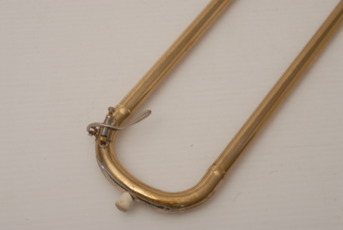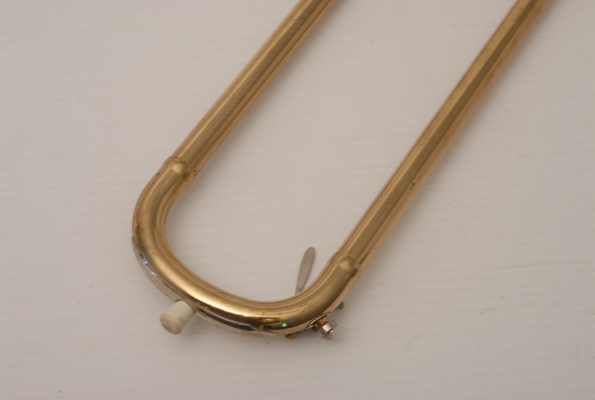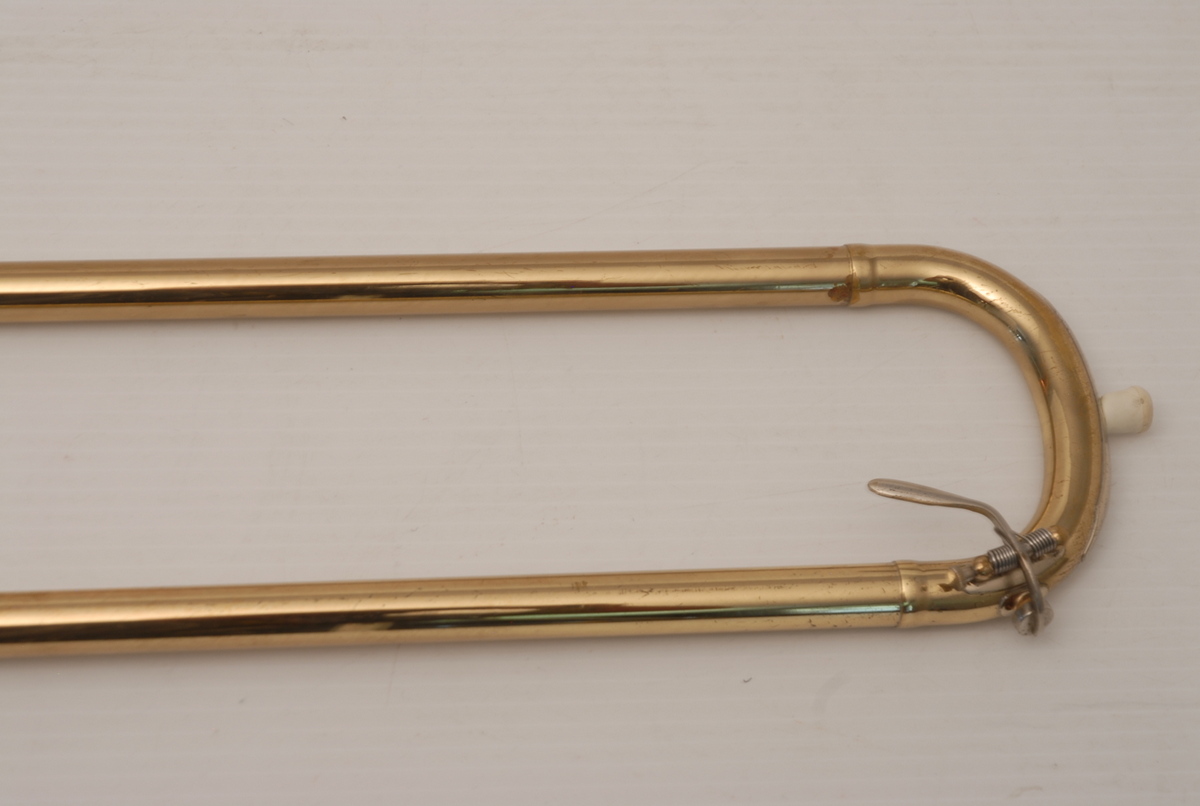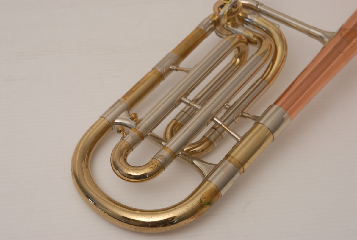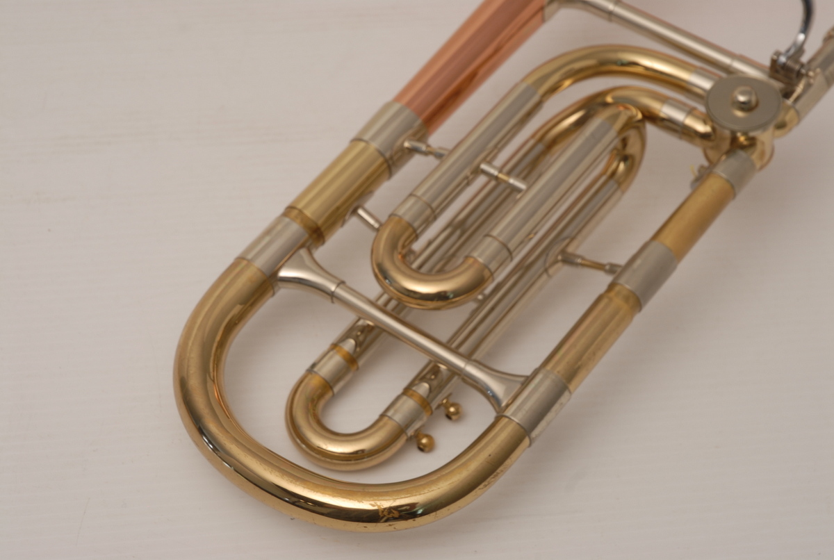 Reynolds Contempora Bass Tromobone made in the 1960's.  This a very clean single trigger .565 bass trombone with single rotor and 10" Bronze Bell.  No service needed to improve playability.  No dents or dings.  Some lacquer wear.  Handslide is very good, this model did not have  a slide lock.  Would make an excellent first bass for any player looking to use as a practice tool (tenor guys looking to open their low register) and of course for actual use in any ensemble.  Has a big splashy bottom end and plays easily.  Comes with a non-orignal case. Â