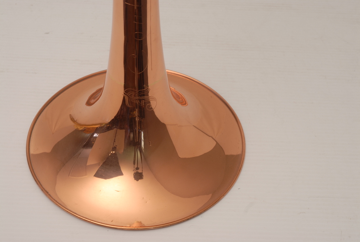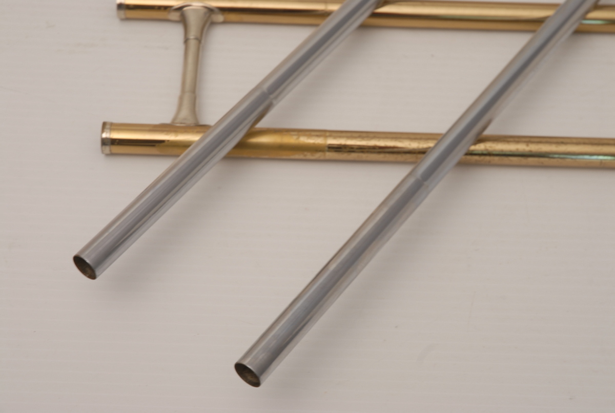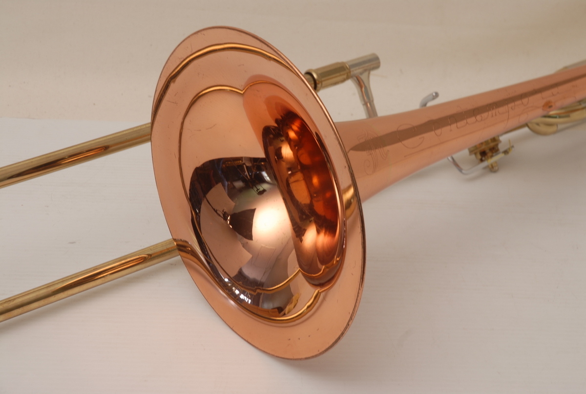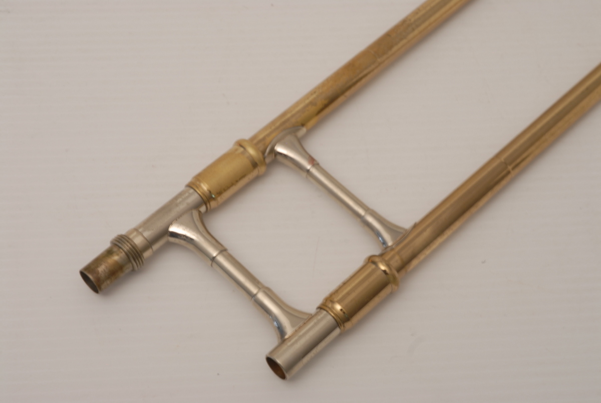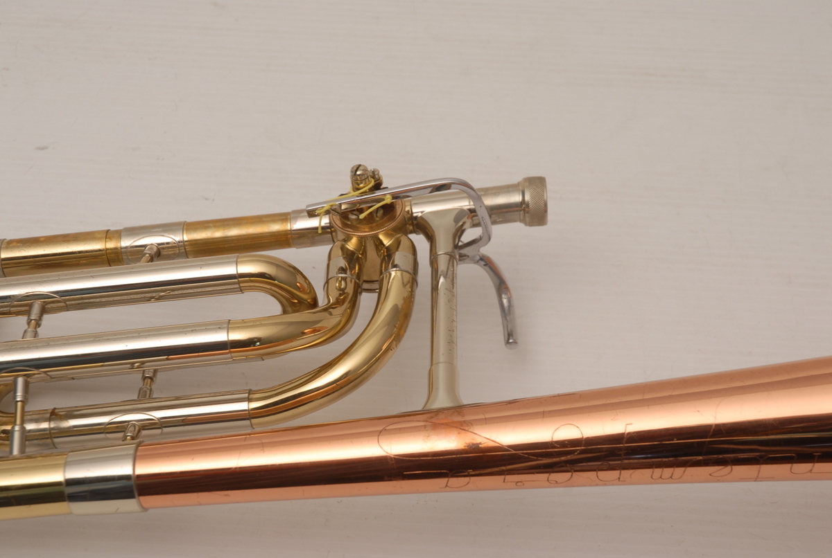 Reynolds Contempora Bass Tromobone made in the 1960's.  This a very clean single trigger .565 bass trombone with single rotor and 10" Bronze Bell.  No service needed to improve playability.  No dents or dings.  Some lacquer wear.  Handslide is very good, this model did not have  a slide lock.  Would make an excellent first bass for any player looking to use as a practice tool (tenor guys looking to open their low register) and of course for actual use in any ensemble.  Has a big splashy bottom end and plays easily.  Comes with a non-orignal case. Â