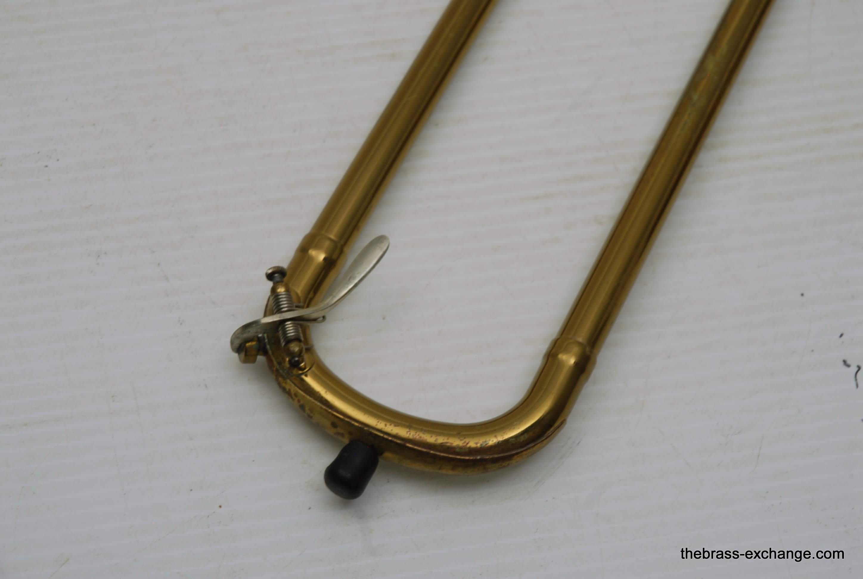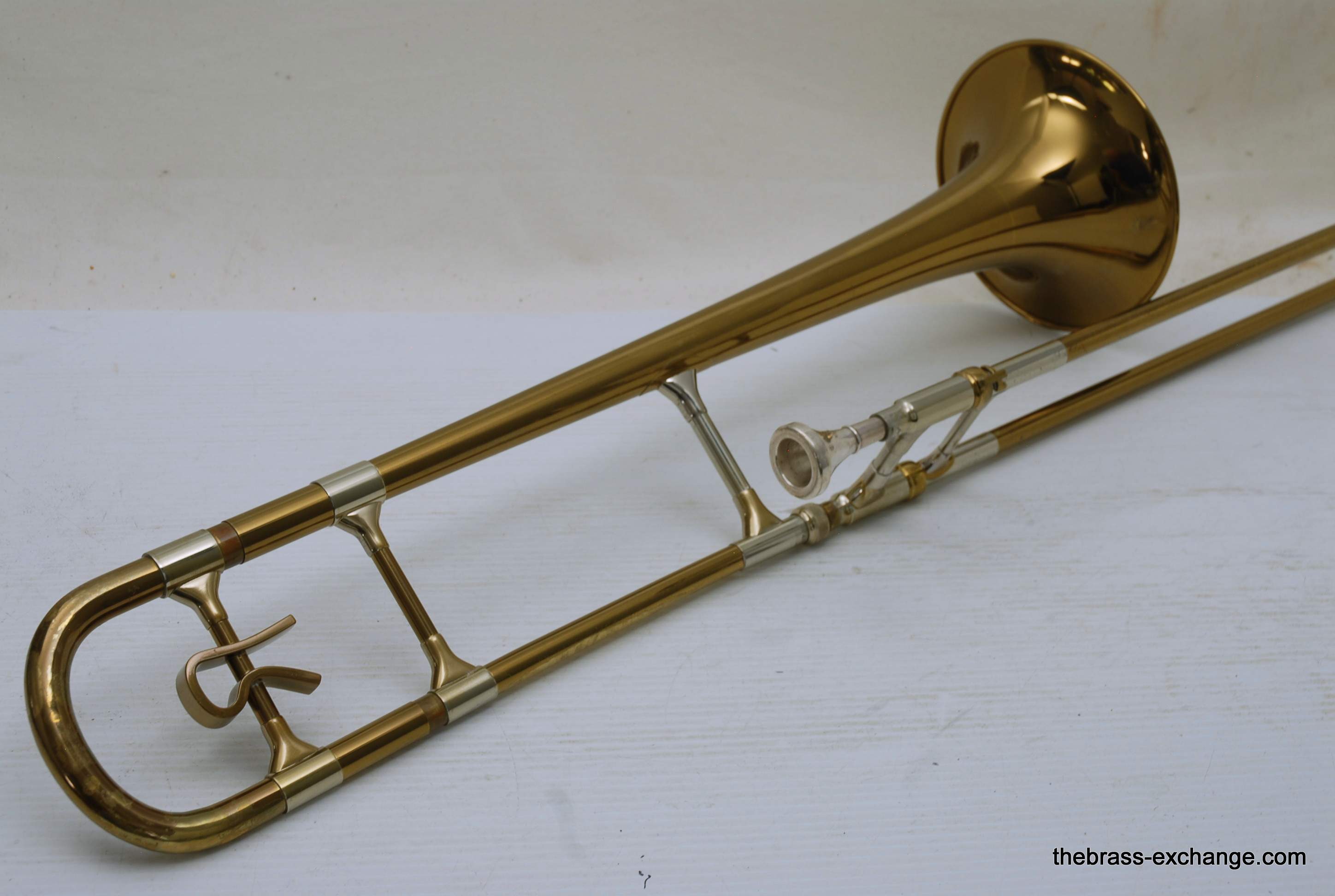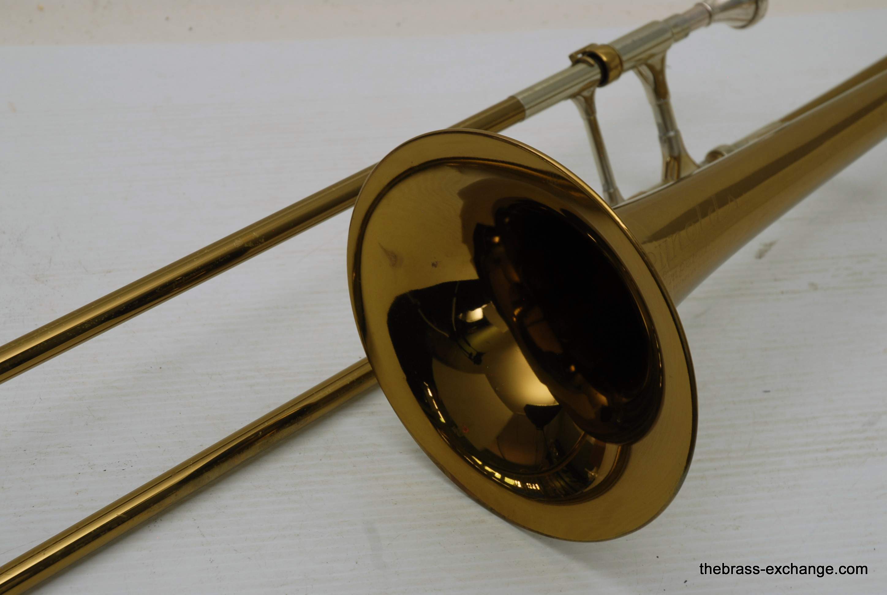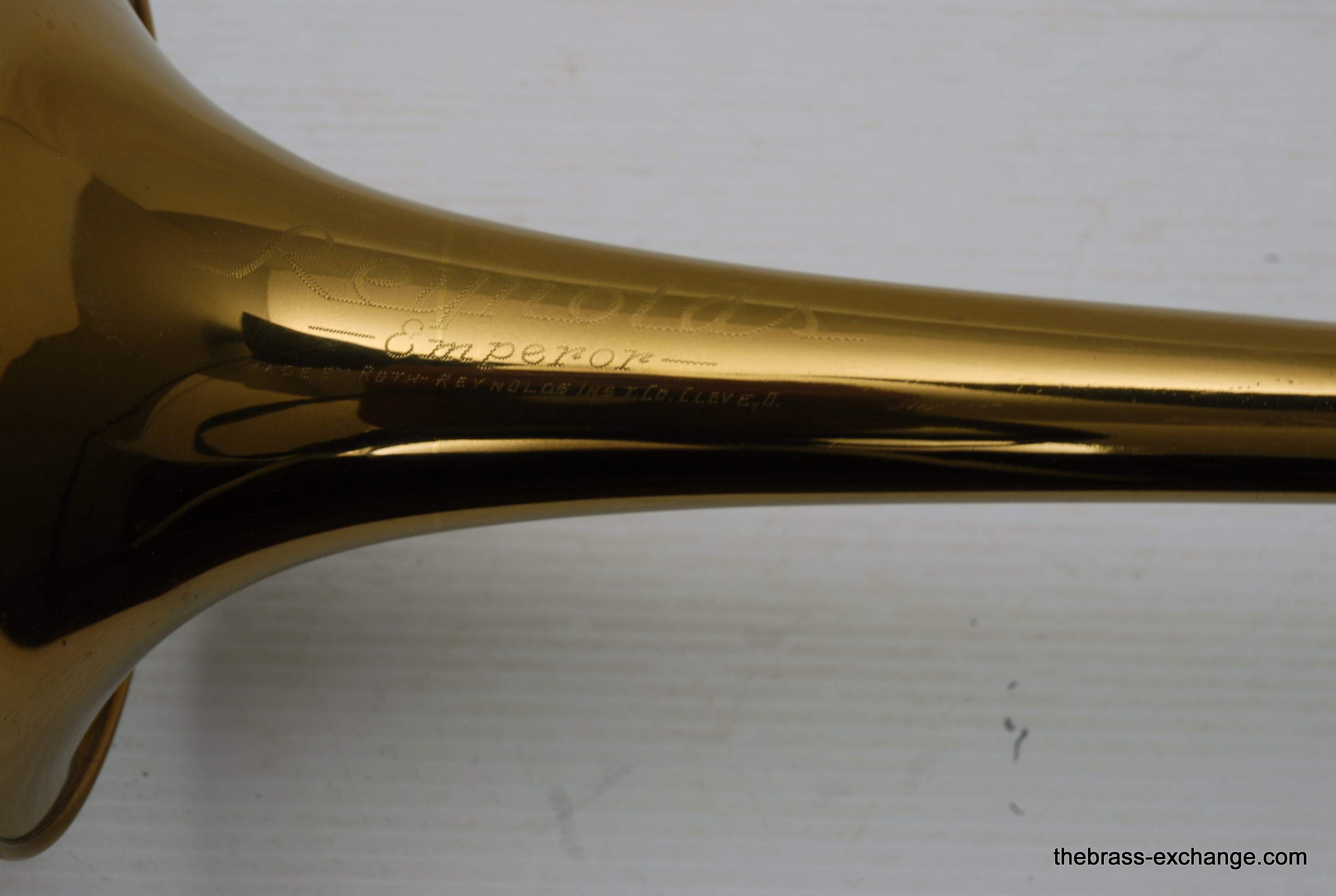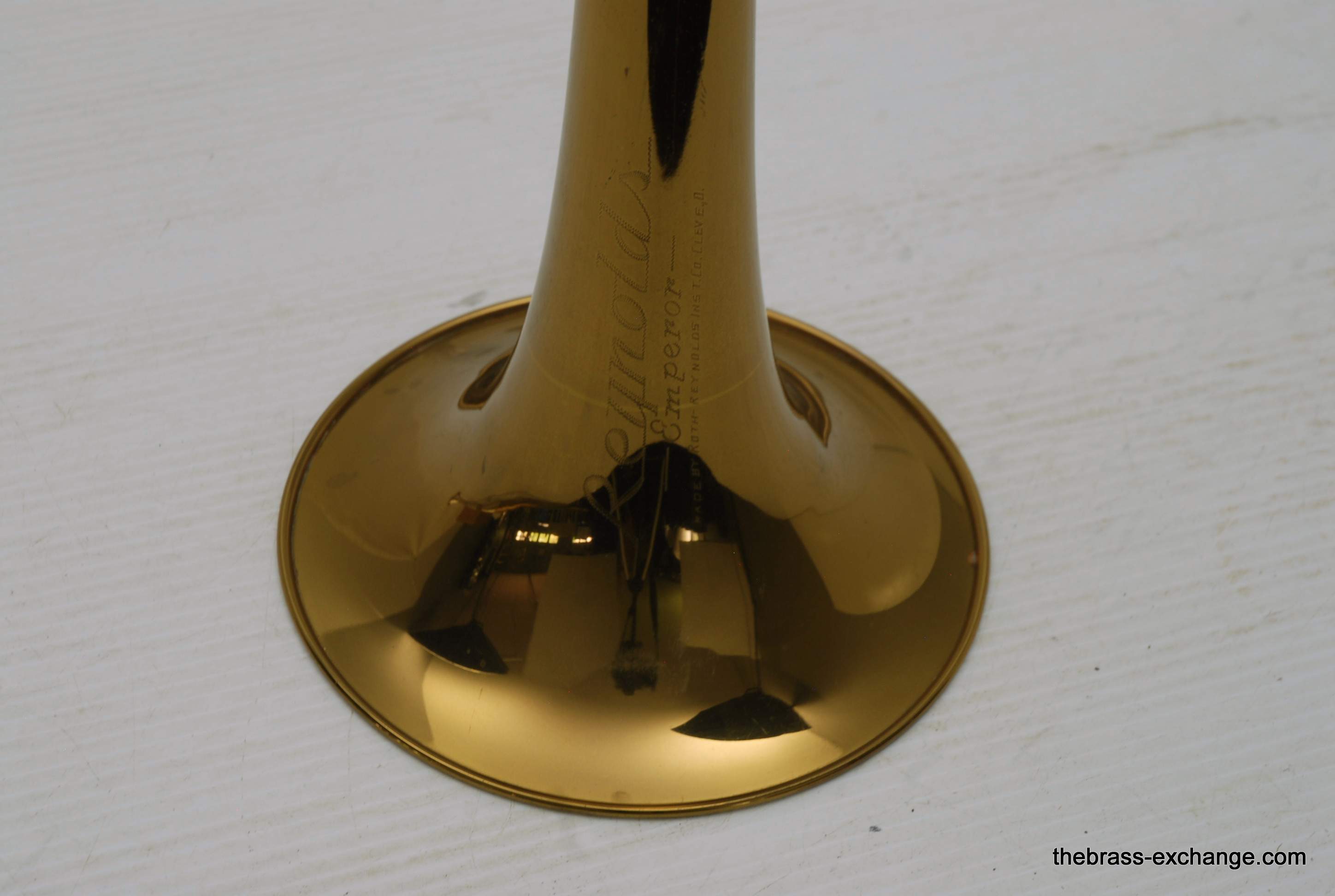 Reynolds Emperor Small Bore Vintage Tromobne. Has 7.5" Yellow Brass Bell, Dark Honey colored lacquer. Handlside is .500 bore brass. This is all original parts and lacquer. Original case and mouthpiece. A serious closet find which has been kept by a collector for many years. This horn has never been damaged and plays fantastic. The slide is true and without defect. Original case also in excellent condition. In stock for immediate delivery.