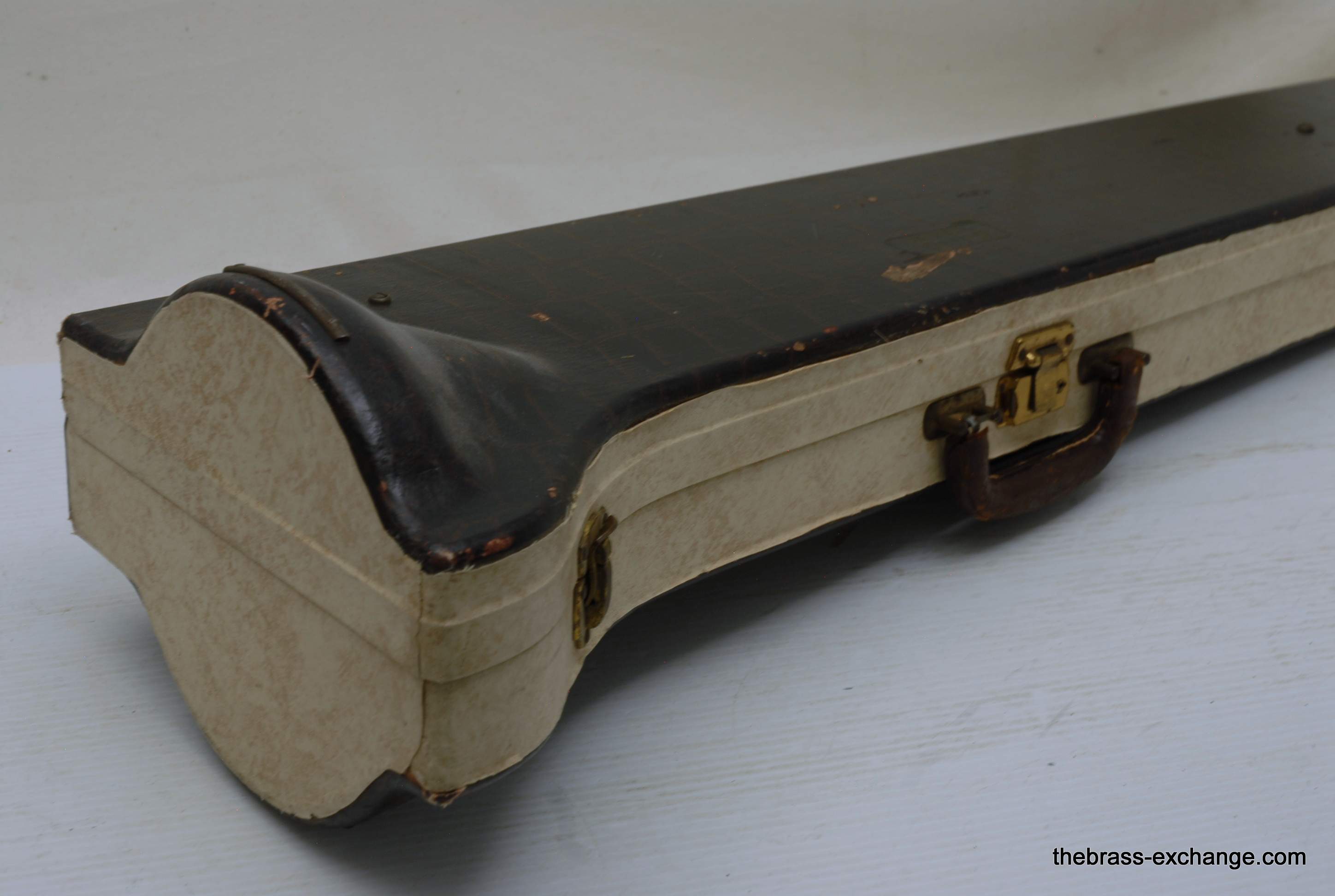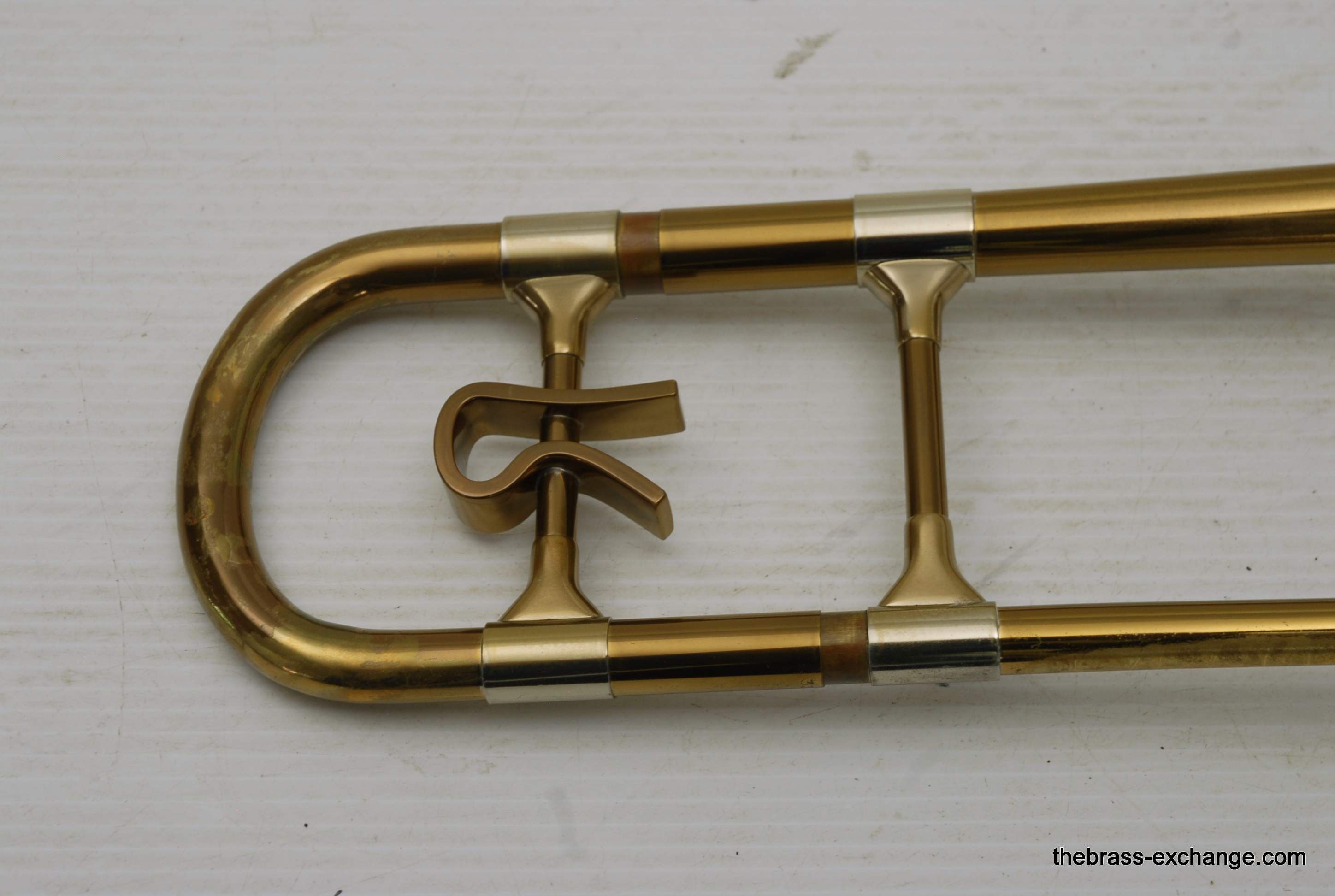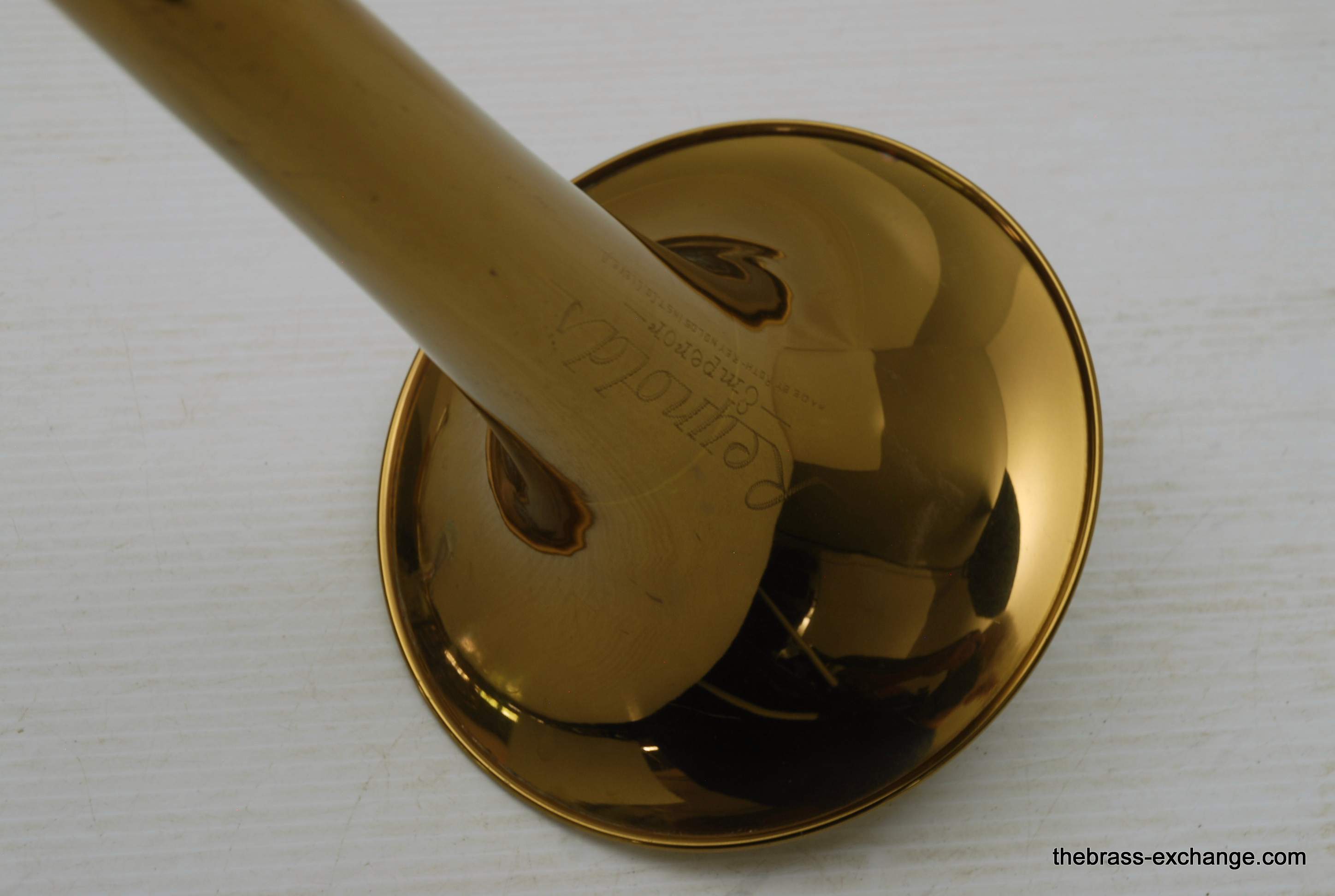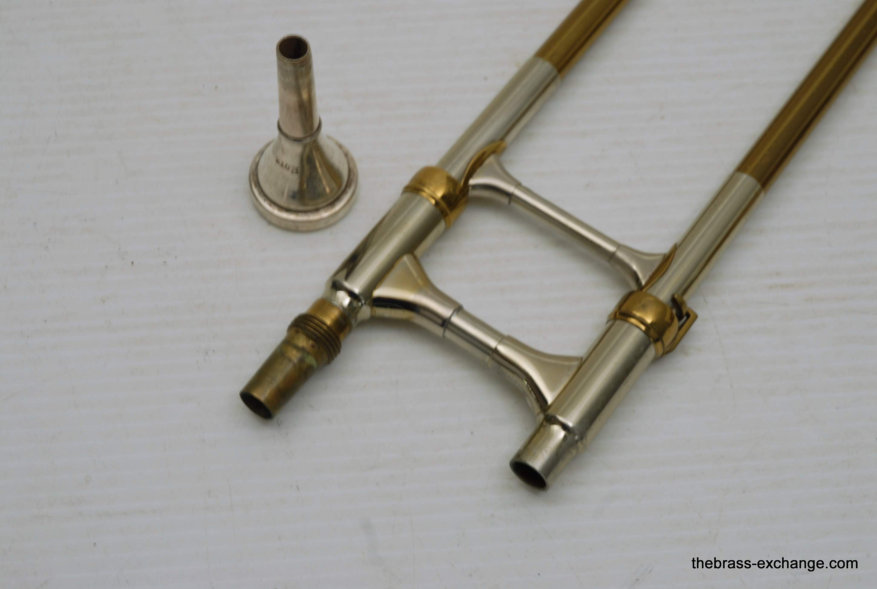 Reynolds Emperor Small Bore Vintage Tromobne. Has 7.5" Yellow Brass Bell, Dark Honey colored lacquer. Handlside is .500 bore brass. This is all original parts and lacquer. Original case and mouthpiece. A serious closet find which has been kept by a collector for many years. This horn has never been damaged and plays fantastic. The slide is true and without defect. Original case also in excellent condition. In stock for immediate delivery.