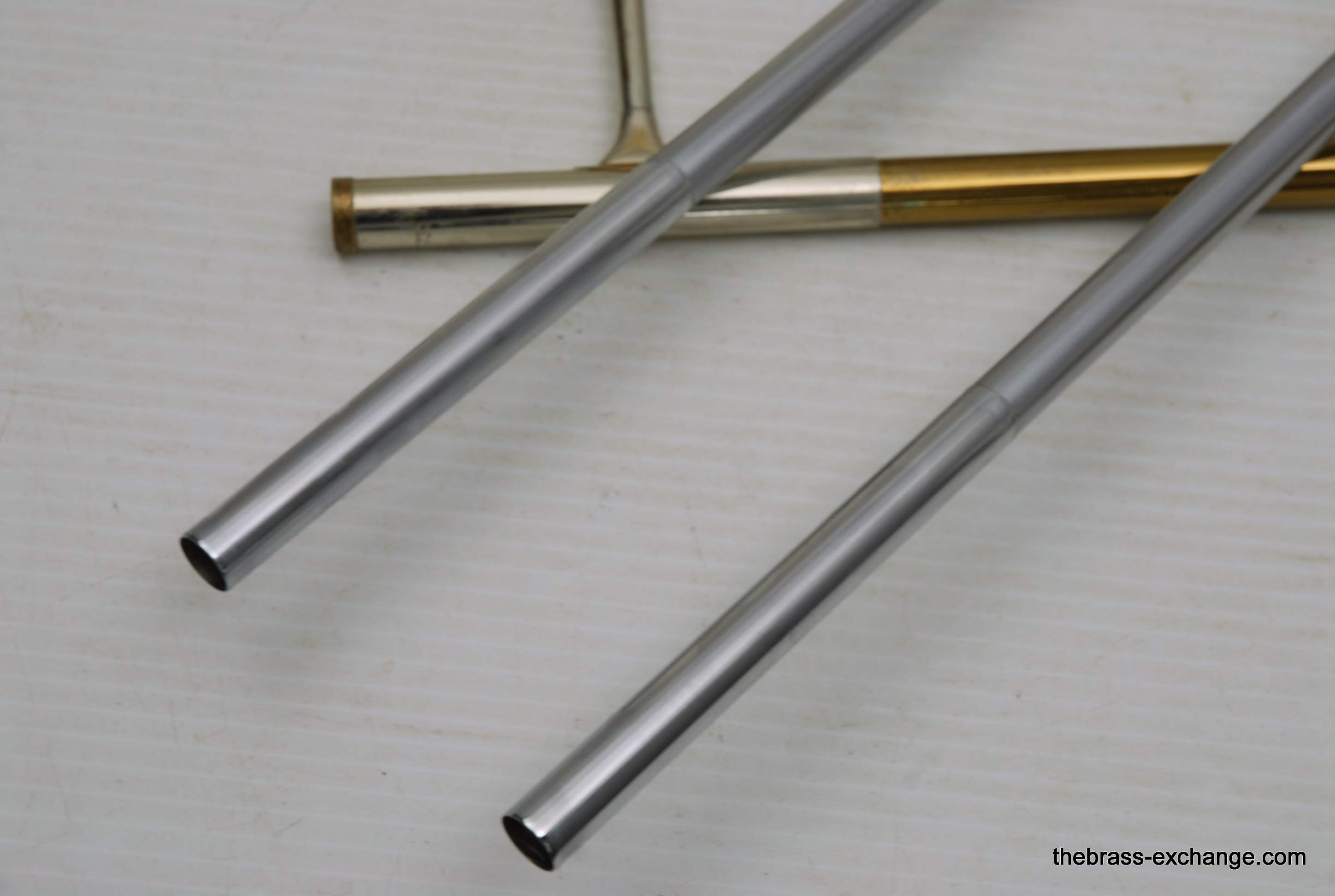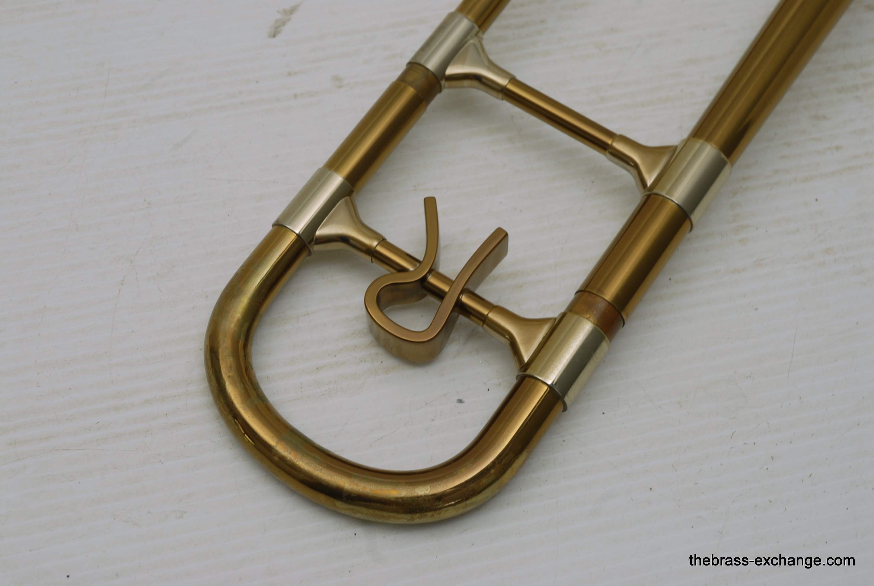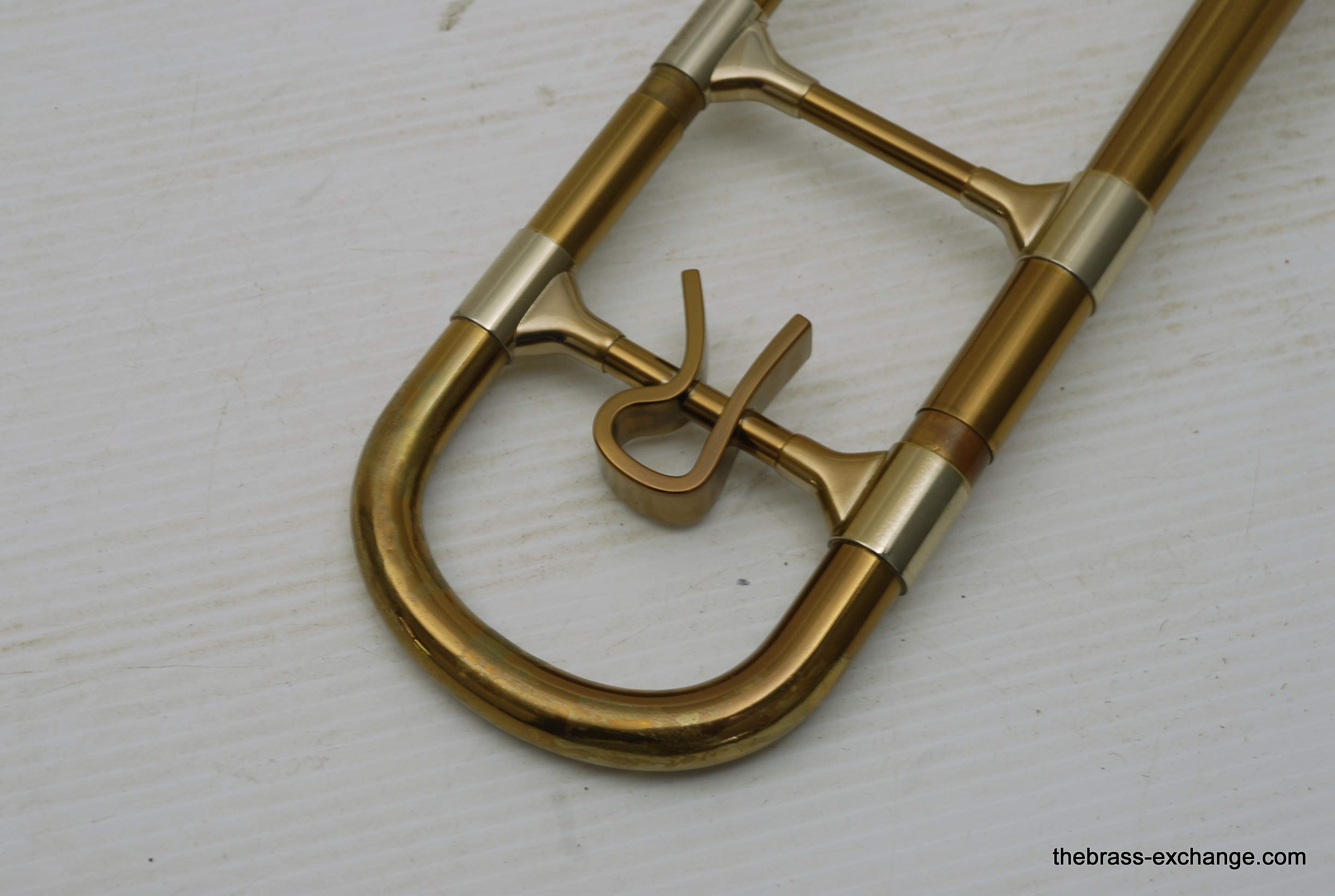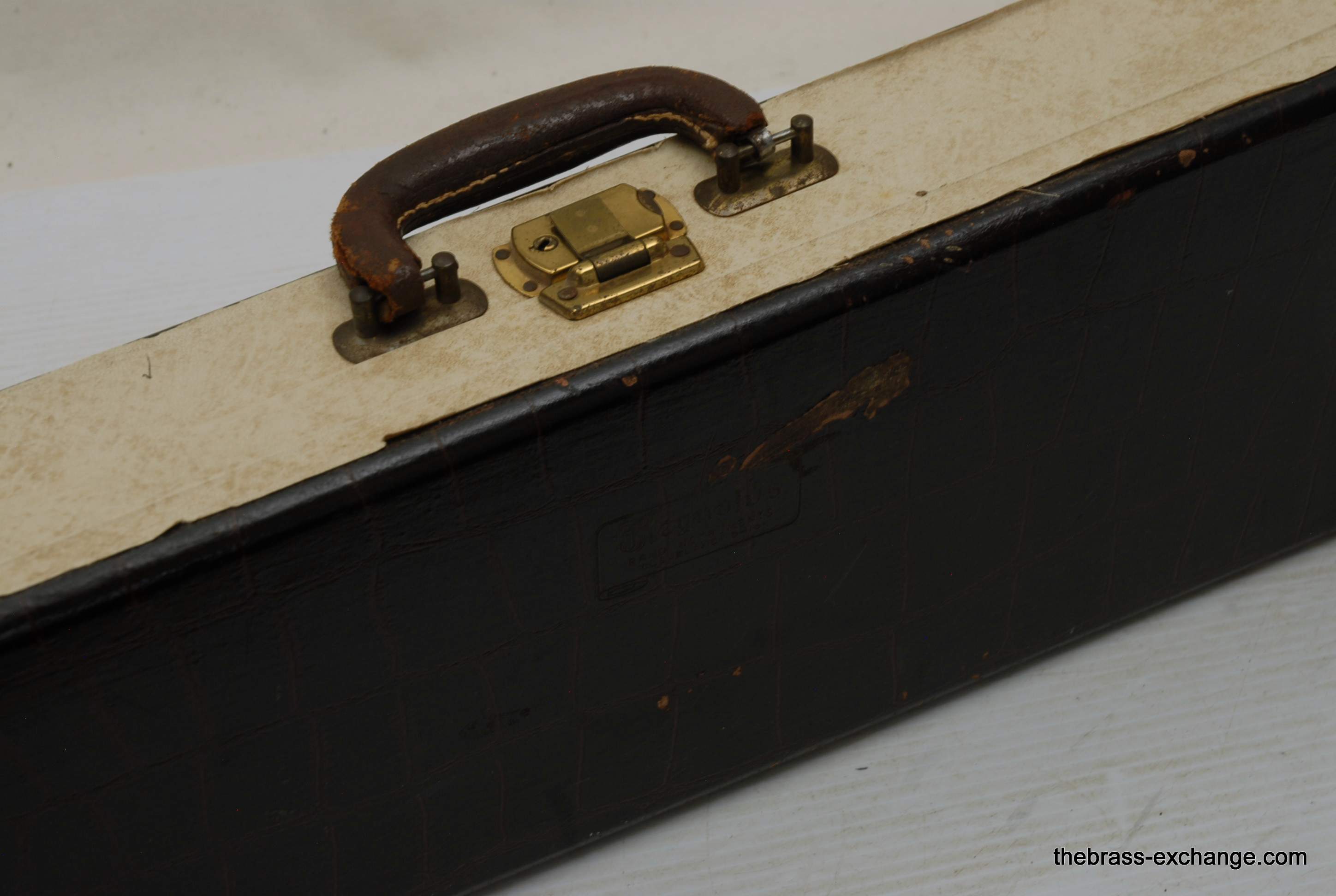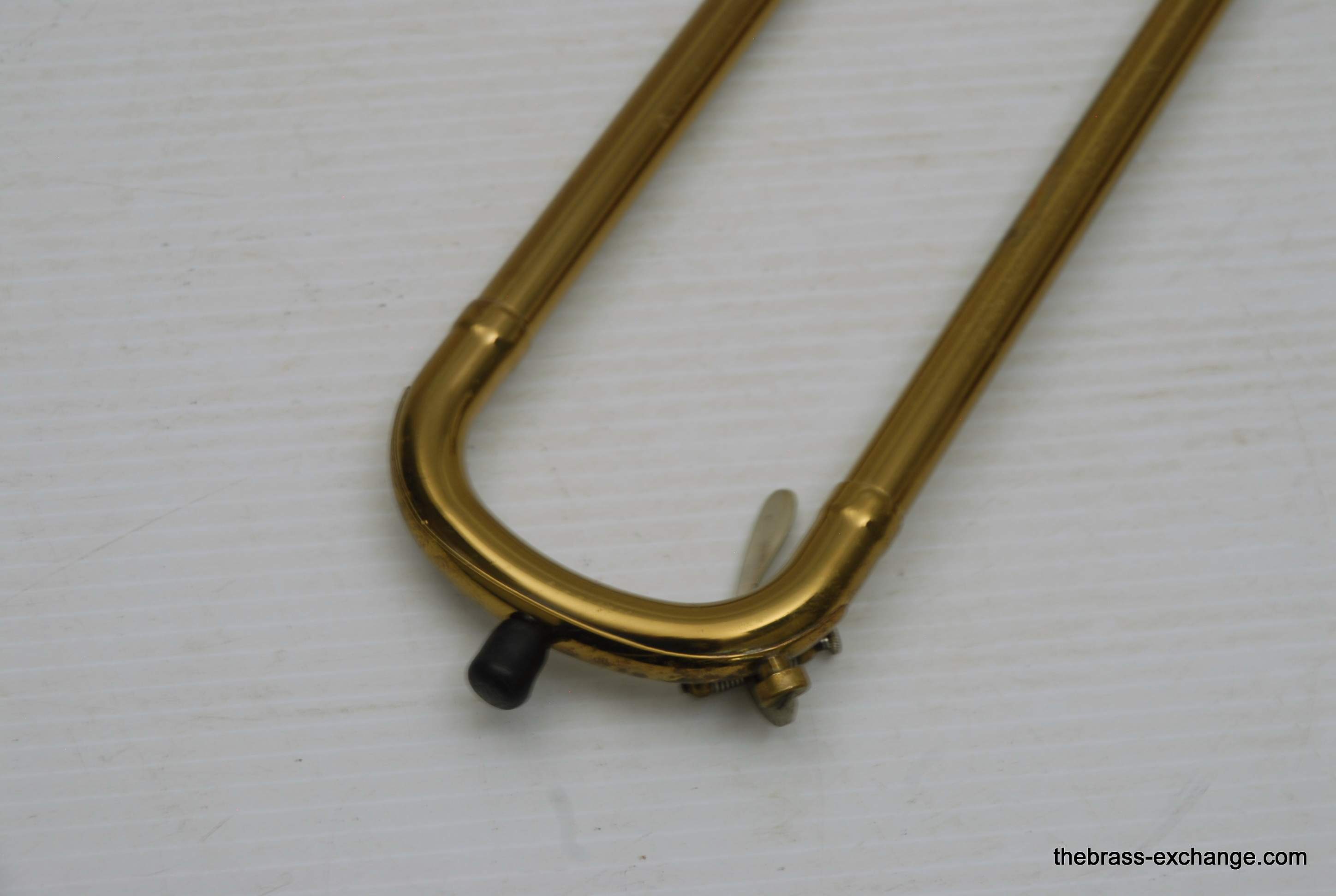 Reynolds Emperor Small Bore Vintage Tromobne. Has 7.5" Yellow Brass Bell, Dark Honey colored lacquer. Handlside is .500 bore brass. This is all original parts and lacquer. Original case and mouthpiece. A serious closet find which has been kept by a collector for many years. This horn has never been damaged and plays fantastic. The slide is true and without defect. Original case also in excellent condition. In stock for immediate delivery.