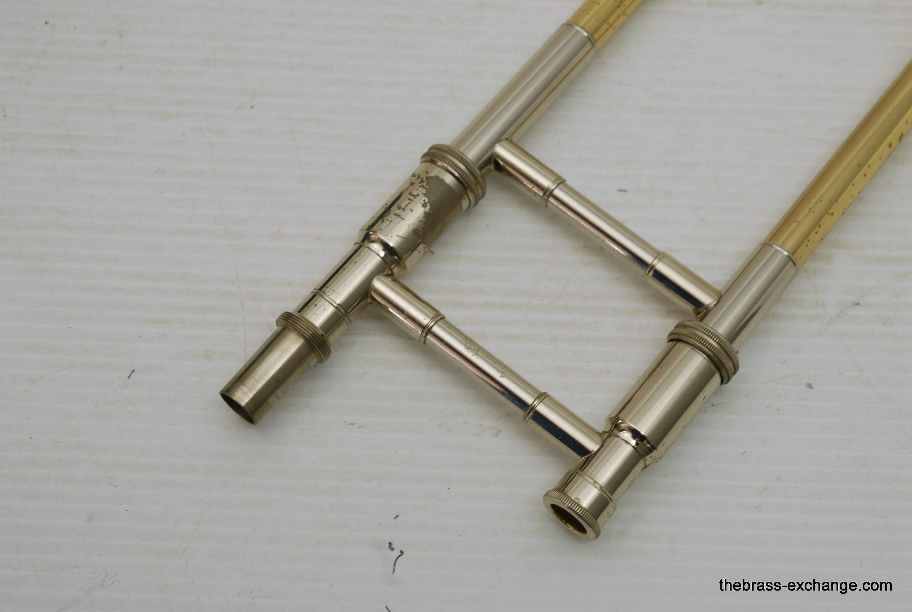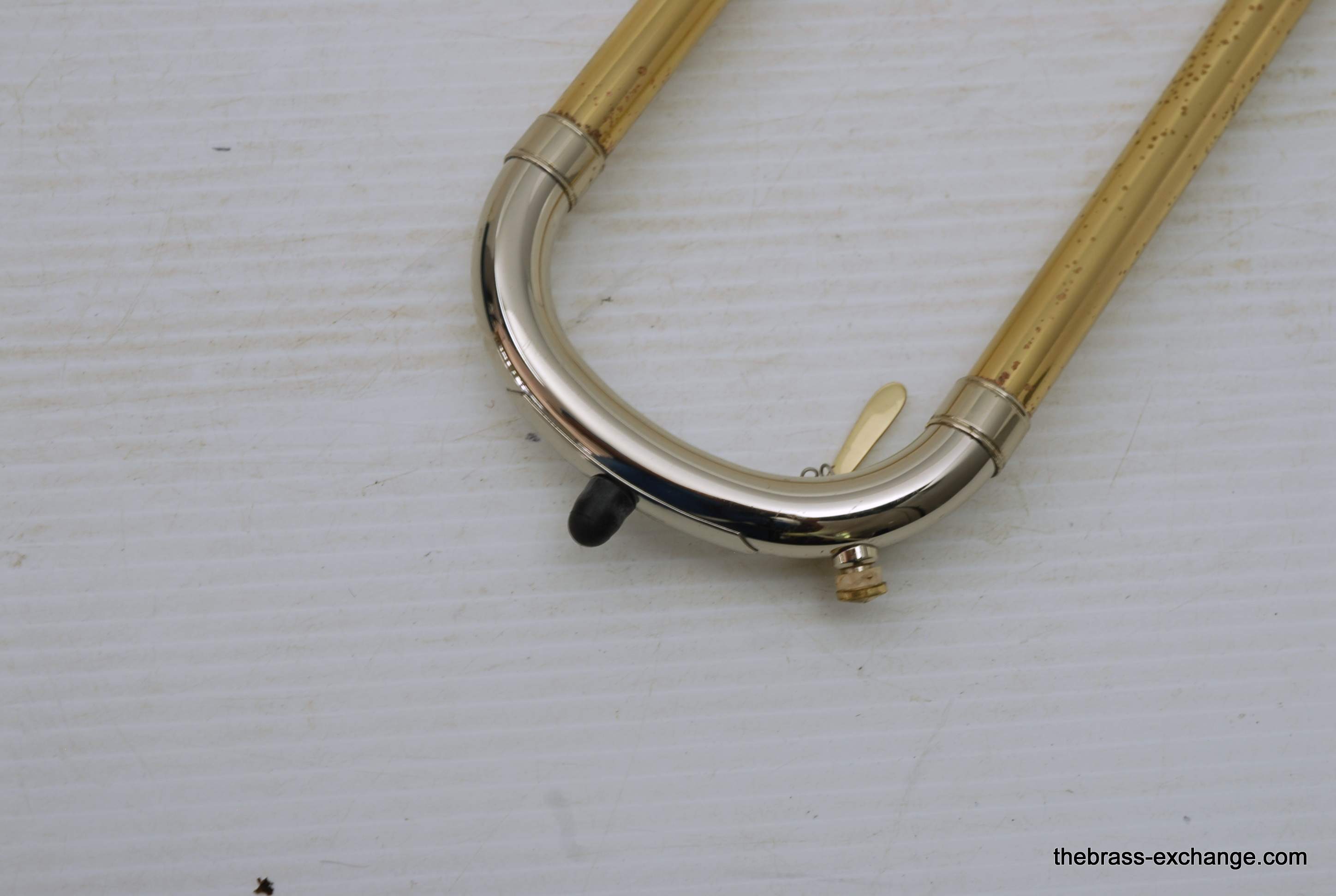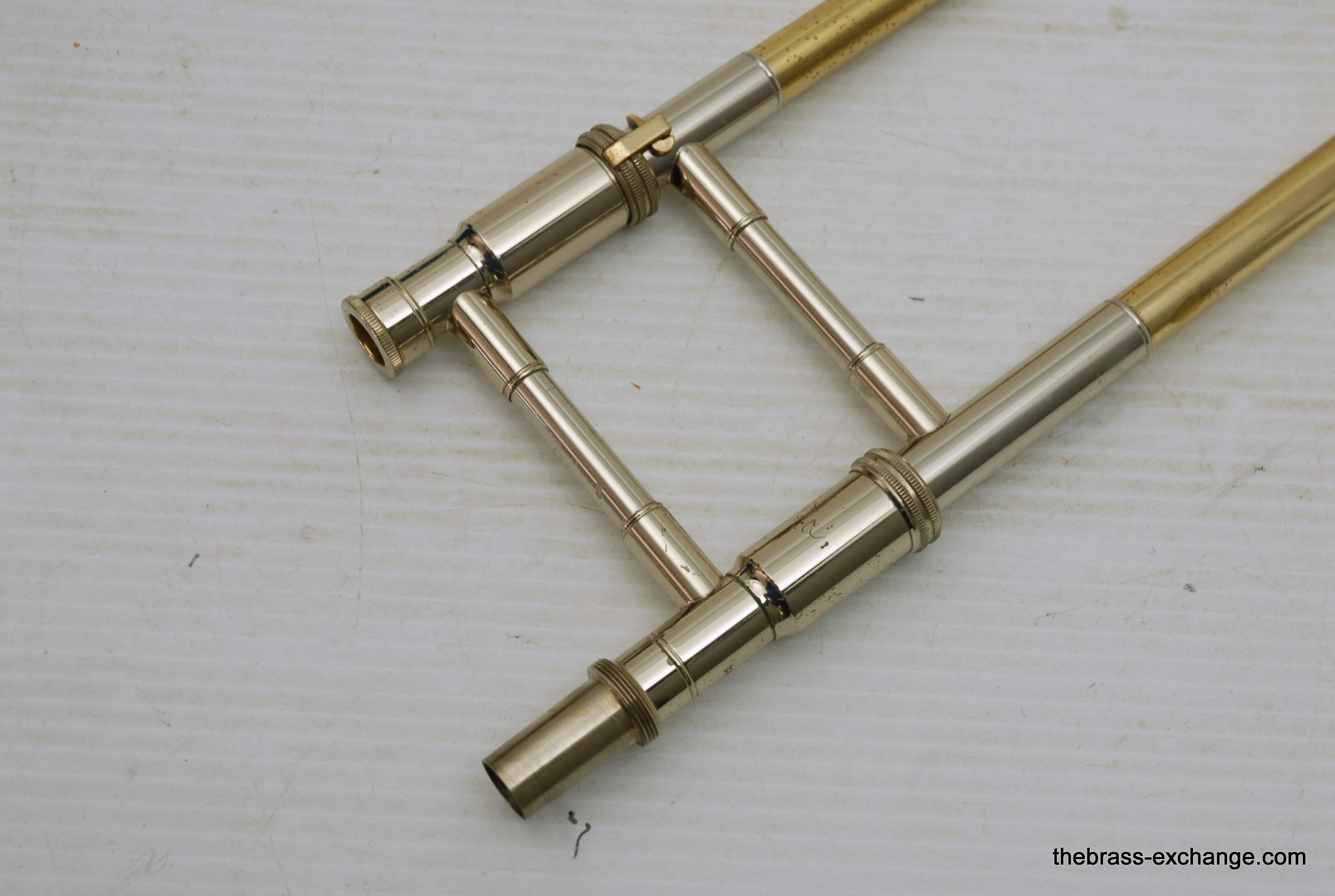 S.E. Shires Custom Series Bass Trombone Handslide Pre Owned, Model B62.  Standard weight straight bore .562, yellow brass with nickel oversleeves, and nickel endcrook.  Is a straight slide, no previous damage, excellent tubes, no wear on inners, some lacquer wear on outers, grip areas, but not too bad.  Has had full shop service, once over and chemical bath.  Includes choice of one removable leadpipe, multiple choices available, please call or email for leadipe options.  Excludes Sterling Silver.  In-stock for immediate delivery.