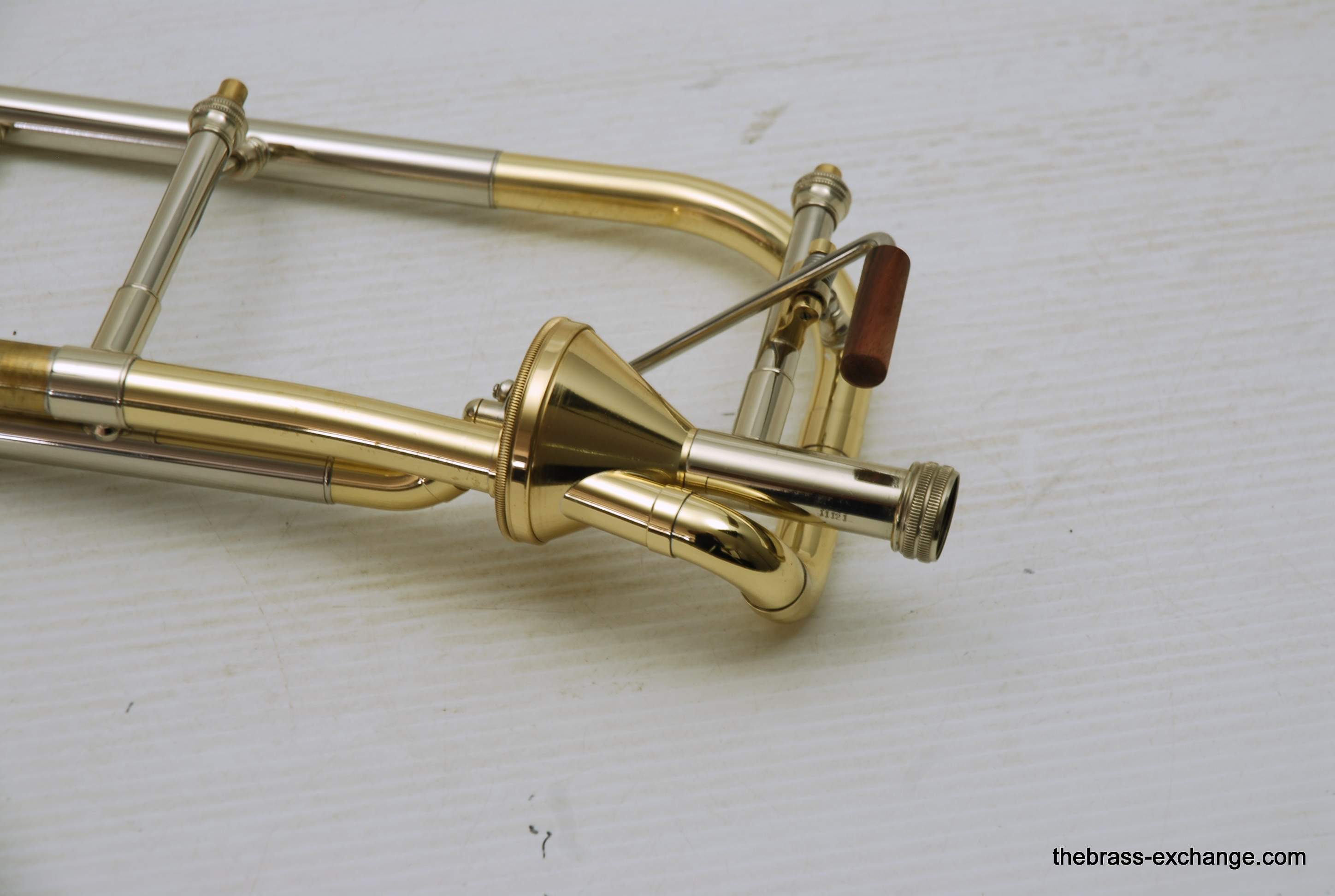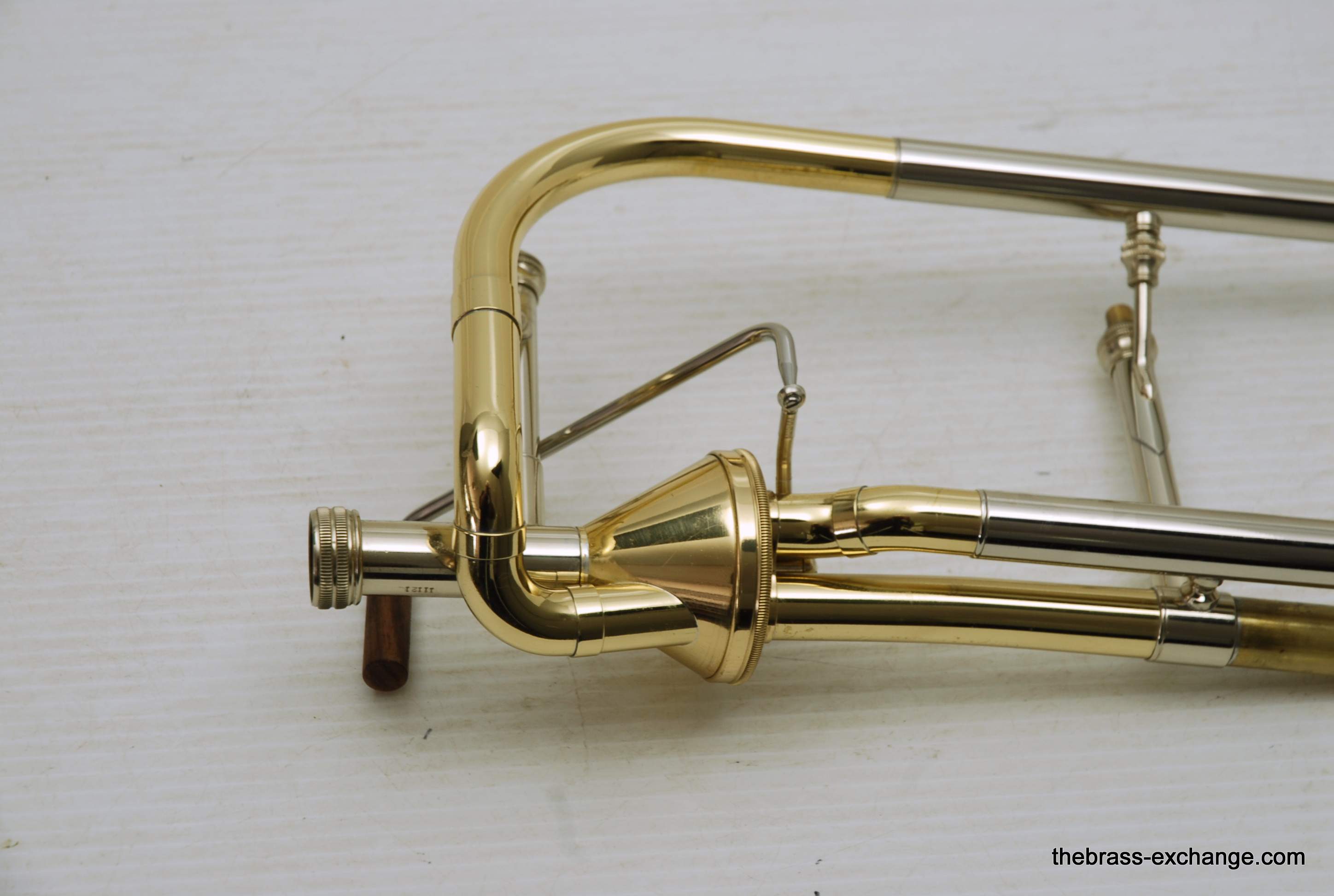 S.E. Shires Bass Trombone valve section, model axial flow.  Standard Bb/F single valve section for all Shires bass trombone components.  This one is slightly used, minimal prior use, in perfect condition. Most bass trombone players today are looking for valve sections with two valves.  Shires does not make many of these, it is custom order only.  This is an ideal valve section for any Shires bass player that is looking to play a single. It definitely feels much lighter than an inline valve section.  This one plays perfectly and is in stock for immediate delivery