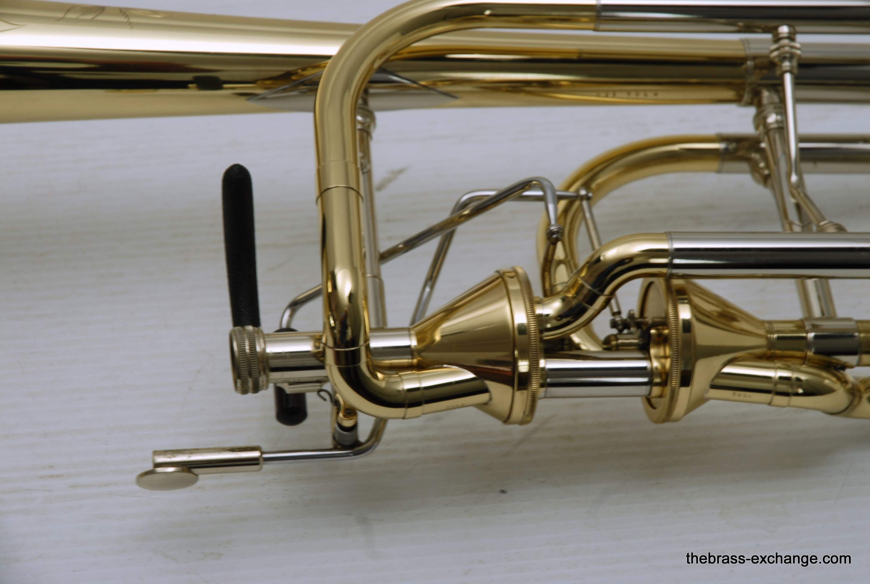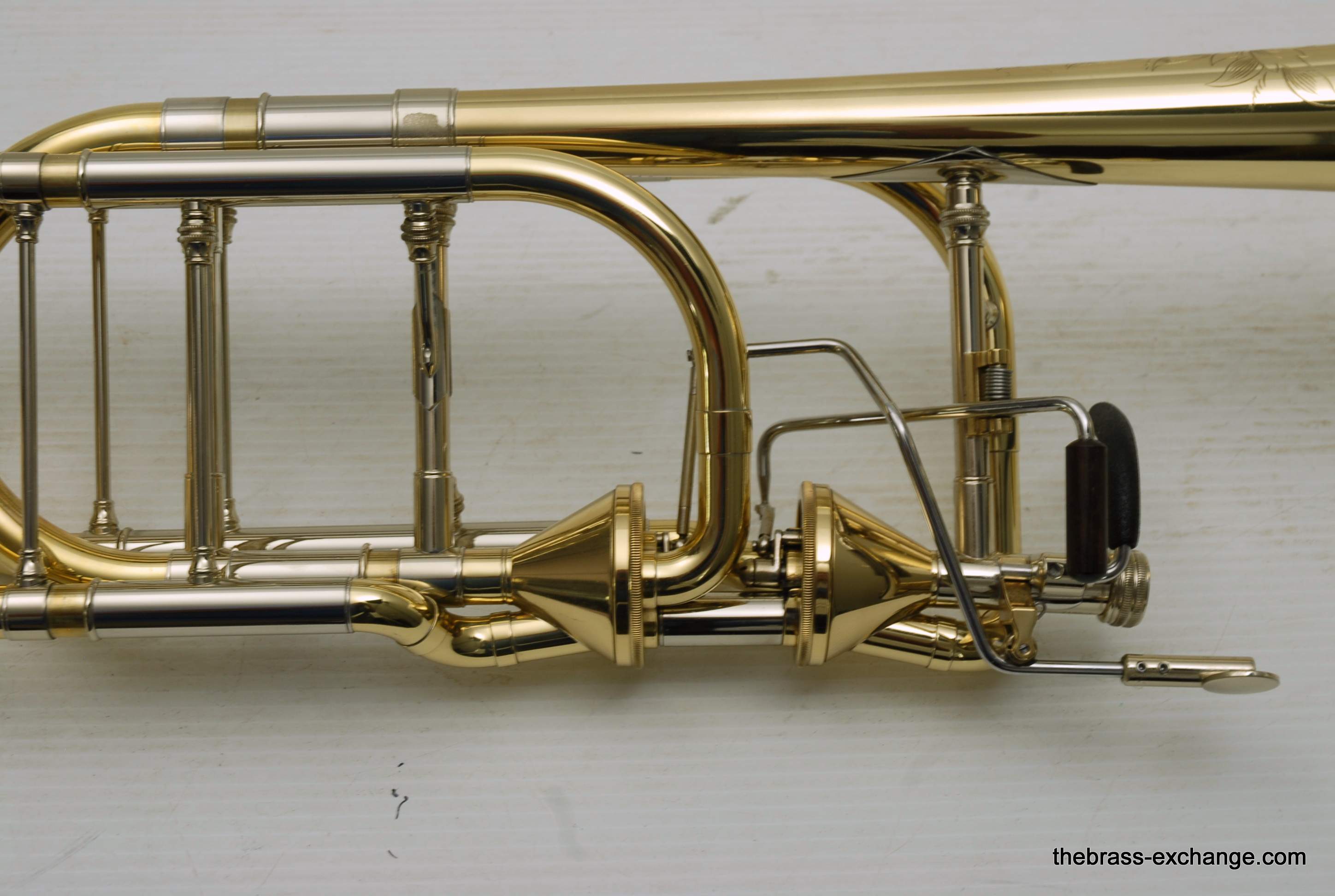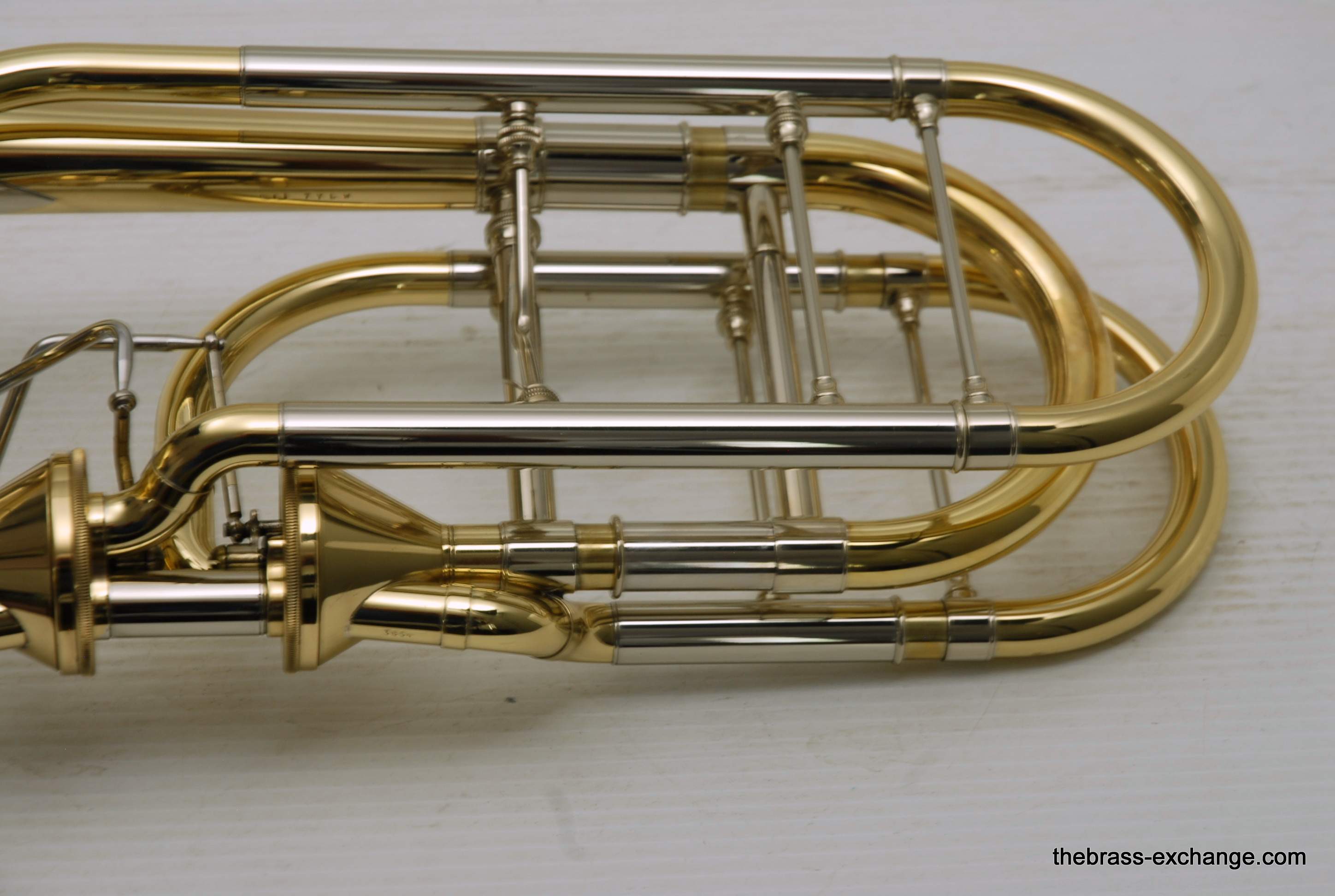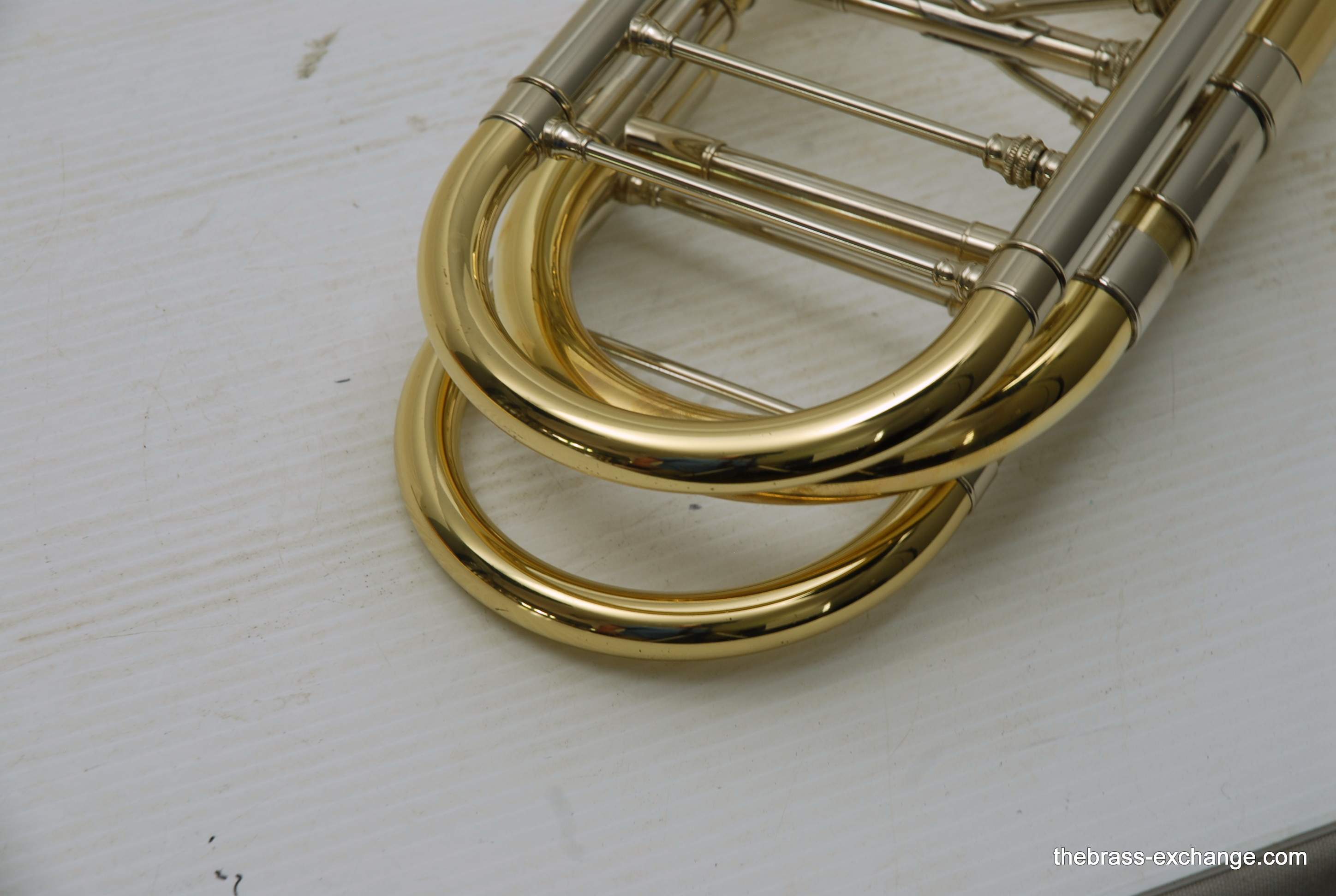 S.E. Shires Custom Bass Trombone, Made in Massachusetts. Pre-owned Axial Flow Independent Bass Bb/F/Gb/D tuning. Has TII 7YLW yellow brass lighweight with 9.5" flare, standard weight B62 bass trombone slide with one removable leadpipe. Factory intalled thumb bar, adjustable and removable. This is a fantastic conditon Bass. Never damaged or repaired. A factory new Shires bass today is in the $6500 price range with a 6-9 month wait. This one is as good as new and is available for immediate delivery. Minor lacquer wear on handslide grip areas. Otherwise a near perfect condition instrument. We are an authorized S.E. Shires dealer and know that this one is up to par. No defects, or flaws, it is not a B-stock, just slighltly used, pre-owned, single owner. Comes with a premium Italian made Marco Magi NN Series Bass Case, Super durable, protection, and very comfortable back pack straps. It is a light case, about the same as Marcus Bonna. However, we have a new Shires Marcus Bonna in Stock and will substitute for an an addtiional $300, or if you don't want a case at all, take off $250 from the listing price. Please call to order.