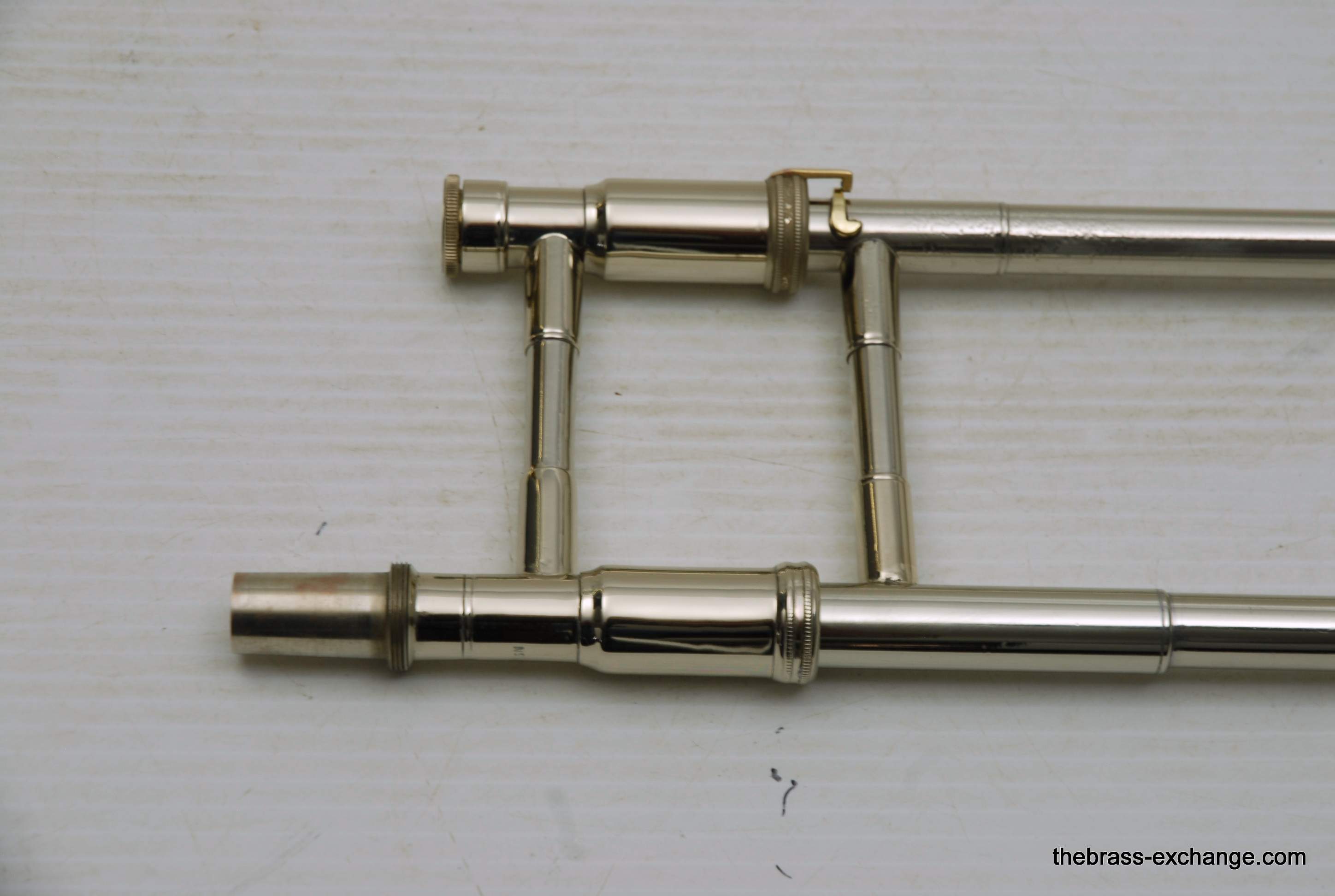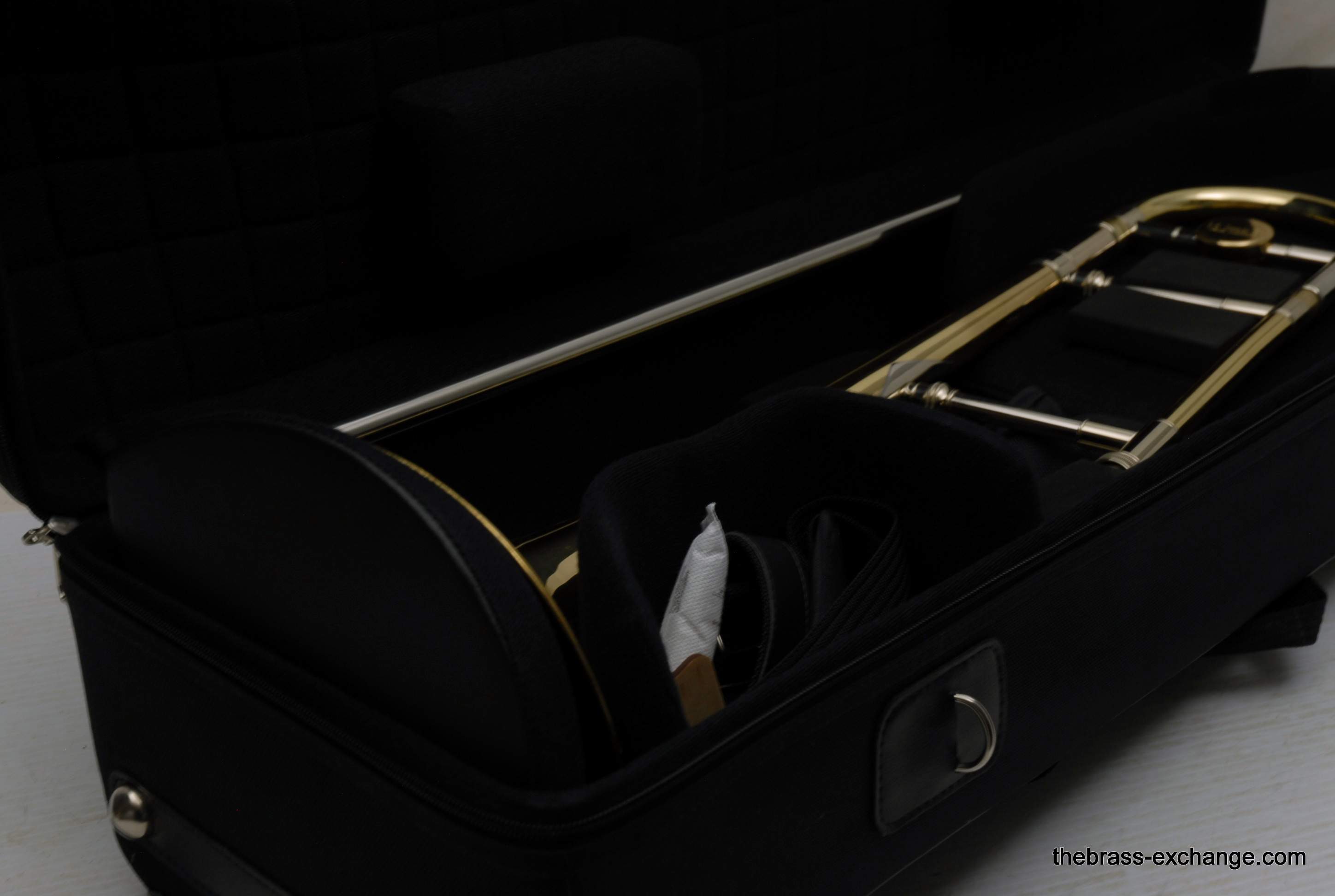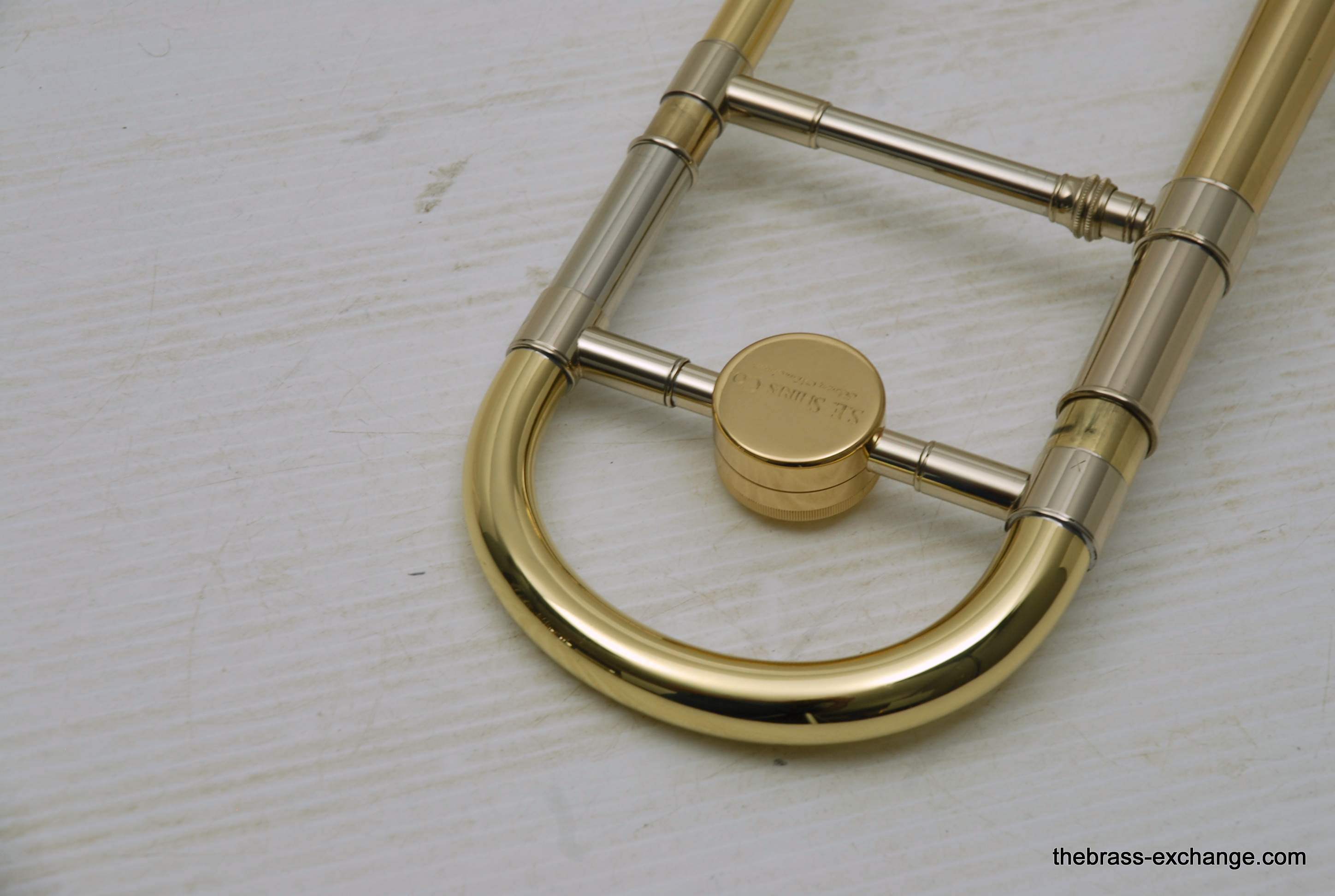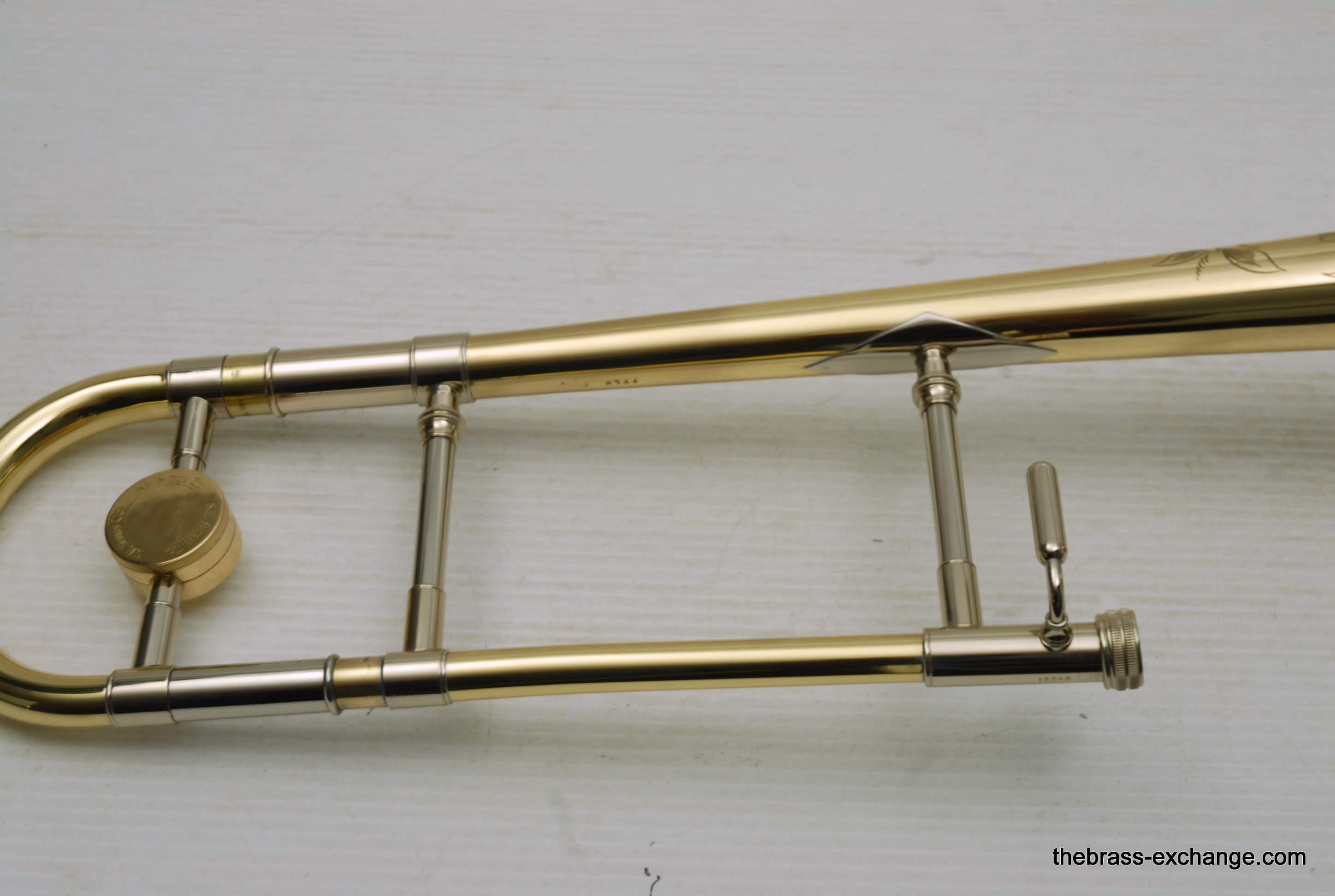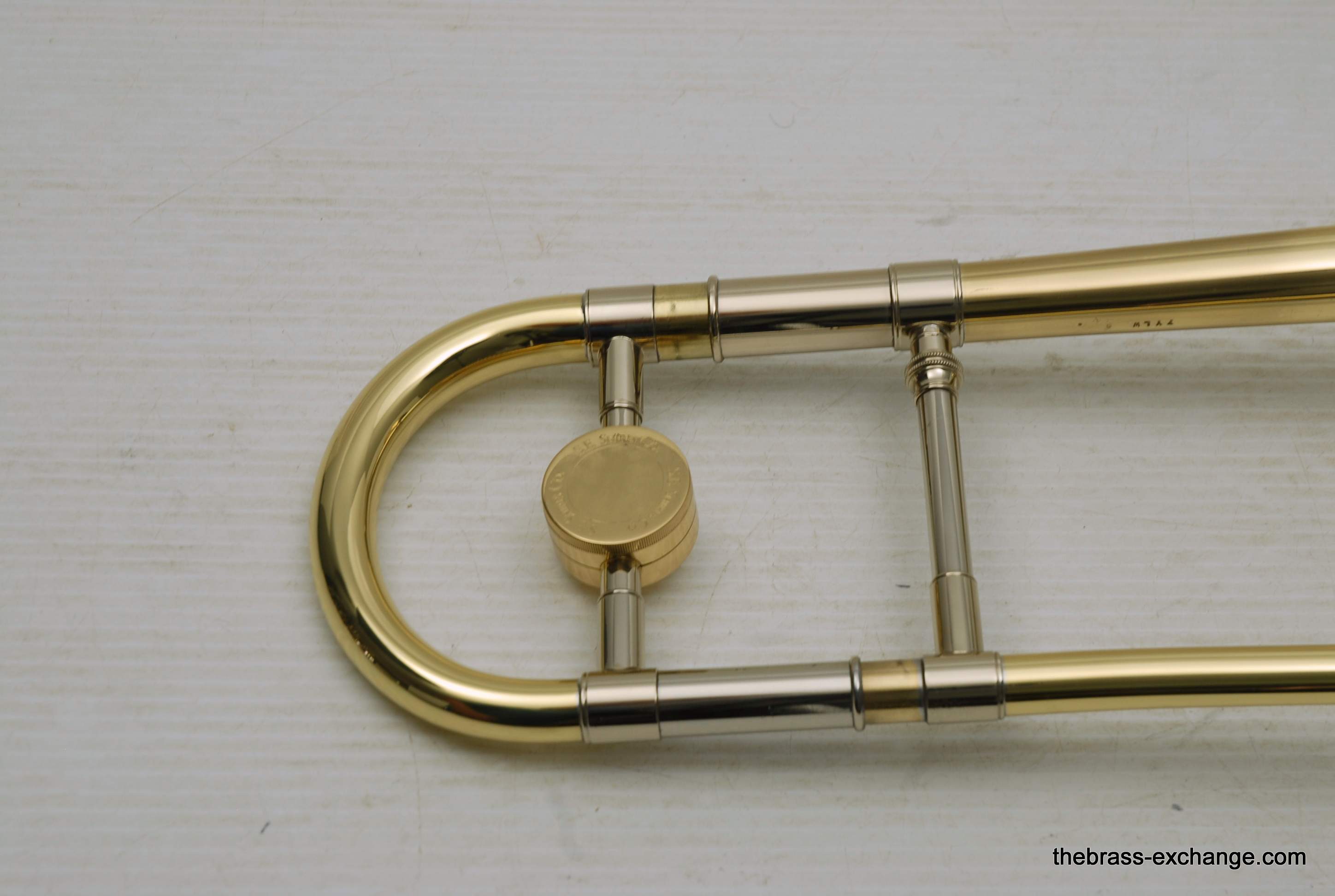 S.E. Shires Custom Series Medium Bore Tenor.  Has .525 bore T25N Standard weight nickel silver hand slide, reconditioned with new lacquer.  Has 8.5" Light Weight  Yellow Brass Bell 7YLW.  Removable neck, balance weight and tuning slide are new.  Includes two removable leadpipes, one for small shank receiver, one for large shank. Also includes new Marcus Bonna S.E. Shires Logo Case.  If no case, take off $300.  In-stock for immediate delivery.
