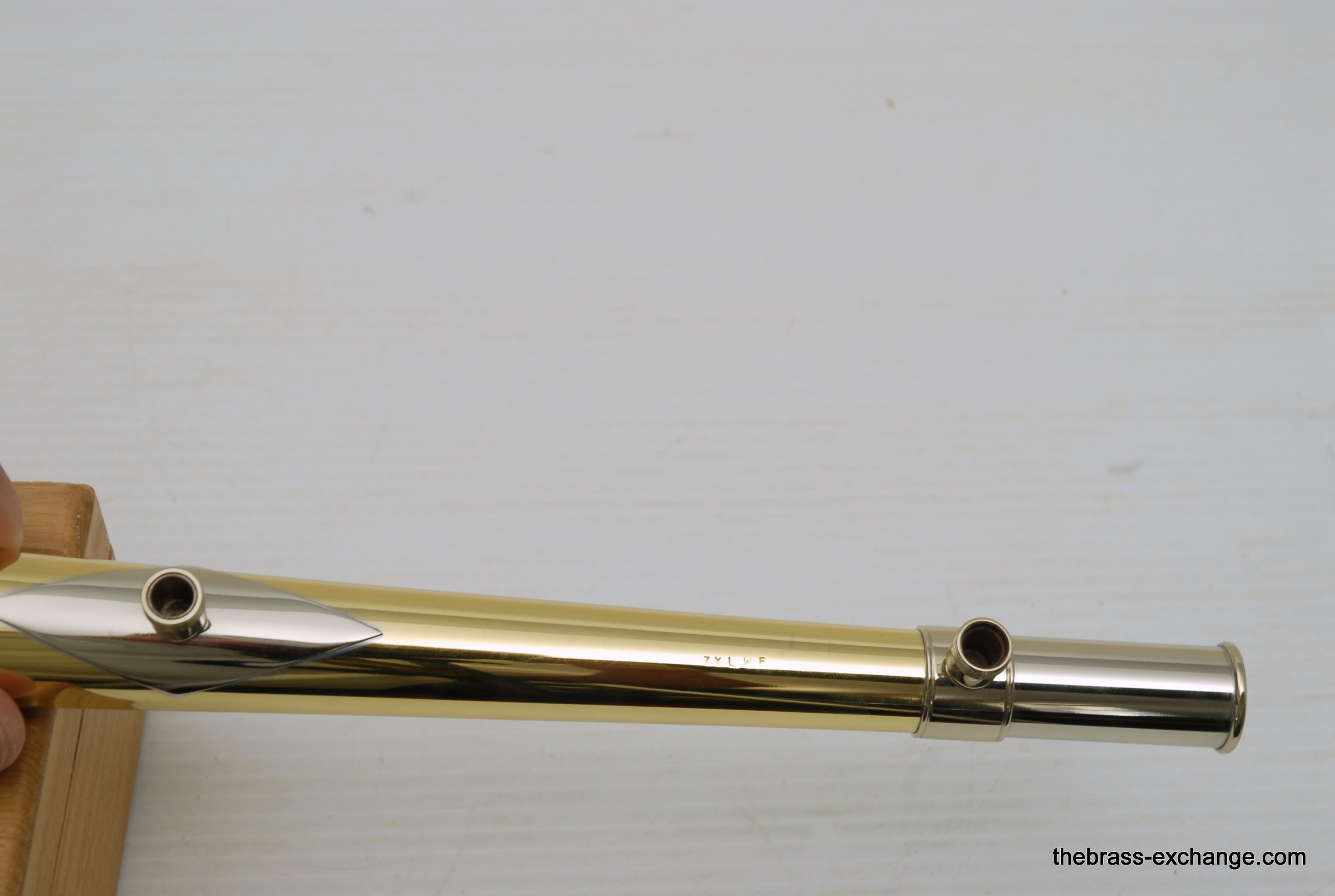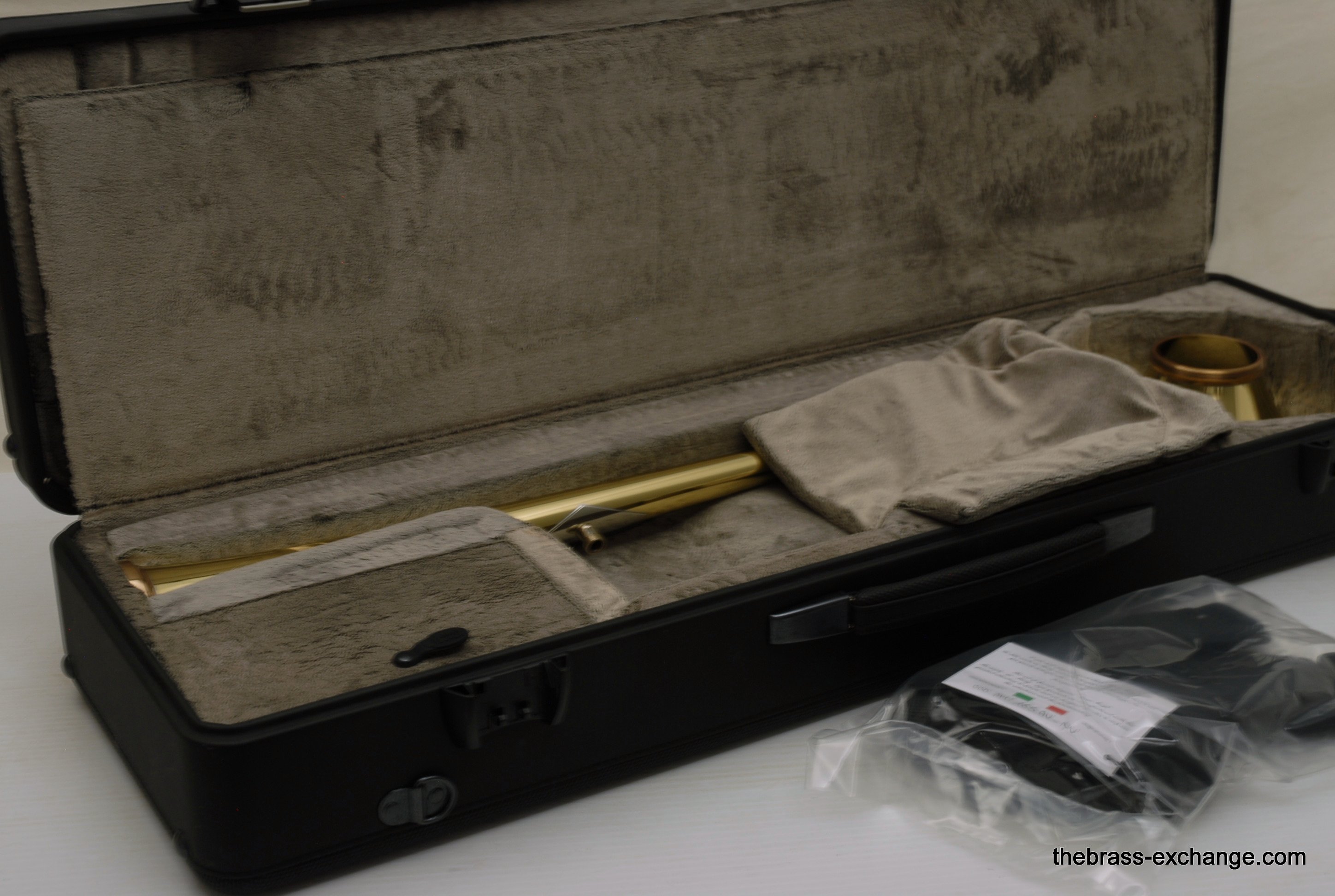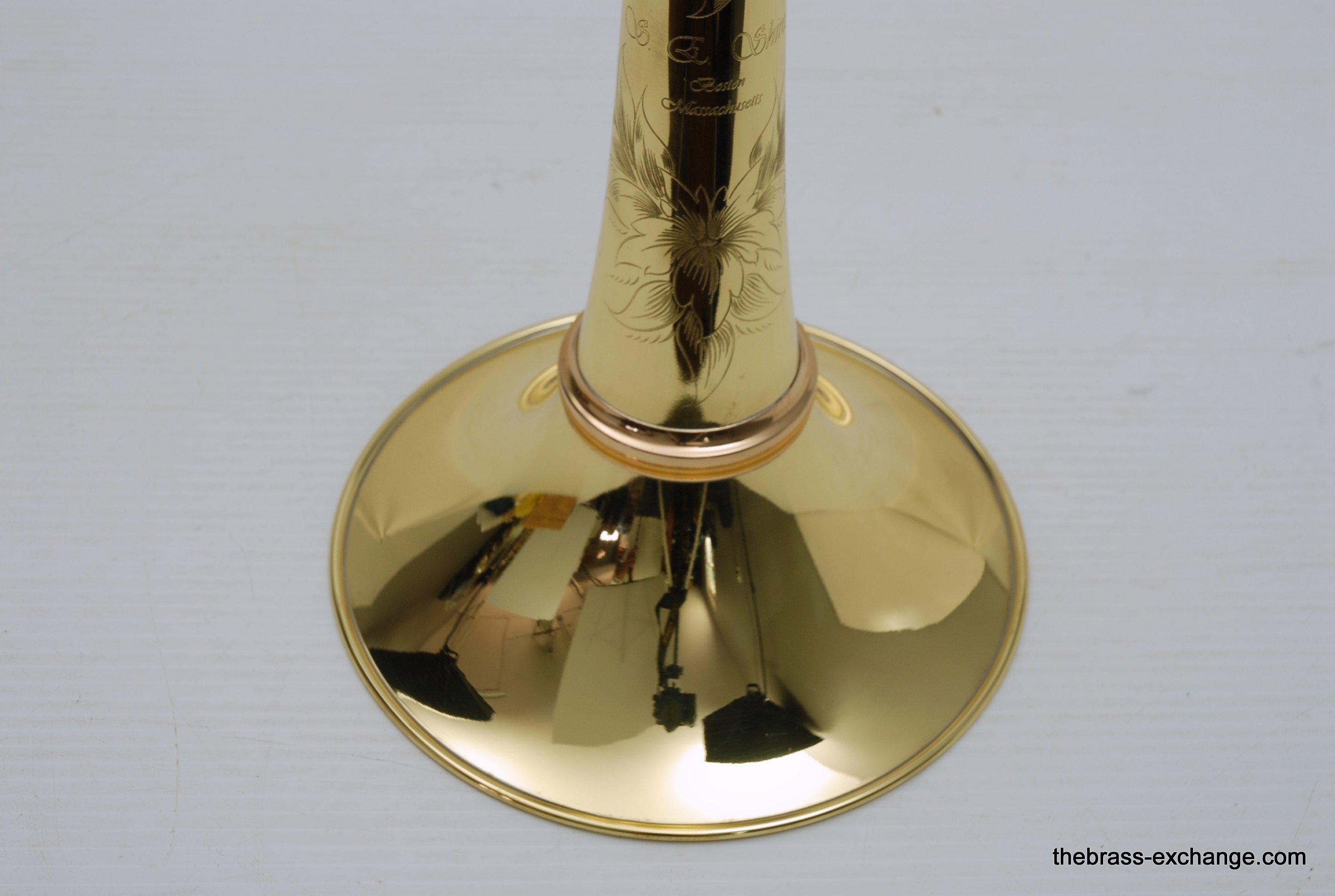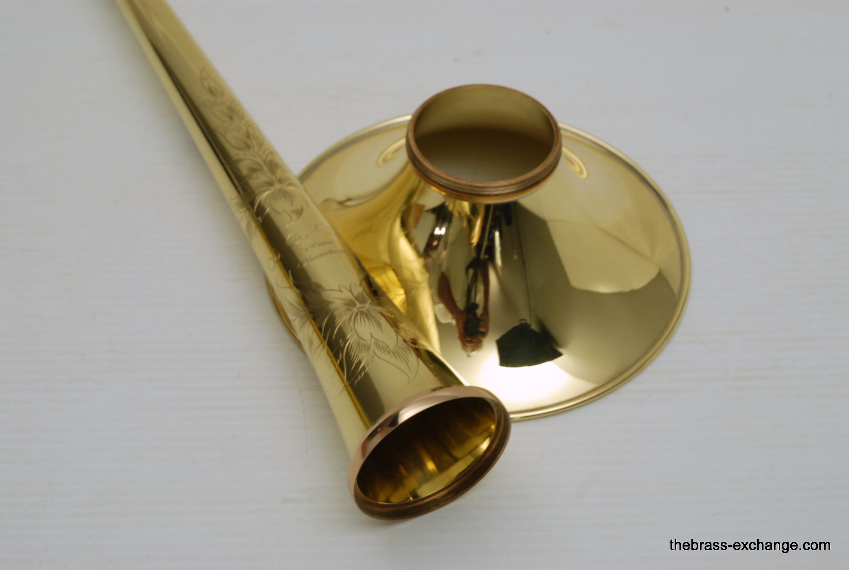 S.E. Shires 7YLWF Bell Section with Premium Marco Magi Flat Case.  This is a demo bell in perfect condition, and plays fantastic.  There is a lot of energy moving forward with this type of bell, forward projection.  Excellent orchestra or solo bell section.  The "F" is for French Bead Wire.  Has bronze collar.  It's hard to find a more attractive looking bell section, gorgeous engraving, and stunning contrast with the bronze collar.  The case was special order from our favorite Italian case maker Marco Magi.  This one is special because it has very comfortable removable backpack straps.  The outer panels on the case are made with a material that is used for motorcycle seats.  Very durable, scuff and tear resistant, plush velvet interior.  The case has the same specs as the S.E. Shires Marco Magi.  In-stock for immediate delivery.