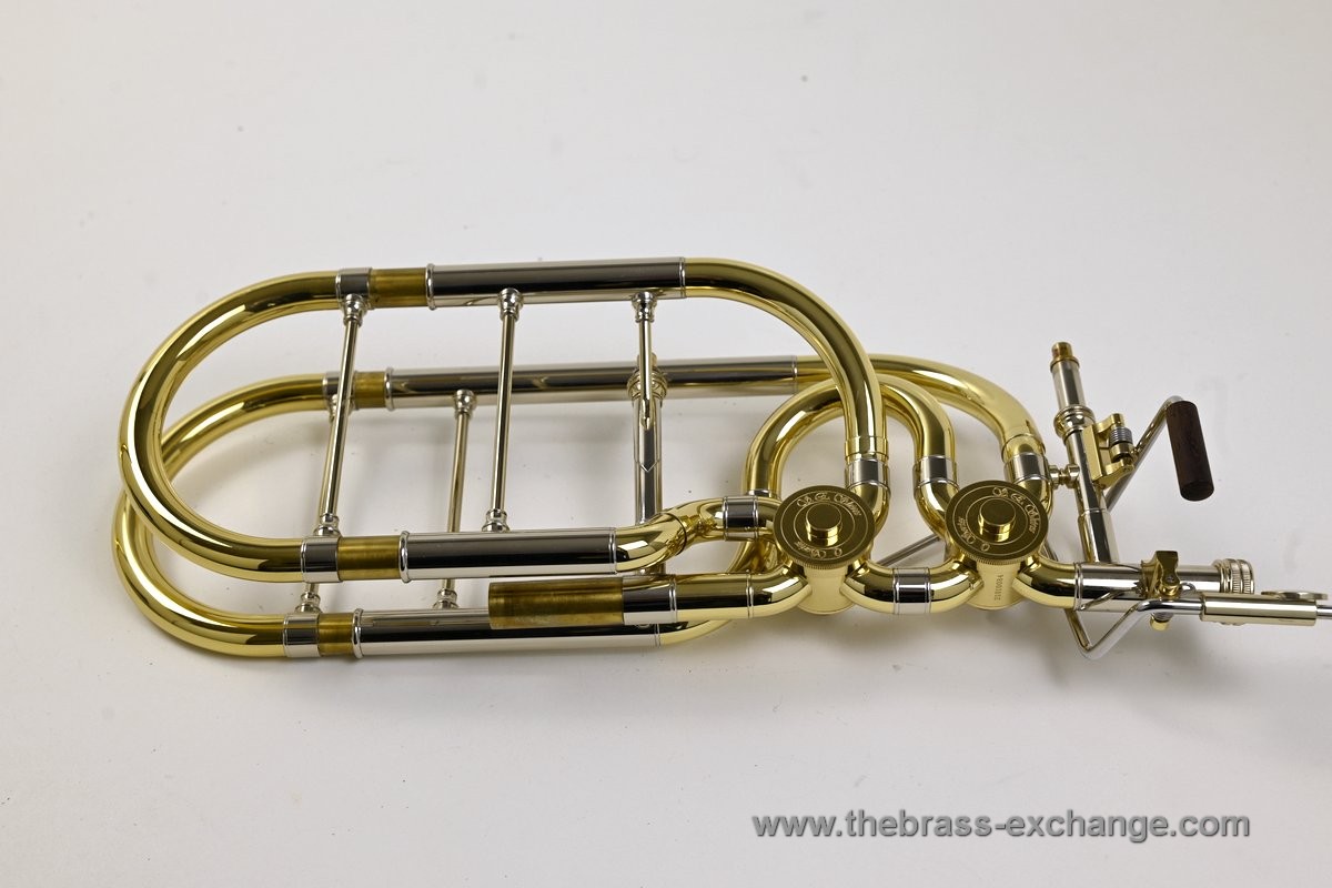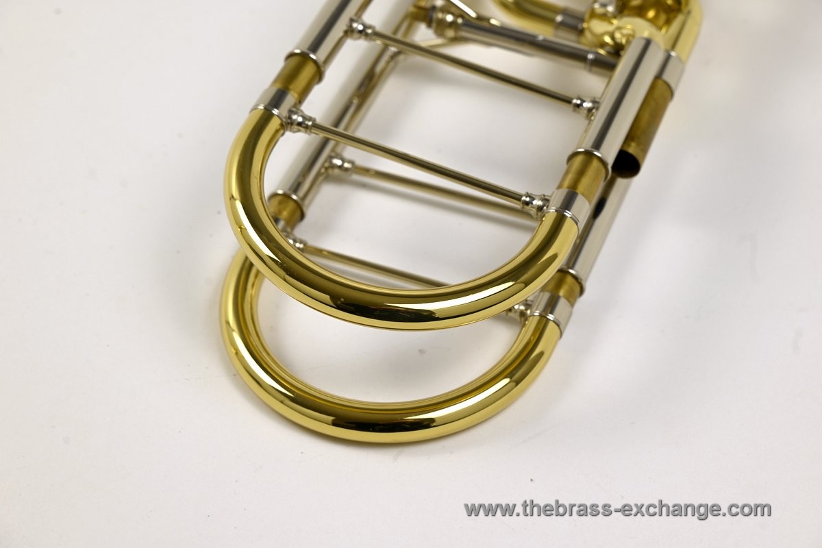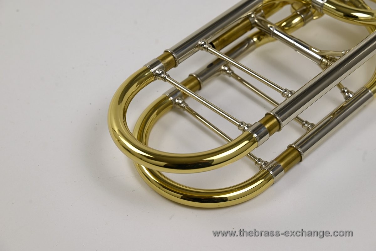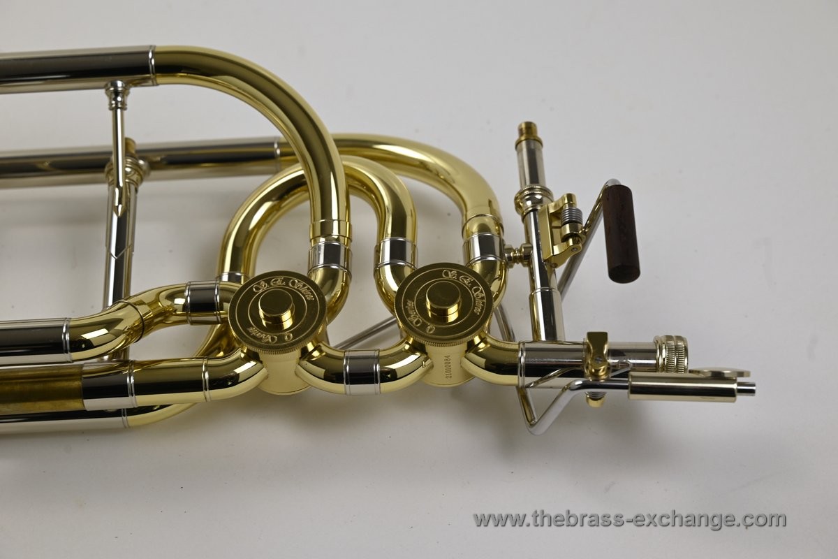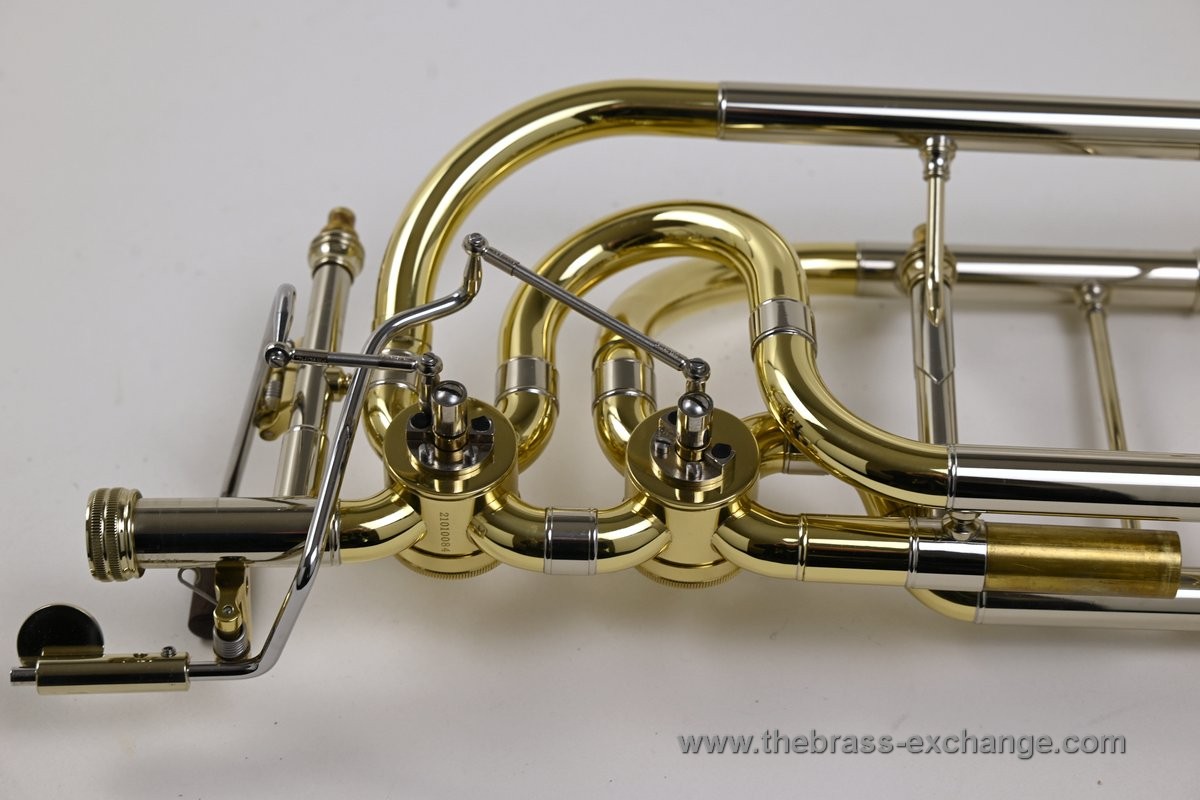 This valve section uses traditional rotary valves in an independent configuration, meaning each valve operates on its own and can be used separately or together. This differs from a dependent setup, where the second valve only activates when the first valve is already engaged. Independent systems offer more flexibility, especially for bass trombonists playing in orchestral or commercial settings.