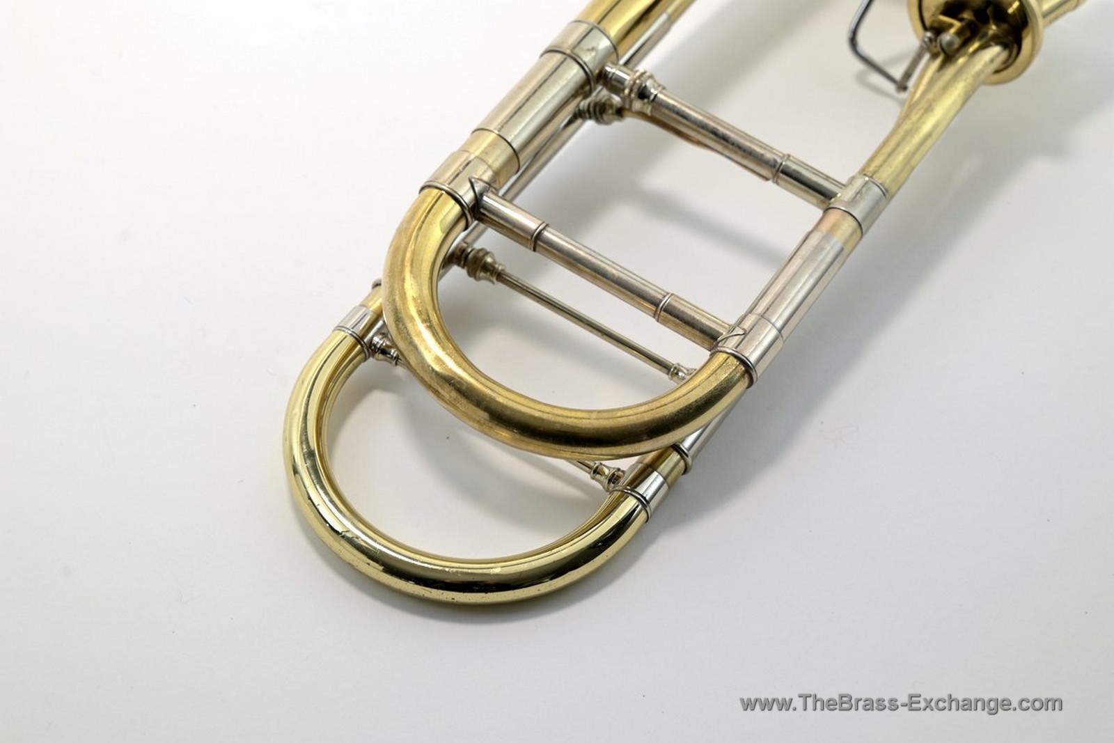 The handslide is a TB47-62LW lightweight dual-bore slide (.547–.562) with brass outer tubes and nickel end crook. This configuration provides a larger, more powerful feel than a standard .547 slide while maintaining the flexibility and clarity required for orchestral playing.