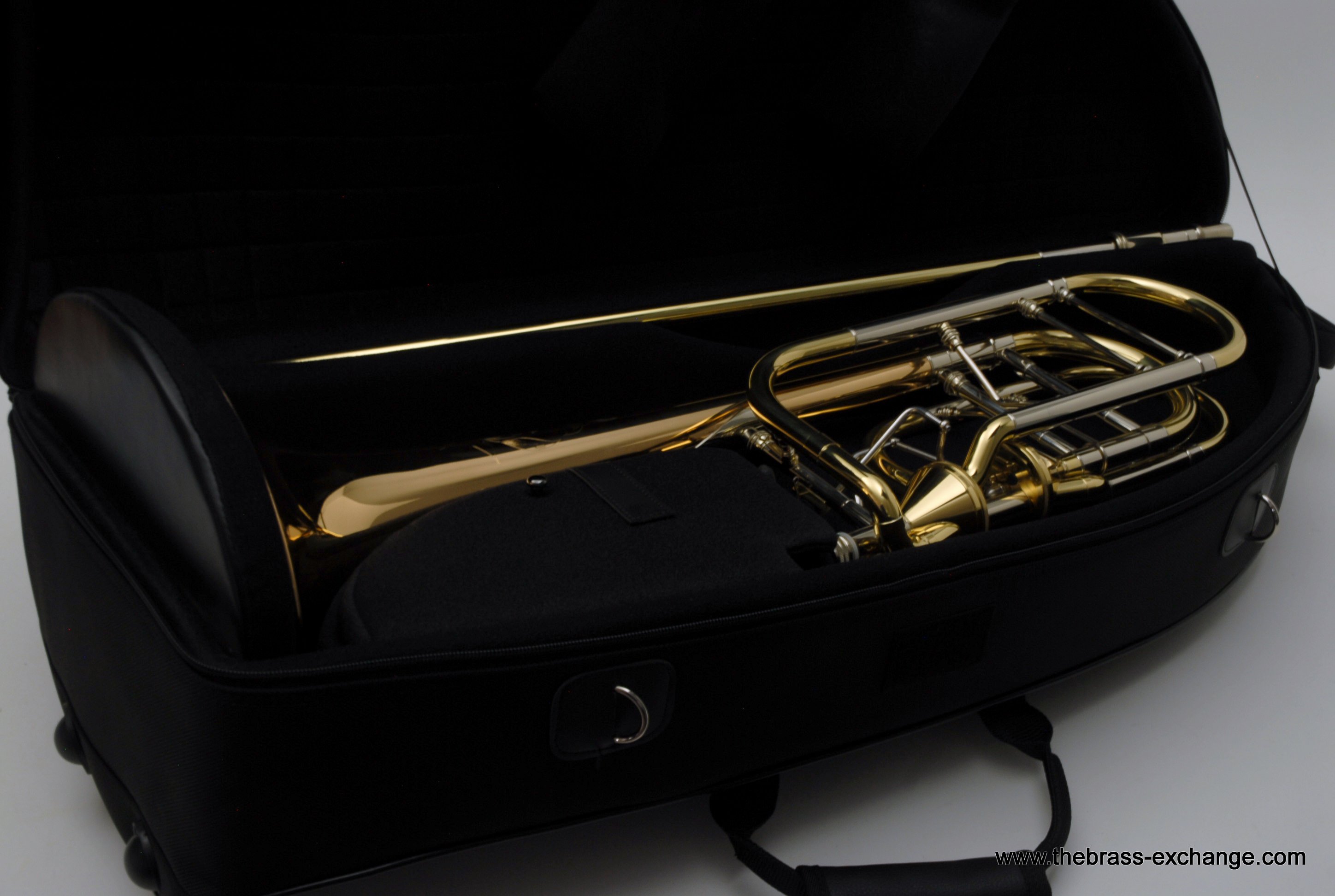 The instrument uses an independent axial-flow valve system (Bb/F/Gb/D) for an open, smooth low-register response with minimal resistance — a popular alternative to traditional rotary valves among today’s professionals.