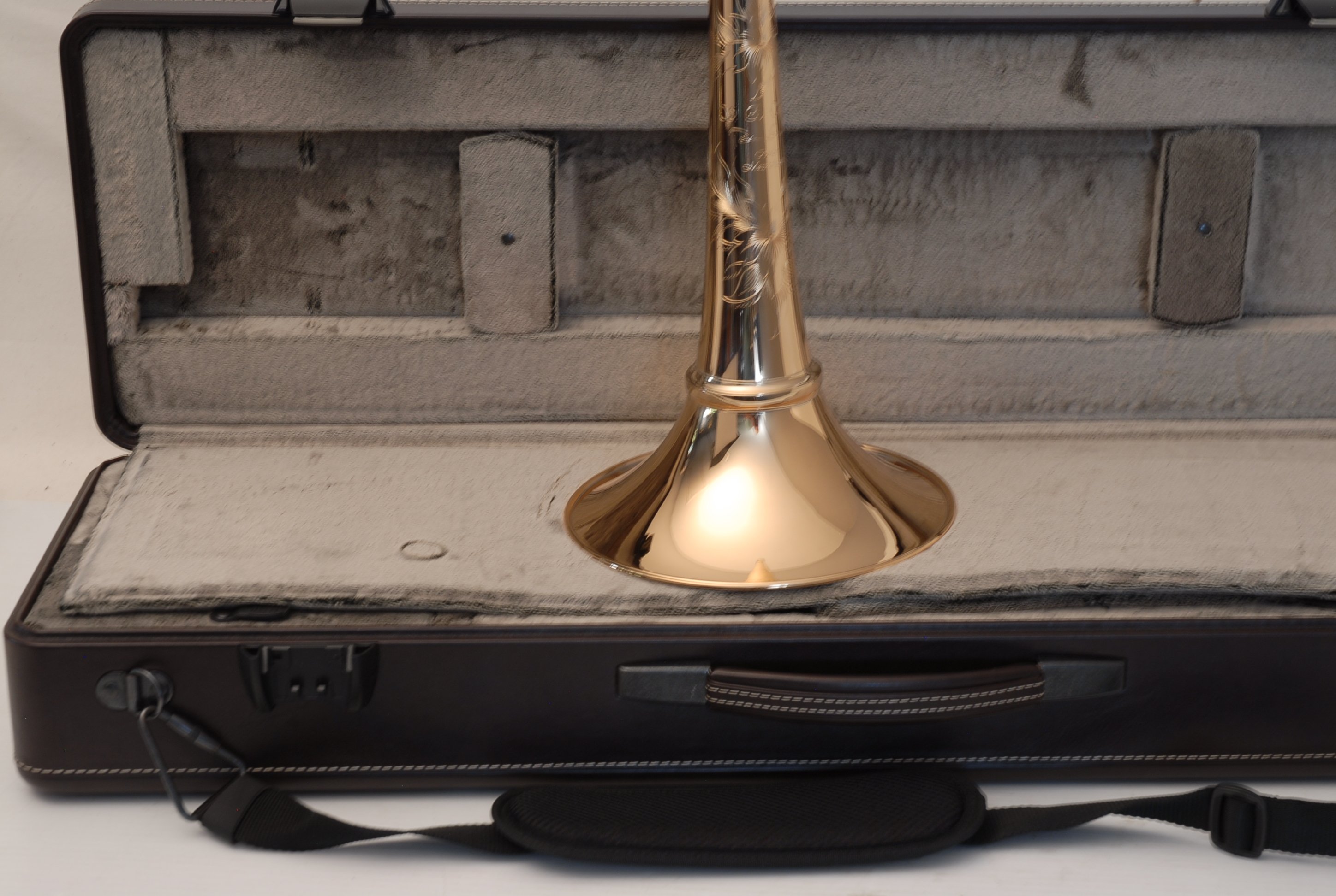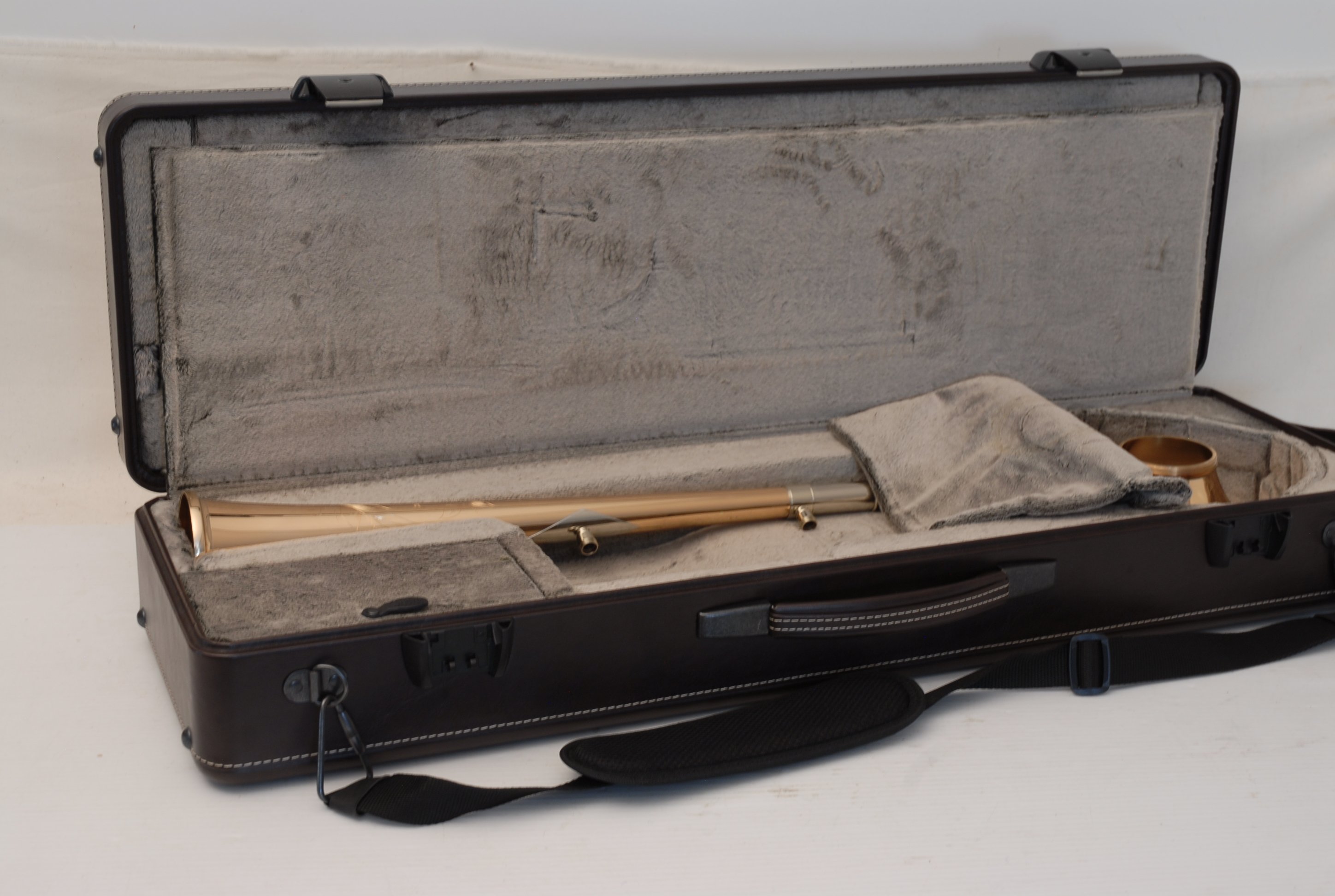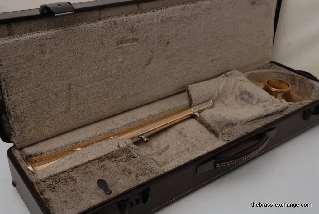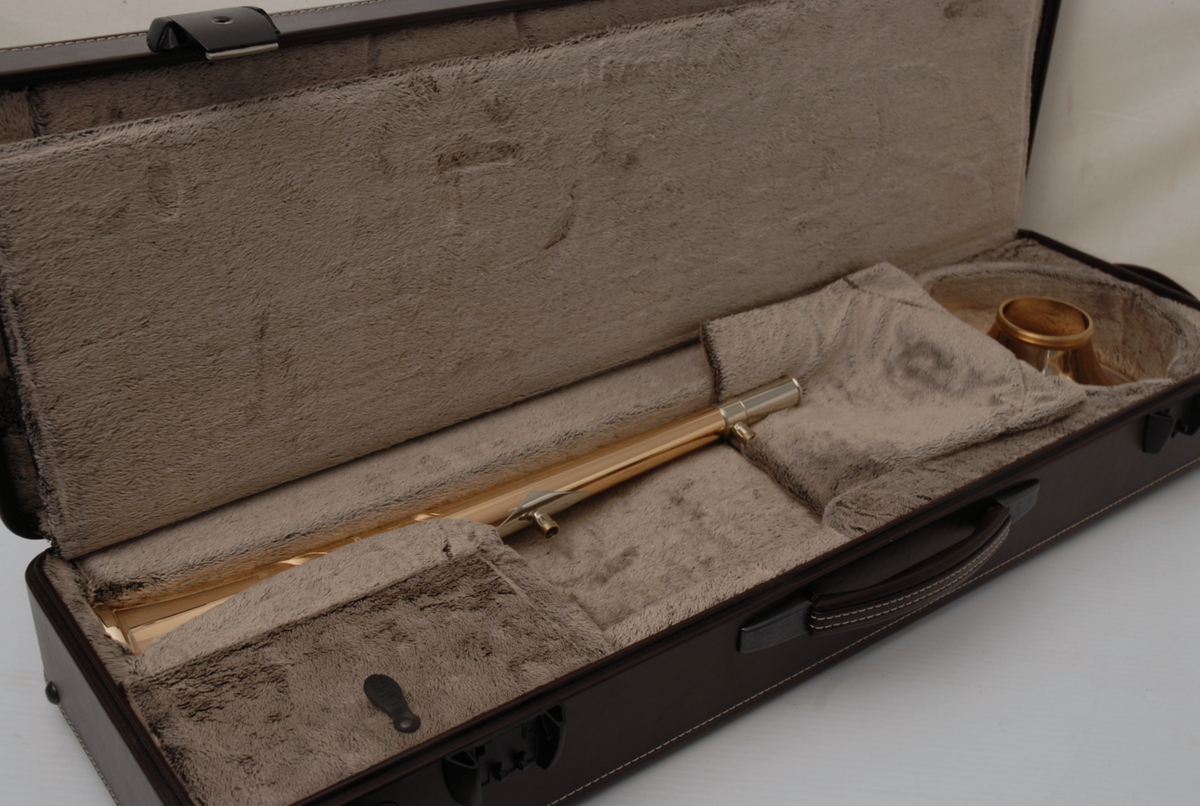 Included is a Marco Magi compact travel case designed for two-piece detachable bells with a threaded collar. Luxurious and practical, the case fits in most overhead compartments and is similar in size to a violin or viola case. It accommodates both standard and wide handslides, making it a versatile upgrade for professionals who travel frequently.