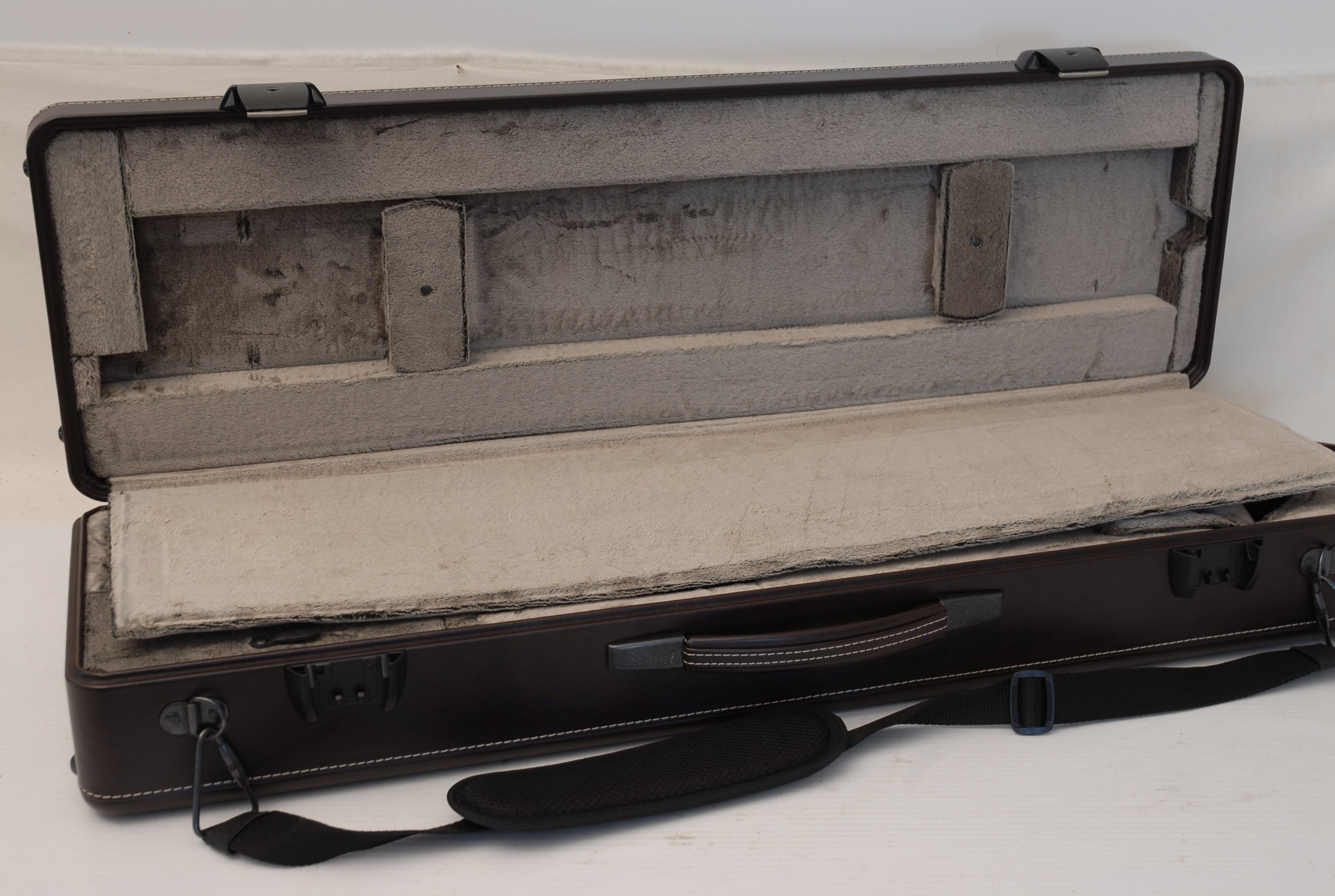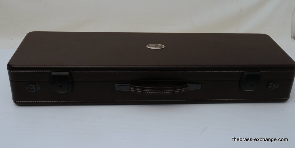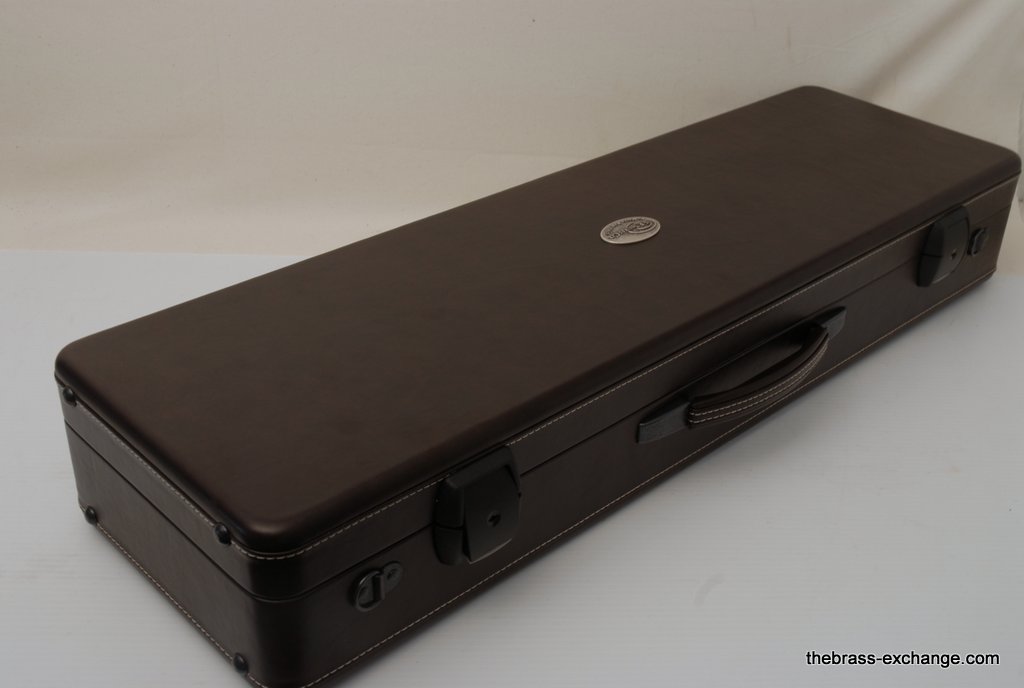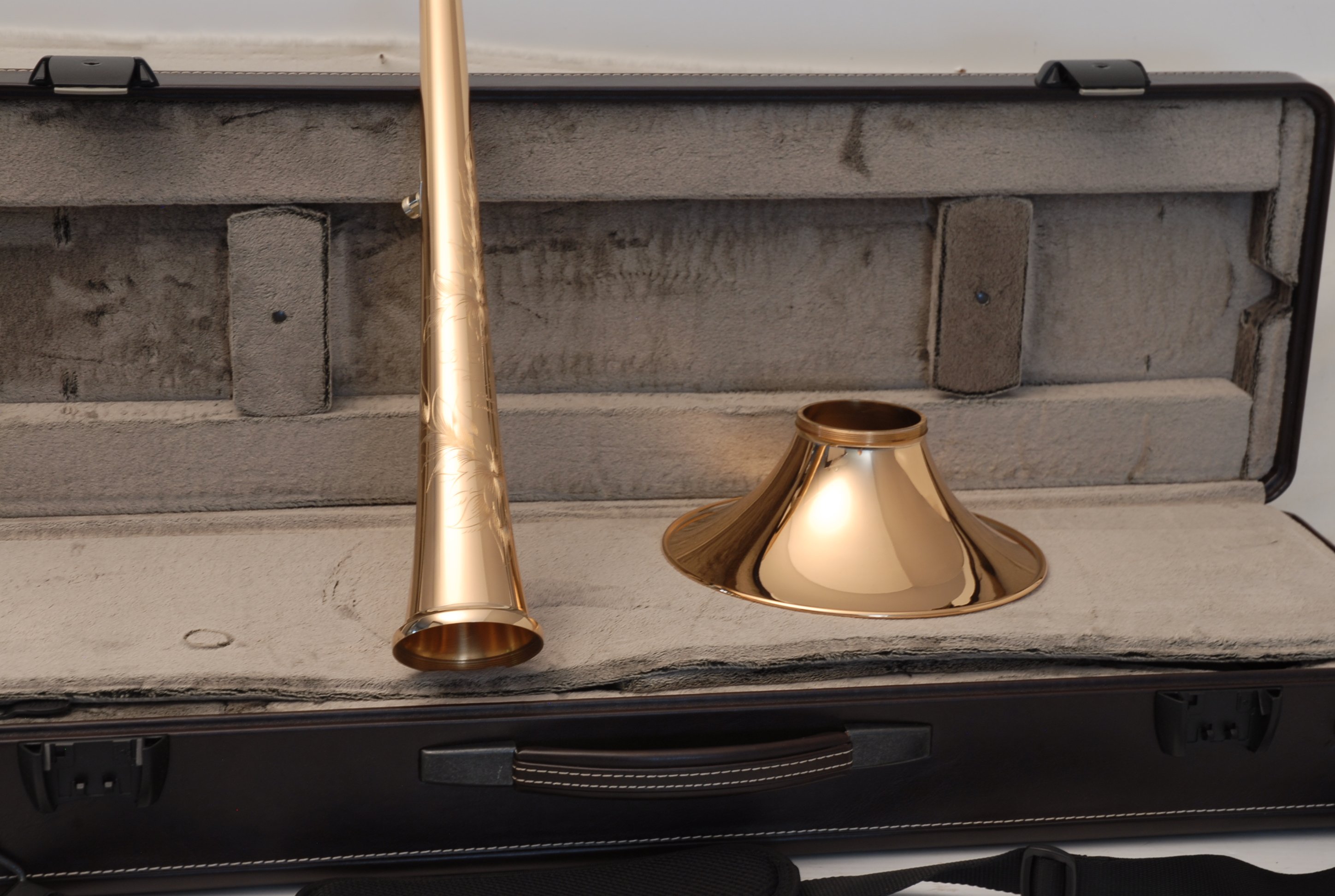 Included is a Marco Magi compact travel case designed for two-piece detachable bells with a threaded collar. Luxurious and practical, the case fits in most overhead compartments and is similar in size to a violin or viola case. It accommodates both standard and wide handslides, making it a versatile upgrade for professionals who travel frequently.