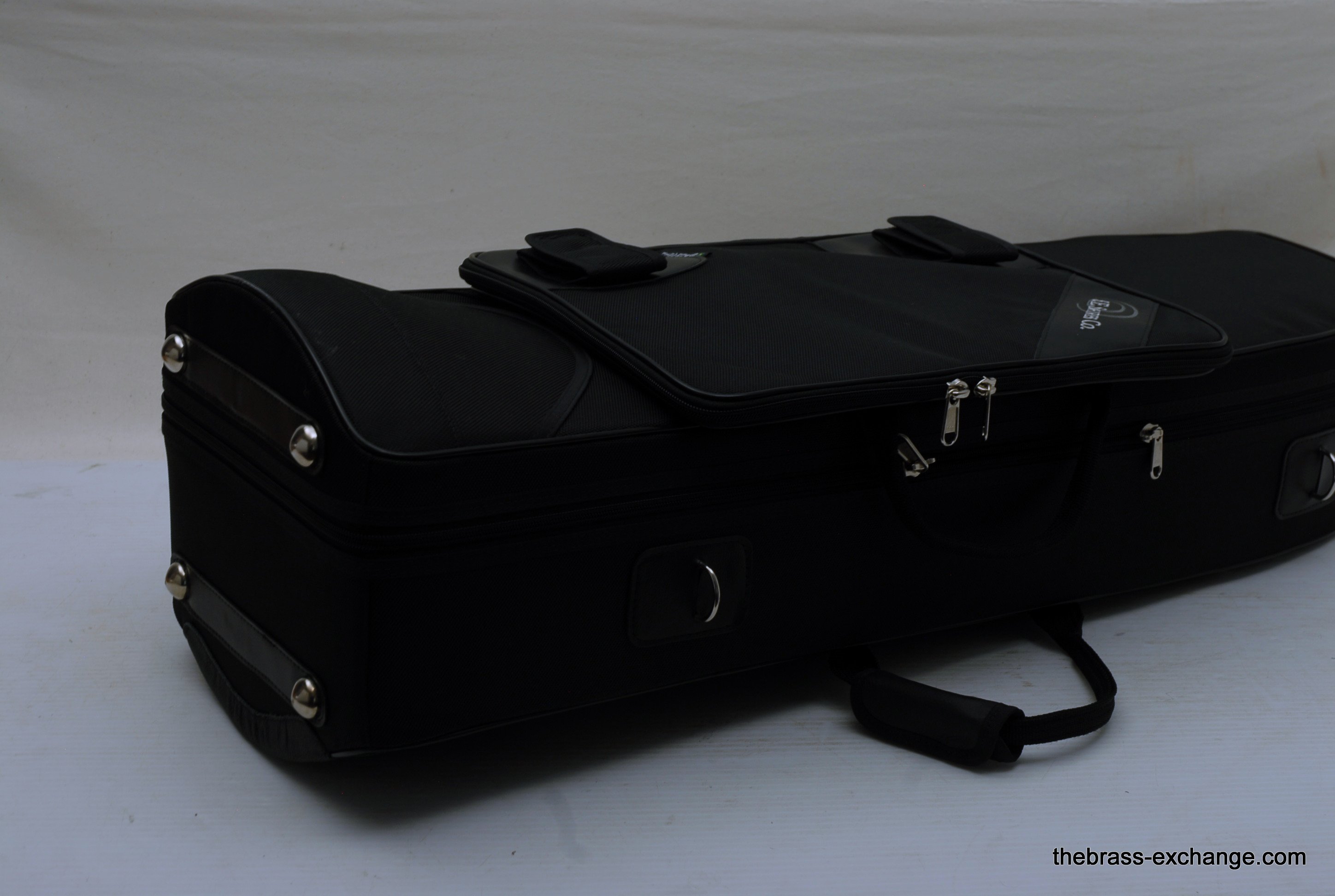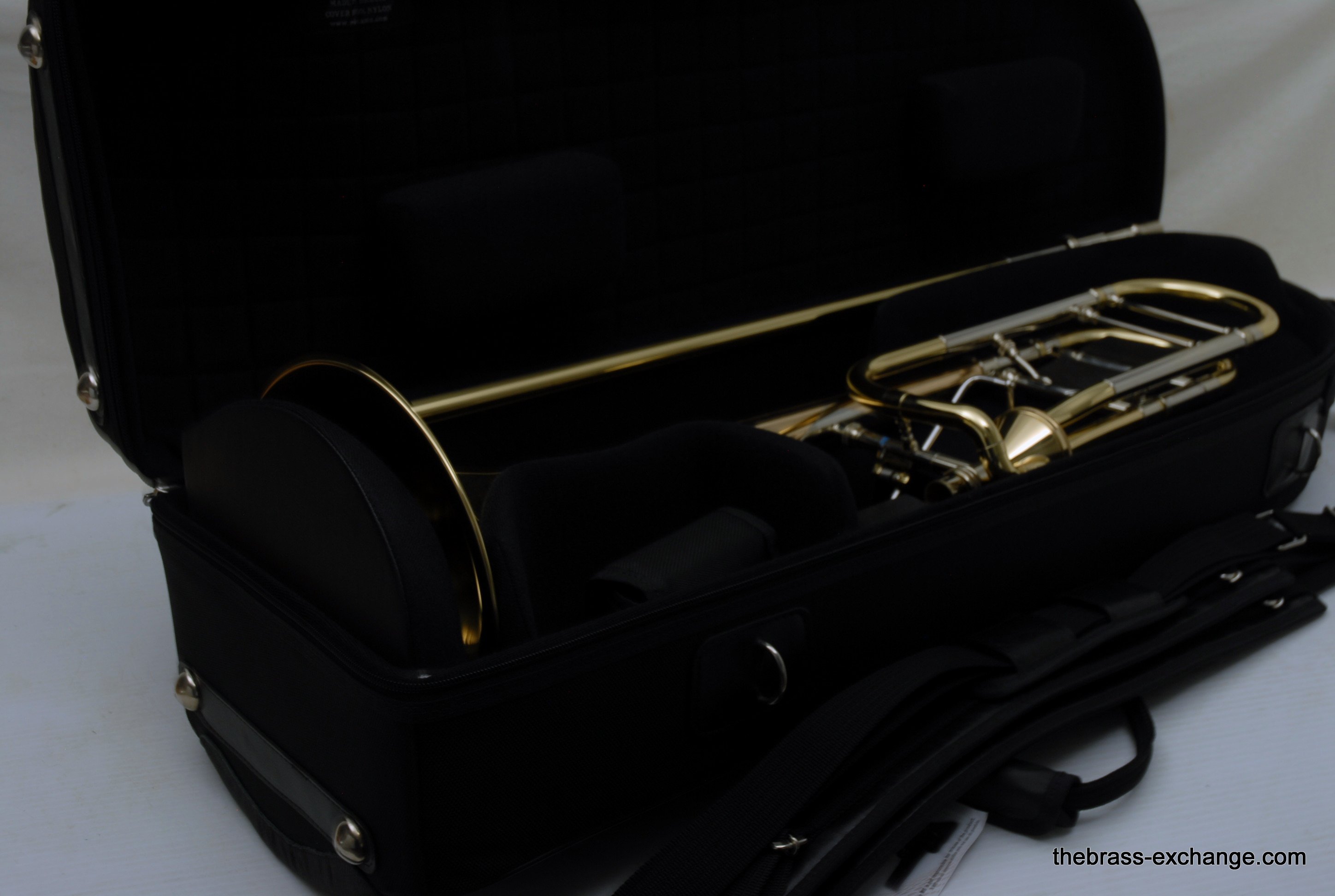 S.E. Shires Custom Tenor, Recent Make with factory warranty. This is one of our favorite Shires set-ups. Is great for all around tenor use, especially solo & recital. Bell section is 7GYLW lightweight gold brass stem with yellow brass flare 8.5". Plays like in between a gold brass and yellow brass style bell. It's a complex and colorful sound. The lightweight bell is very responisve at all dynamic levels, crisp pointed articulations, outsanding forward projection, but is very easy to play. Valve section is the standard axial flow valve. Yellow brass drawn standard taper tuning slide. Handslide TW47 standard weight, inlcudes two removable leadpipes. Mouthpiece and lubricants for valve/slide also included. Case is the Marcus Bonna Model S.E. Shires Logo Design, with removable back back straps, and customizable interior.
