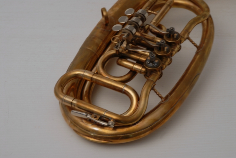 Sold Model: Bb Tenor Case: Not Included German Tenor Horn, Bb Rotary. Unkown manufacturer, most likely Russian made. Is unlacquered, raw brass. Takes Euro Shank Mouthpiece, not included. Plays warm and easily. Has been chem cleaned and serviced. Case not included. SHARE THIS: