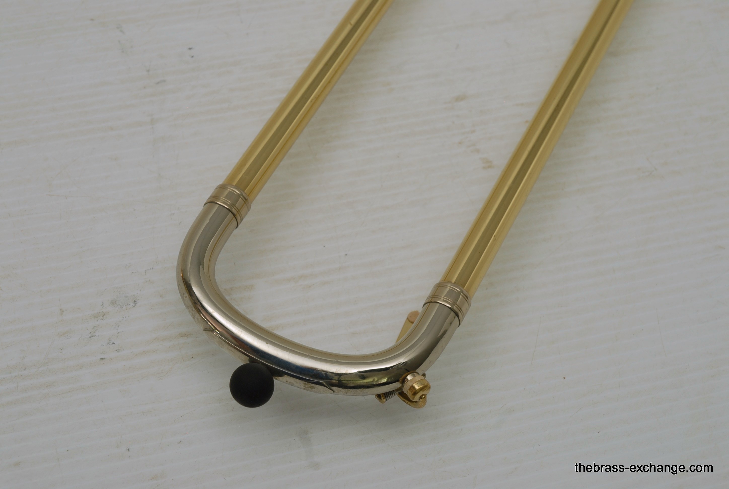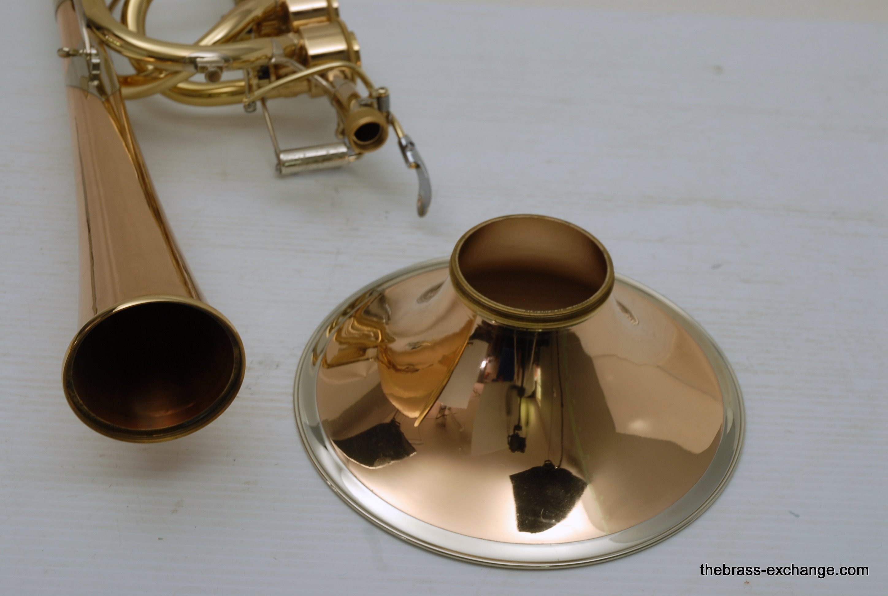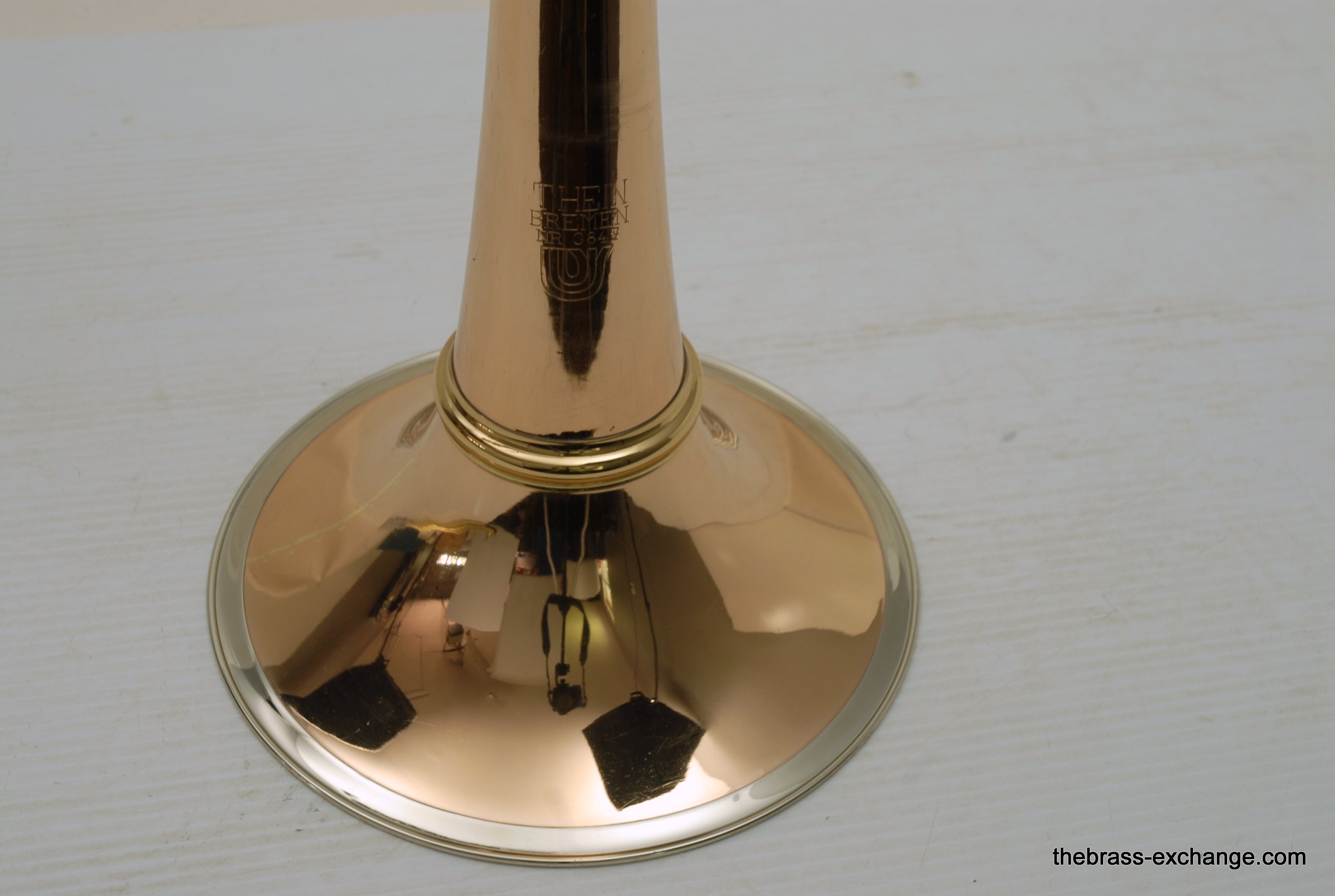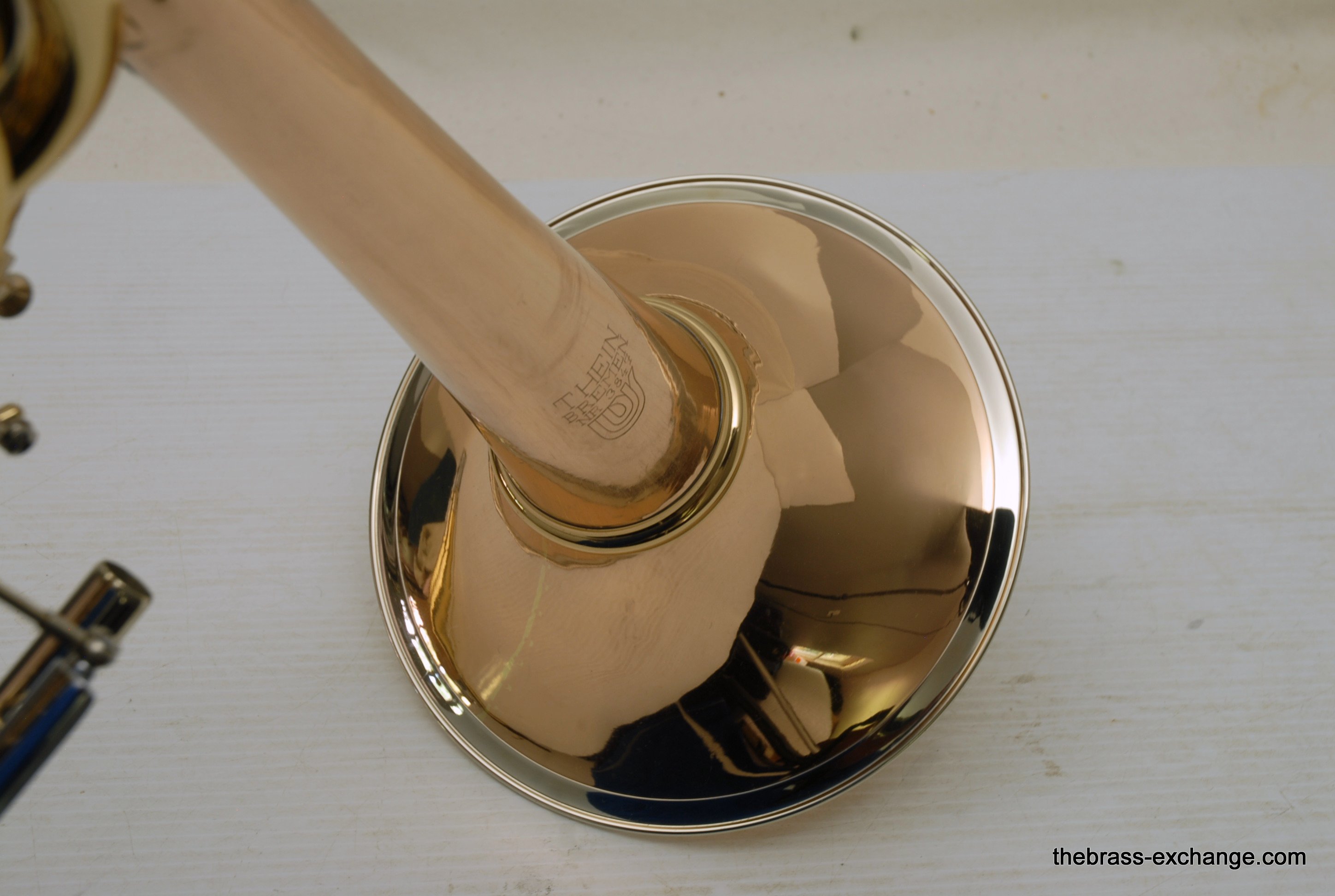 Thein Universal Bass Trombone. Made in Bremen, Germany. This is a pre-owned Bass with rose brass detachable bell flare, independent Hagmann valves with heavy valve caps, standard weight handslide, removable press fit leadpipe. The bell flare on this Thein is 1/2" less than the standard American made 9.5" bell. In this design, size doesn't matter. It plays huge with the 9" light weight rose brass bell with nickel silver garland around rim. Has lots of center and core. Gorgeous dark sound that will brighten up easily when asked too. The Hagmann valve play like a dream. The action feels like butter. Standard weight single bore .562 handslide. Handslide action is fantastic, plays super easy. Has had full shop service, chemical bath, valve serviced, slide adjusted. Really no room to imrove mechanical function, playability, or appearance. Will not dissapoint. Would be an amazing all around bass for all styles, including orchestra, commercial, studio, jazz. Compact flat case is about the size of a viola case, and is shaped like one too. This model Thein with detachable bell flare sells new for over 10K with limited avaialbility and long production time. If you are a pro player looking to travel with a detachable bell in a compact case, this is it. In-stock for immediate delivery.