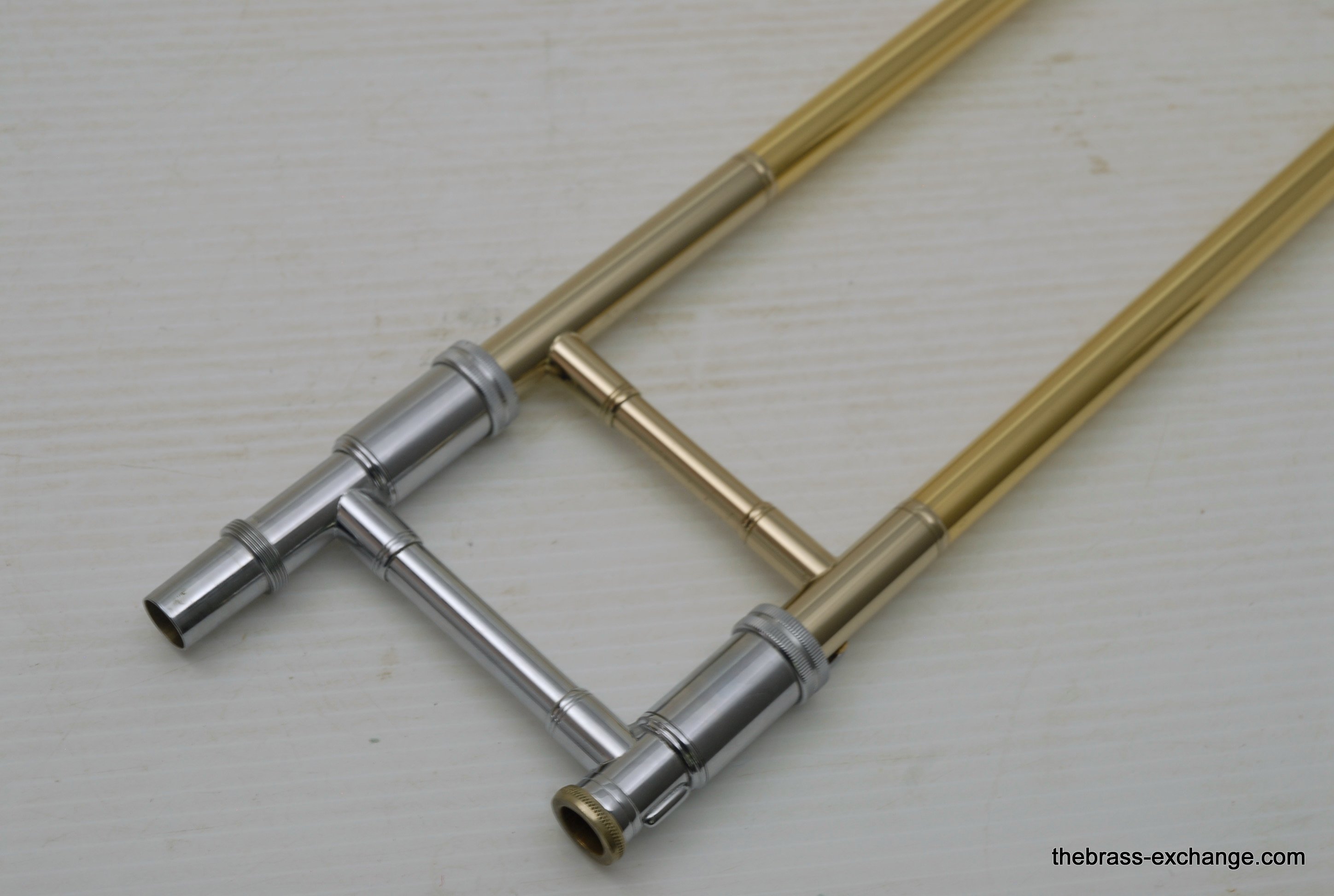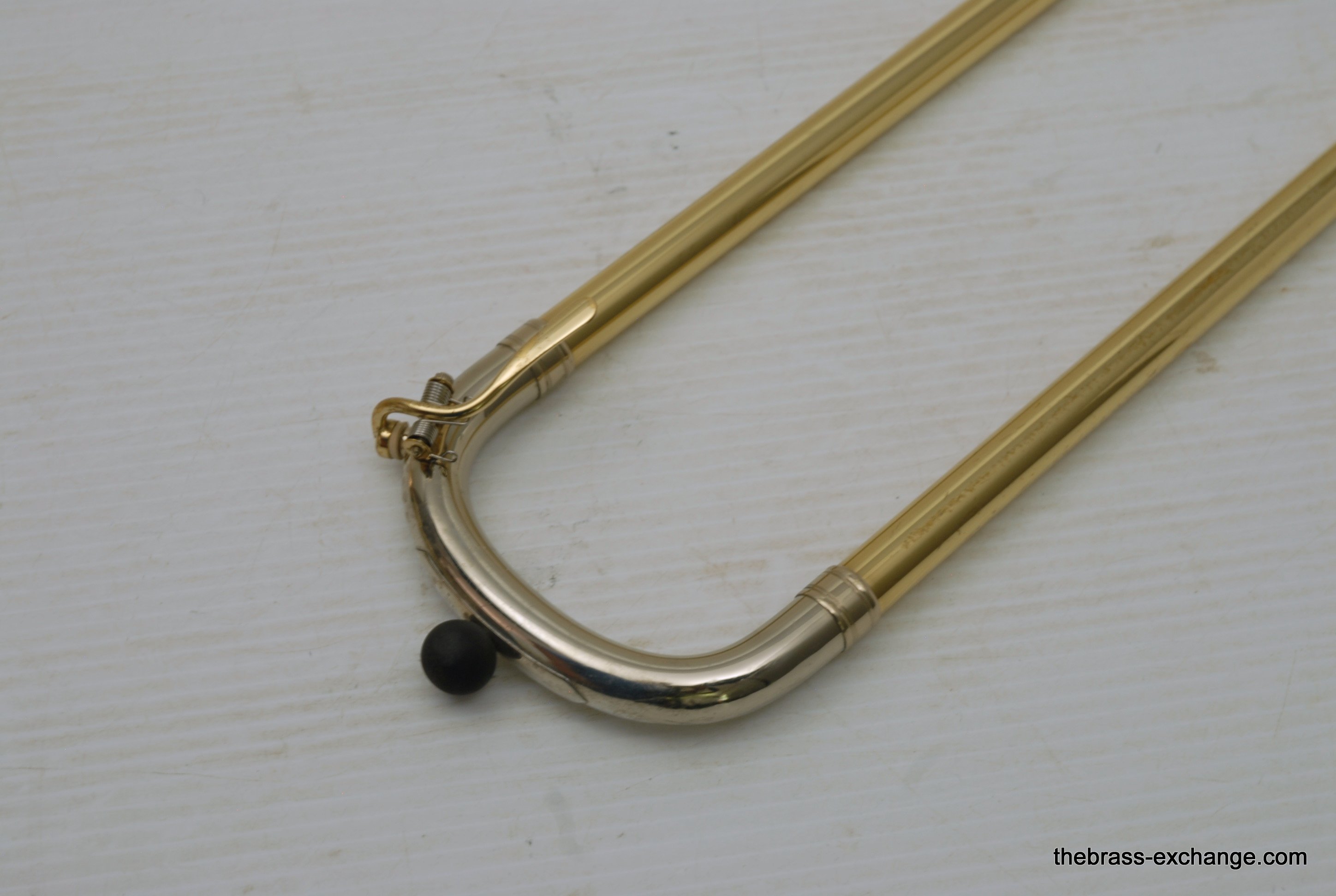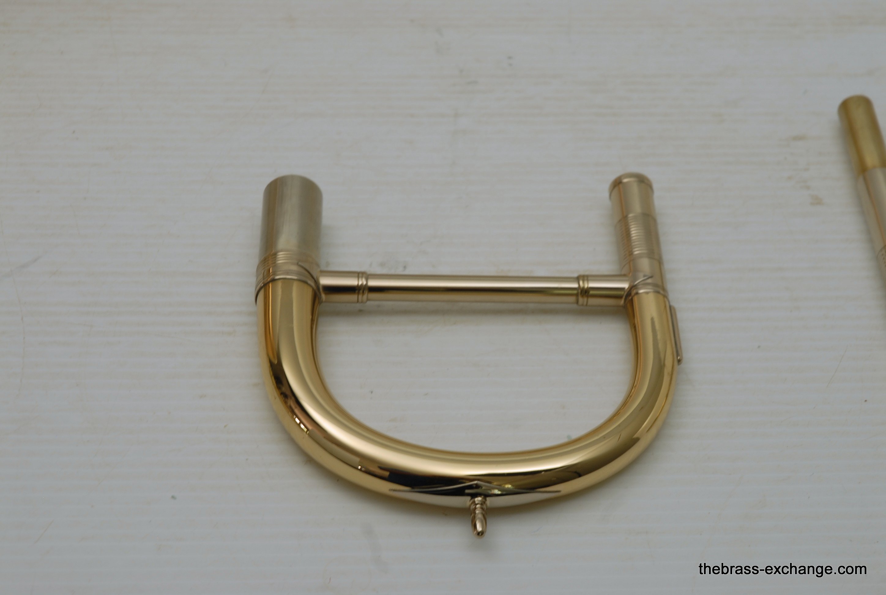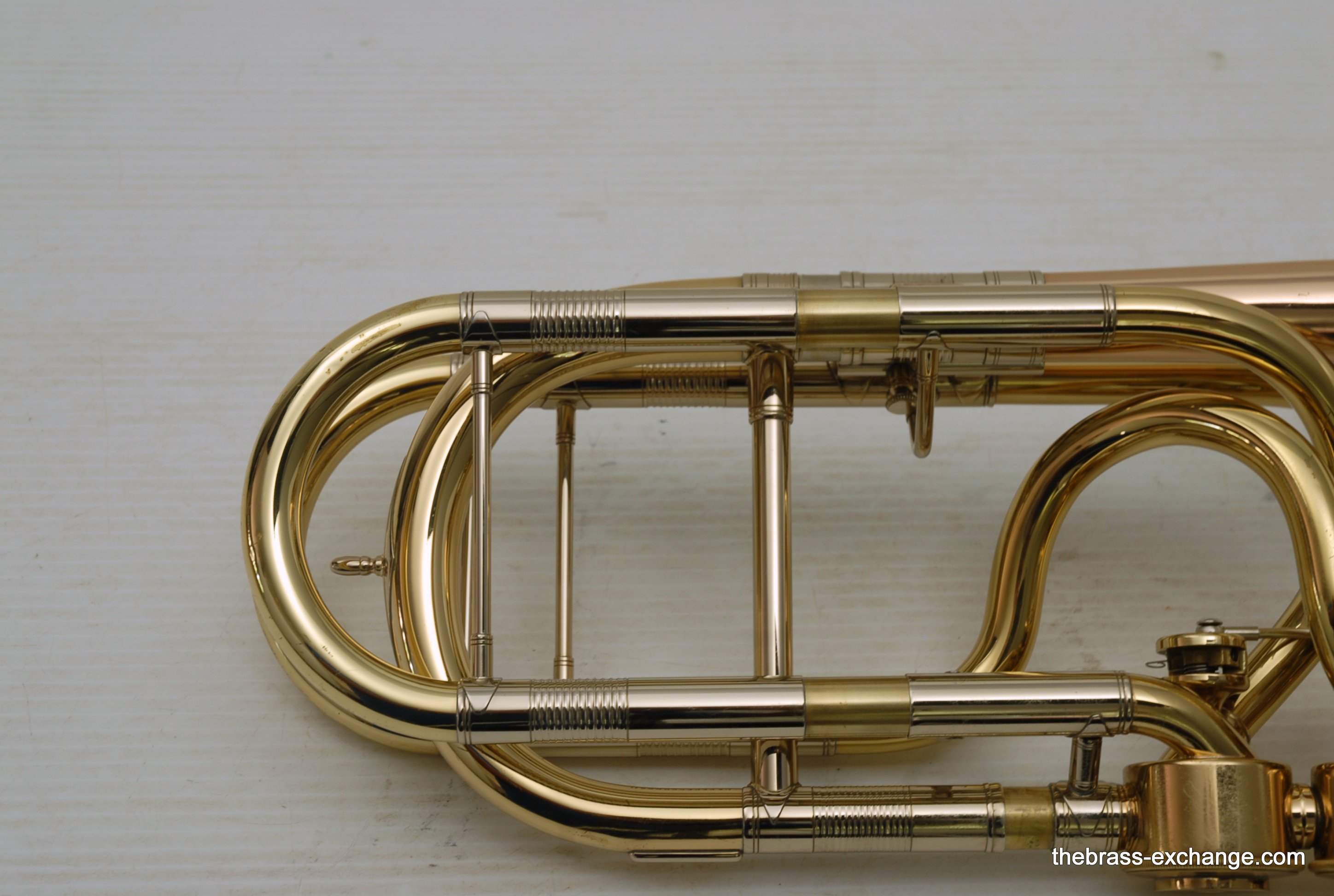 Thein Universal Bass Trombone. Made in Bremen, Germany. This is a pre-owned Bass with rose brass detachable bell flare, independent Hagmann valves with heavy valve caps, standard weight handslide, removable press fit leadpipe. The bell flare on this Thein is 1/2" less than the standard American made 9.5" bell. In this design, size doesn't matter. It plays huge with the 9" light weight rose brass bell with nickel silver garland around rim. Has lots of center and core. Gorgeous dark sound that will brighten up easily when asked too. The Hagmann valve play like a dream. The action feels like butter. Standard weight single bore .562 handslide. Handslide action is fantastic, plays super easy. Has had full shop service, chemical bath, valve serviced, slide adjusted. Really no room to imrove mechanical function, playability, or appearance. Will not dissapoint. Would be an amazing all around bass for all styles, including orchestra, commercial, studio, jazz. Compact flat case is about the size of a viola case, and is shaped like one too. This model Thein with detachable bell flare sells new for over 10K with limited avaialbility and long production time. If you are a pro player looking to travel with a detachable bell in a compact case, this is it. In-stock for immediate delivery.
