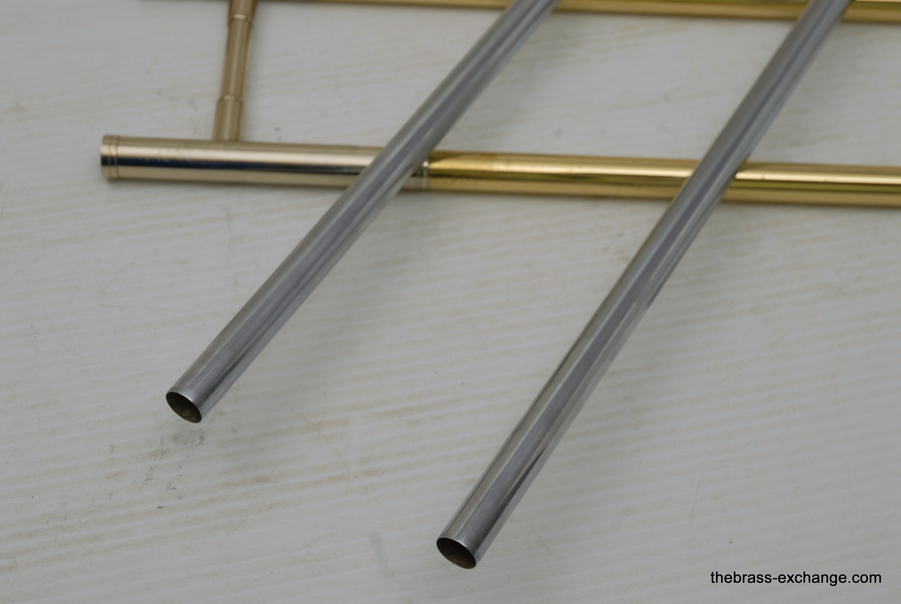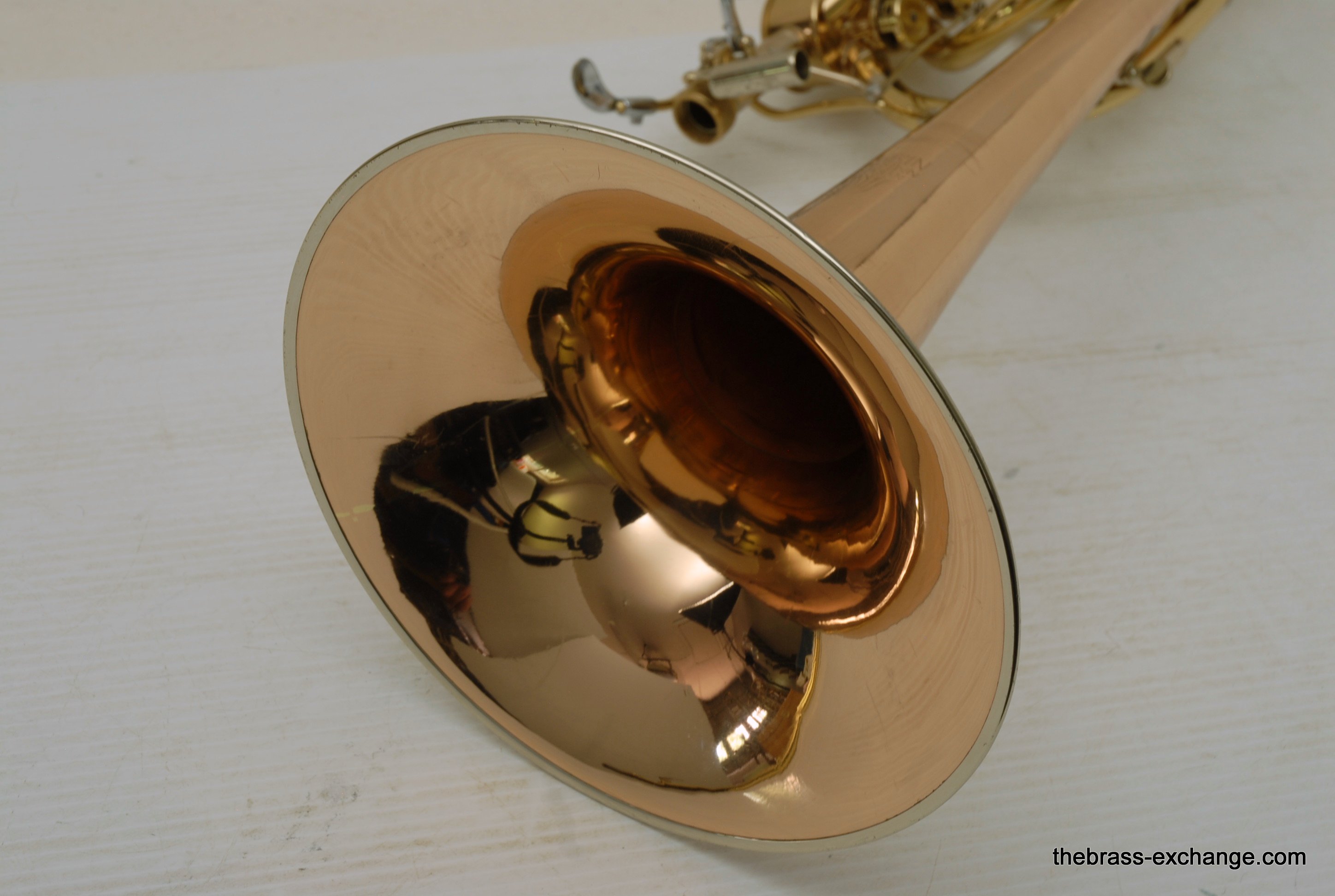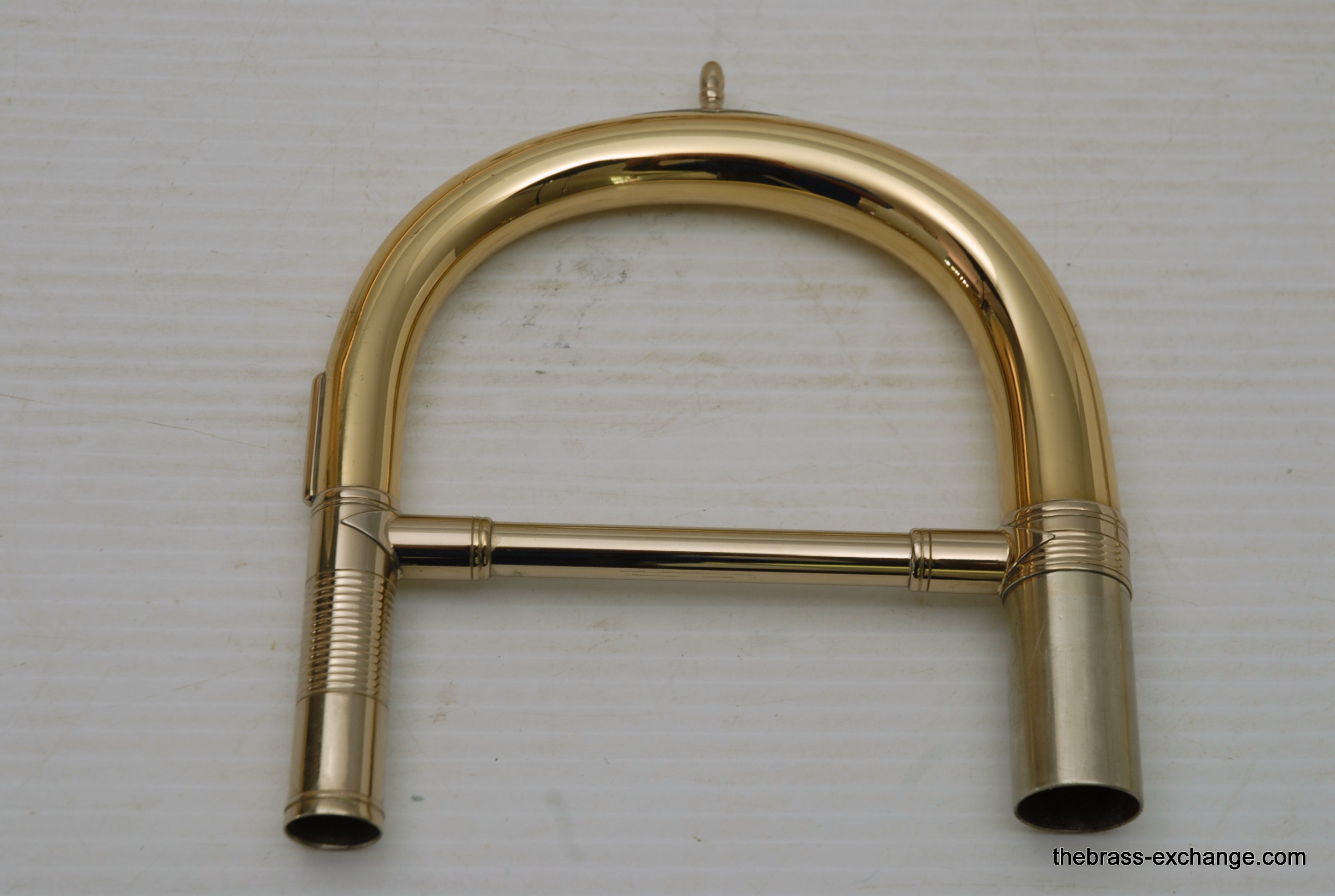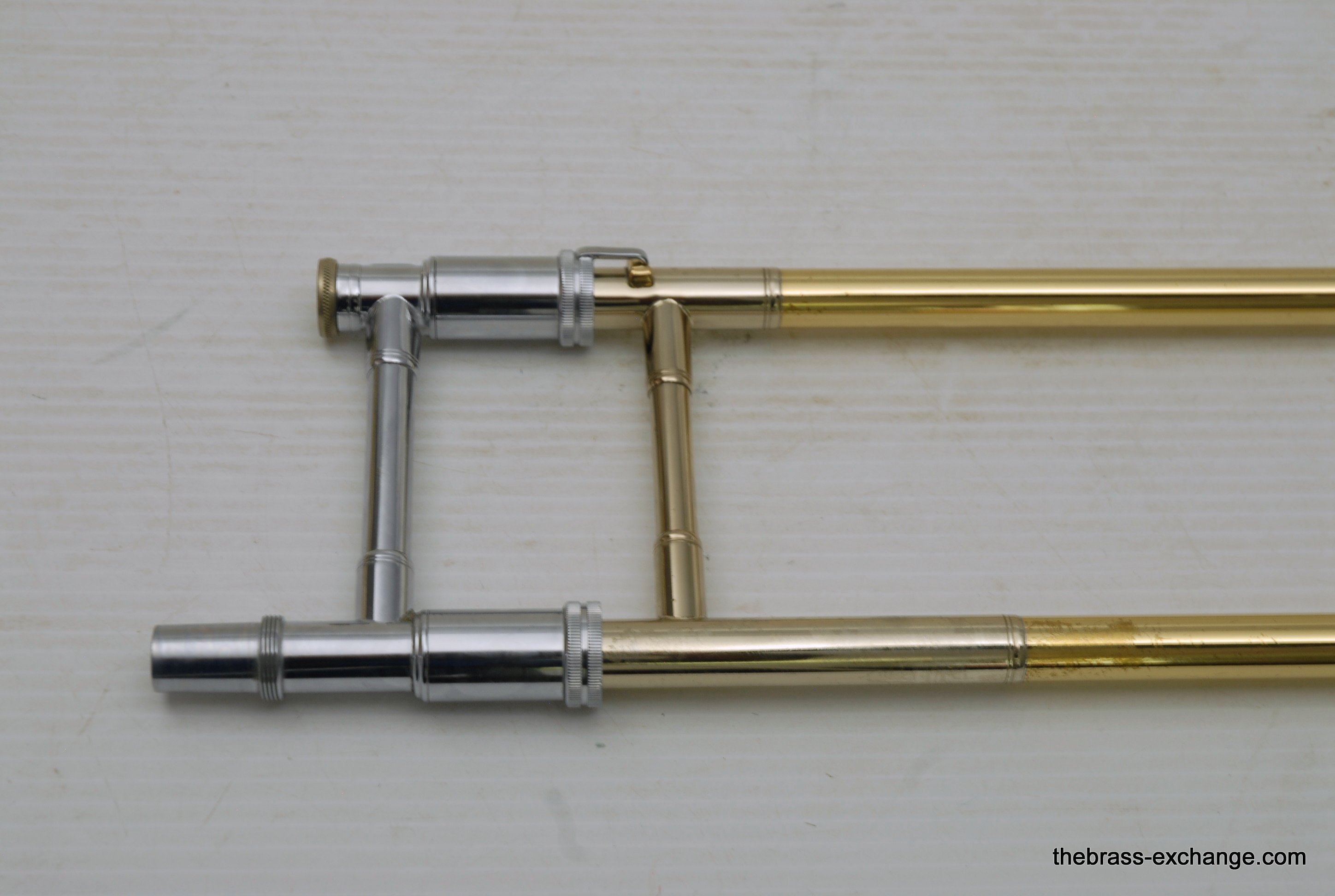 Thein Universal Bass Trombone. Made in Bremen, Germany. This is a pre-owned Bass with rose brass detachable bell flare, independent Hagmann valves with heavy valve caps, standard weight handslide, removable press fit leadpipe. The bell flare on this Thein is 1/2" less than the standard American made 9.5" bell. In this design, size doesn't matter. It plays huge with the 9" light weight rose brass bell with nickel silver garland around rim. Has lots of center and core. Gorgeous dark sound that will brighten up easily when asked too. The Hagmann valve play like a dream. The action feels like butter. Standard weight single bore .562 handslide. Handslide action is fantastic, plays super easy. Has had full shop service, chemical bath, valve serviced, slide adjusted. Really no room to imrove mechanical function, playability, or appearance. Will not dissapoint. Would be an amazing all around bass for all styles, including orchestra, commercial, studio, jazz. Compact flat case is about the size of a viola case, and is shaped like one too. This model Thein with detachable bell flare sells new for over 10K with limited avaialbility and long production time. If you are a pro player looking to travel with a detachable bell in a compact case, this is it. In-stock for immediate delivery.