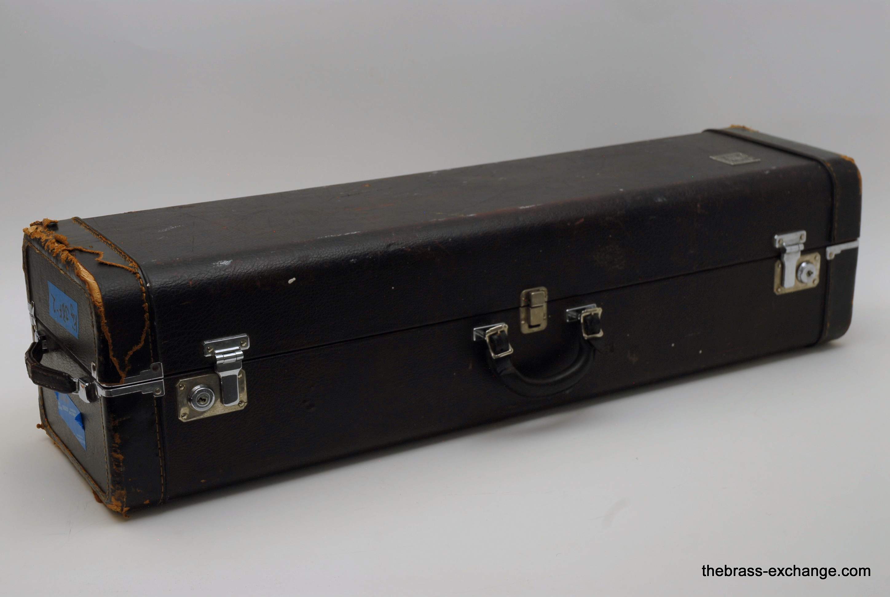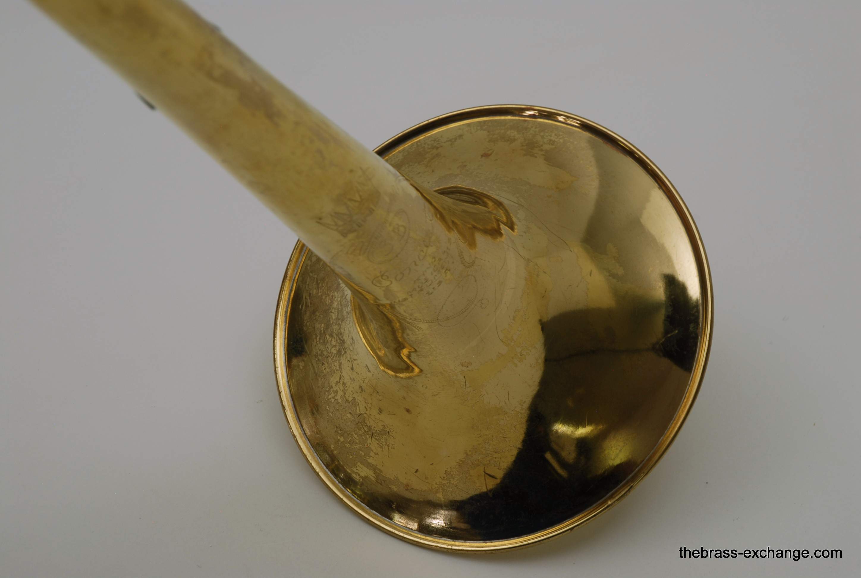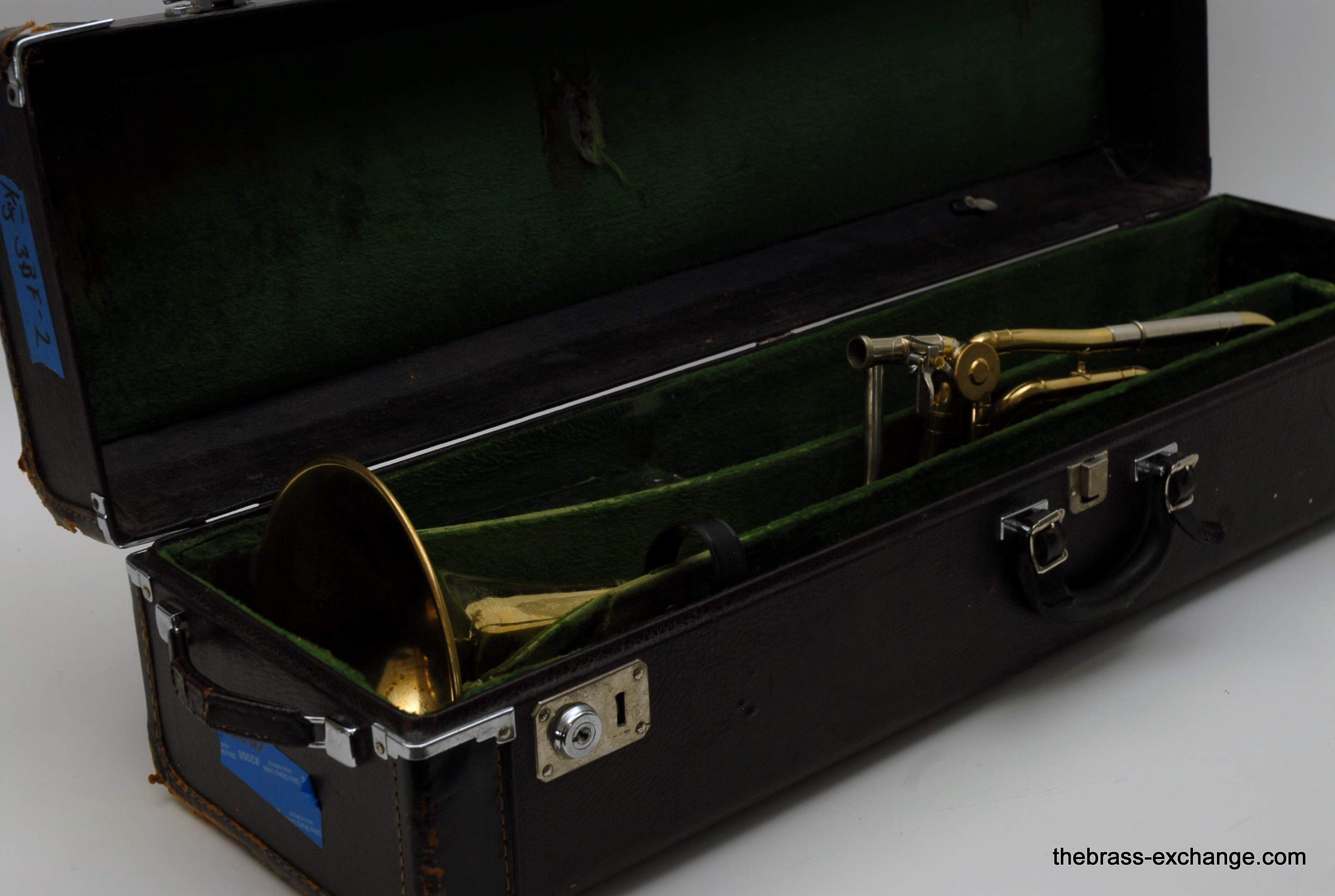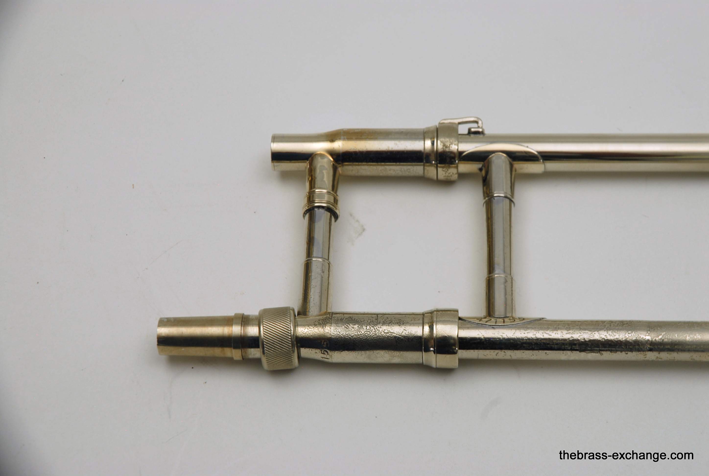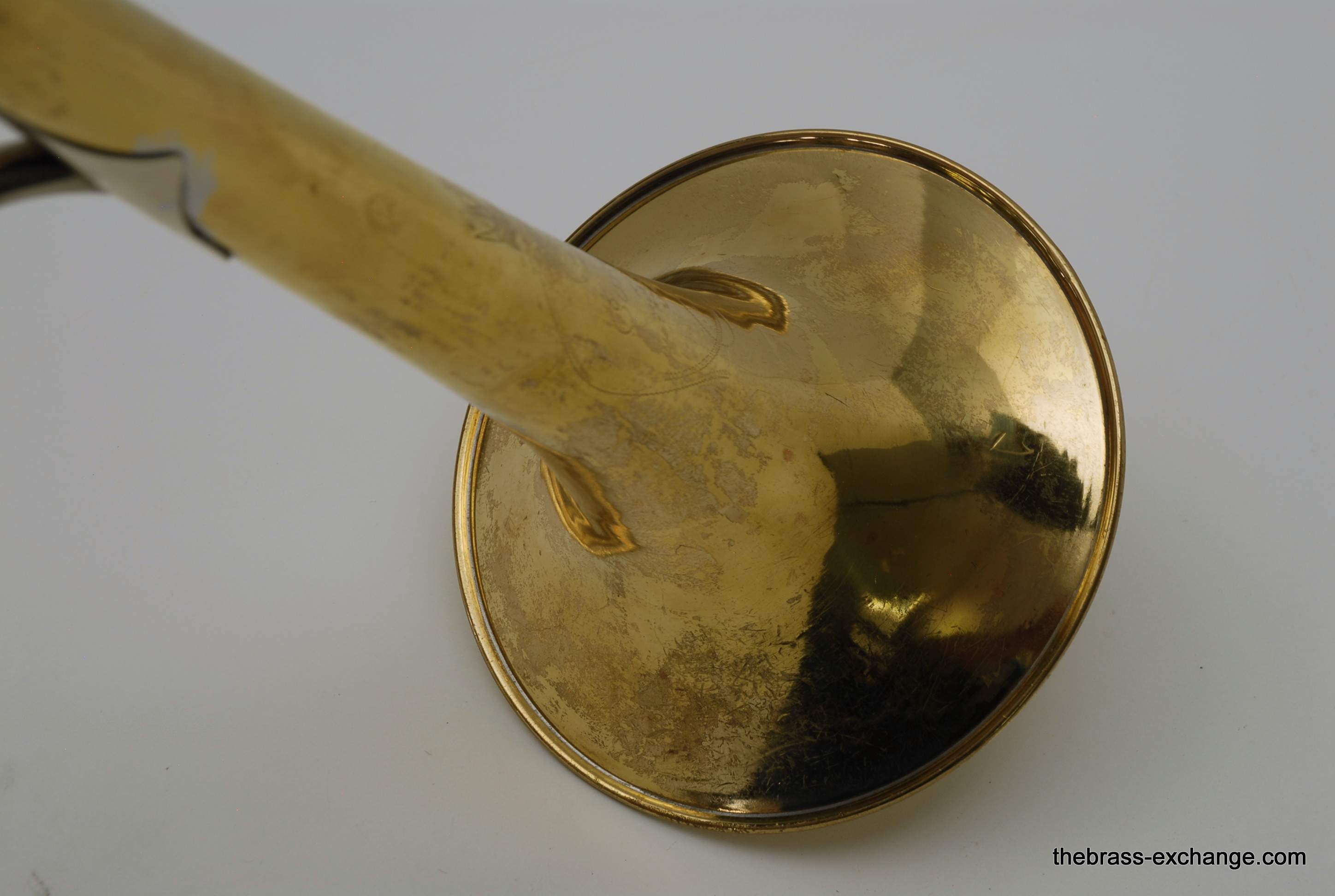 The instrument has already been serviced here and plays properly with good response throughout the range. The slide is very good—straight, quick, and comparable to many of the better 3B slides we see. There is evidence of prior repair and solder work done before arrival at our shop, and the lacquer shows wear and loss consistent with age. It is not the cleanest cosmetic example we have handled, and it is priced accordingly, but structurally it is solid and plays very well.