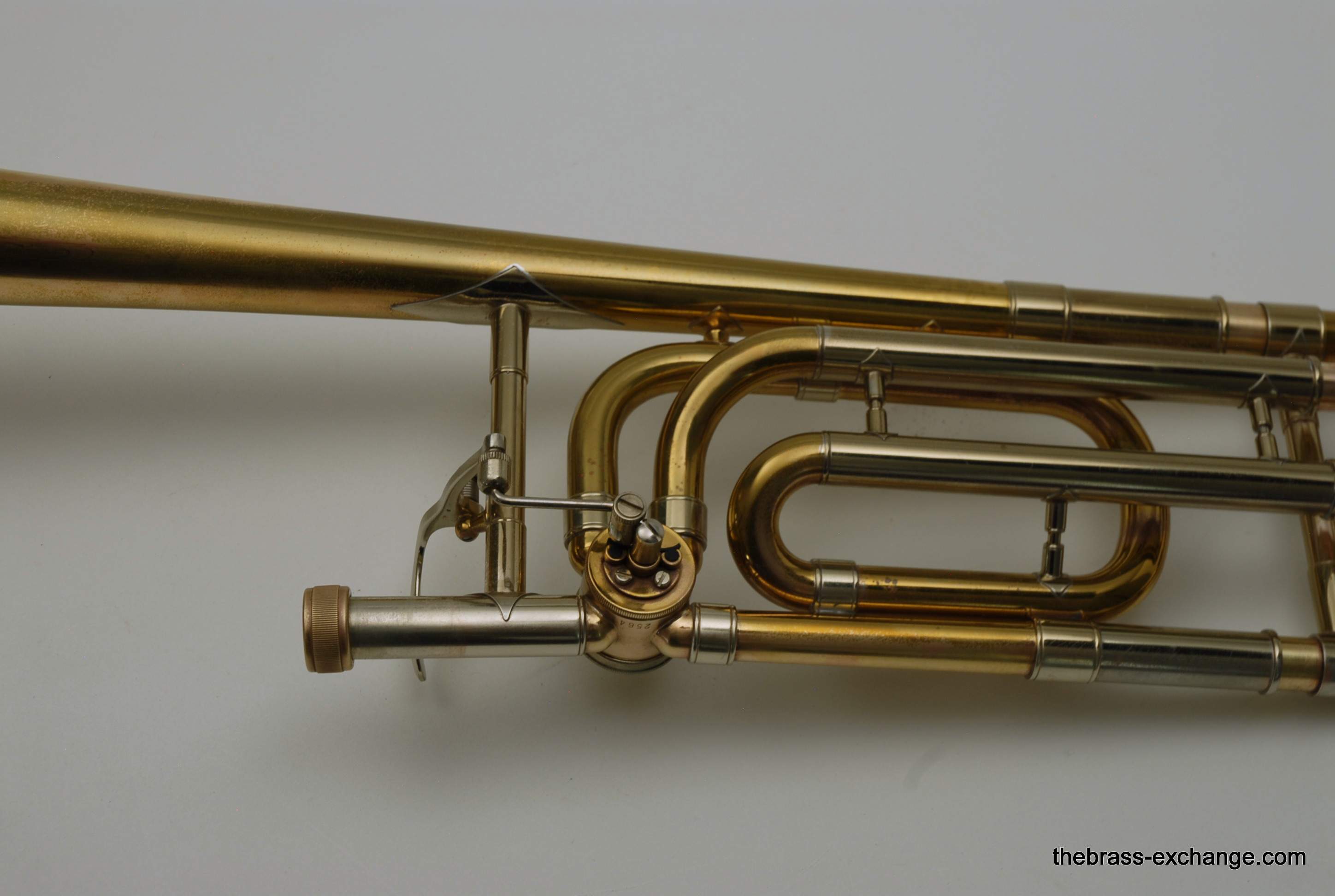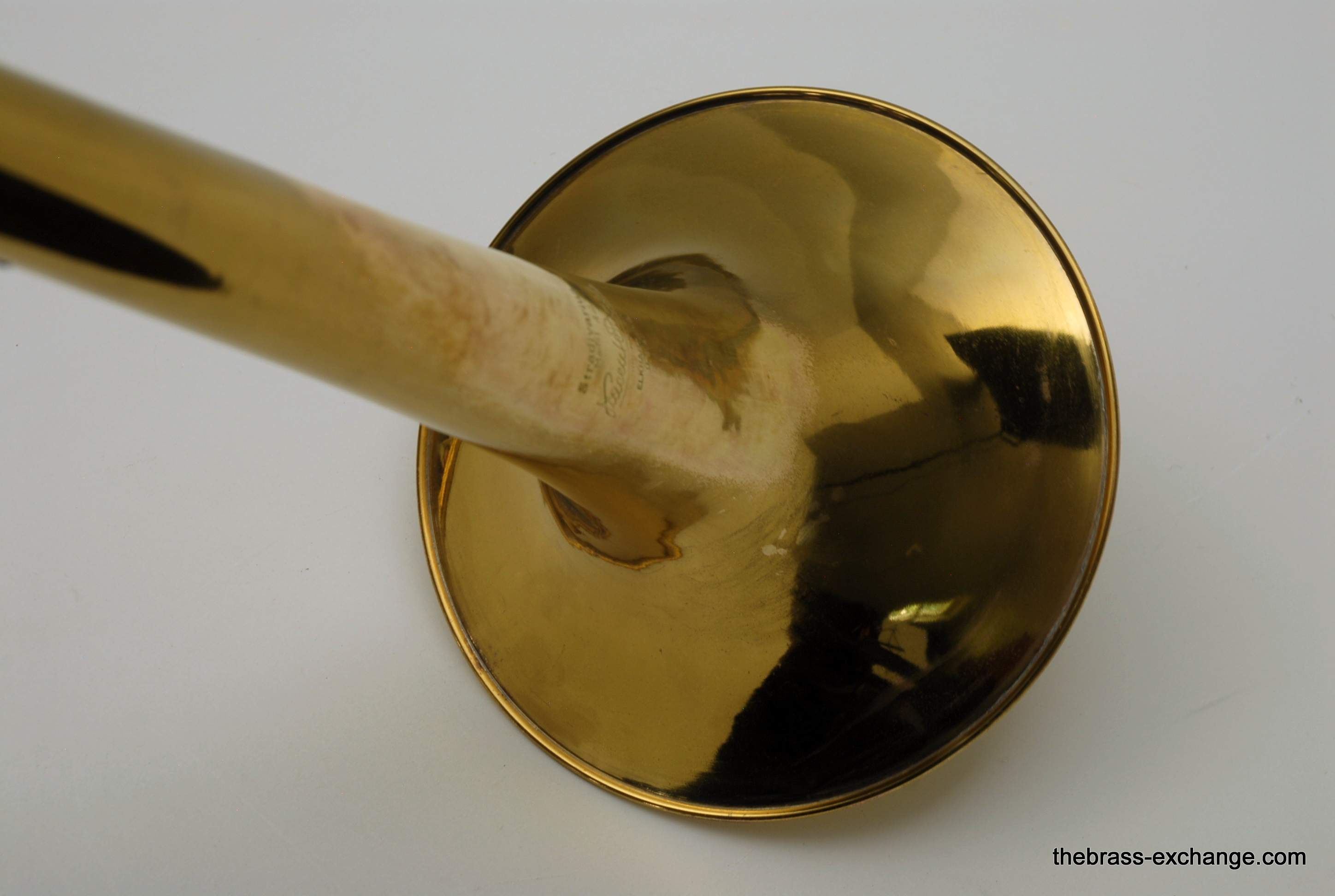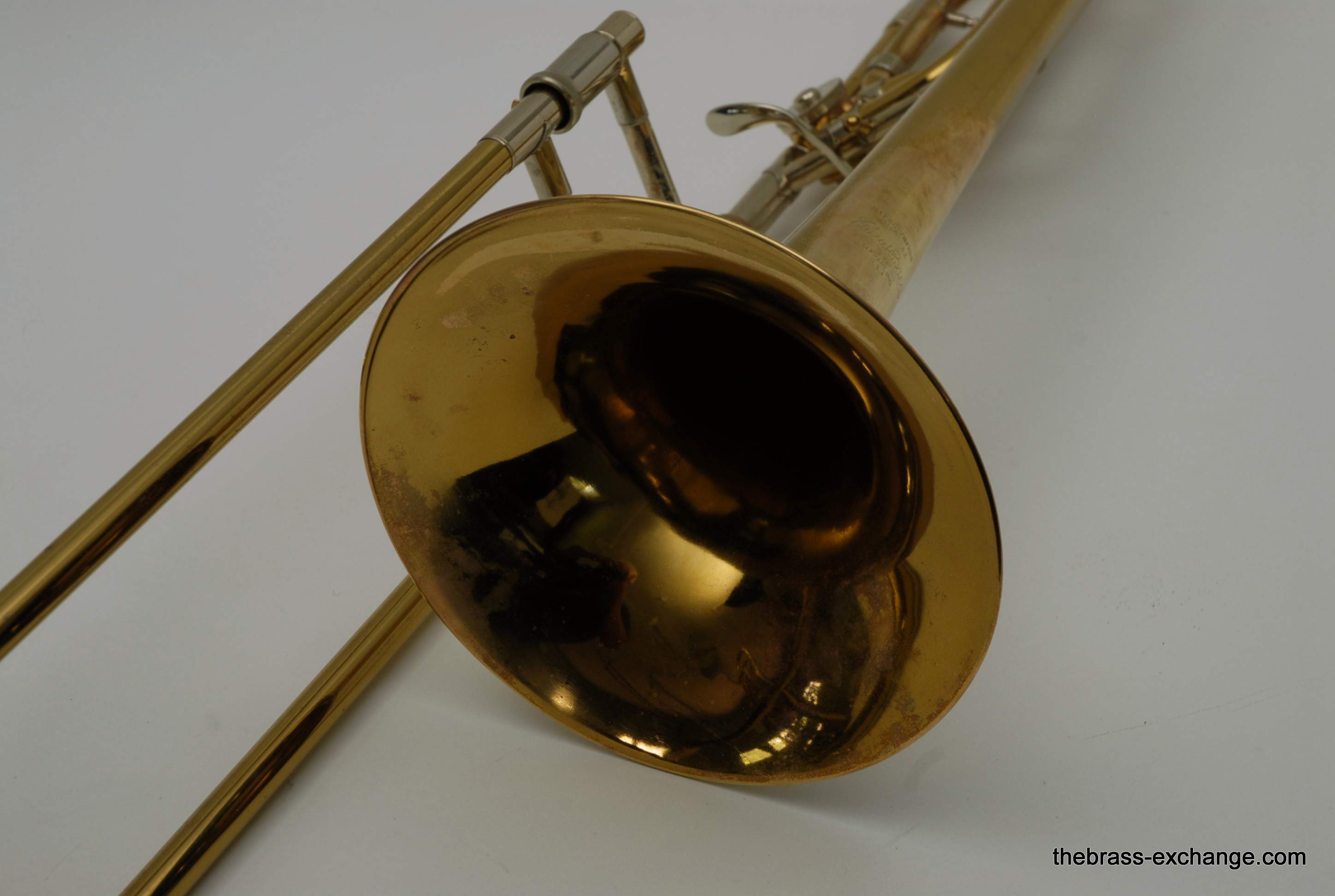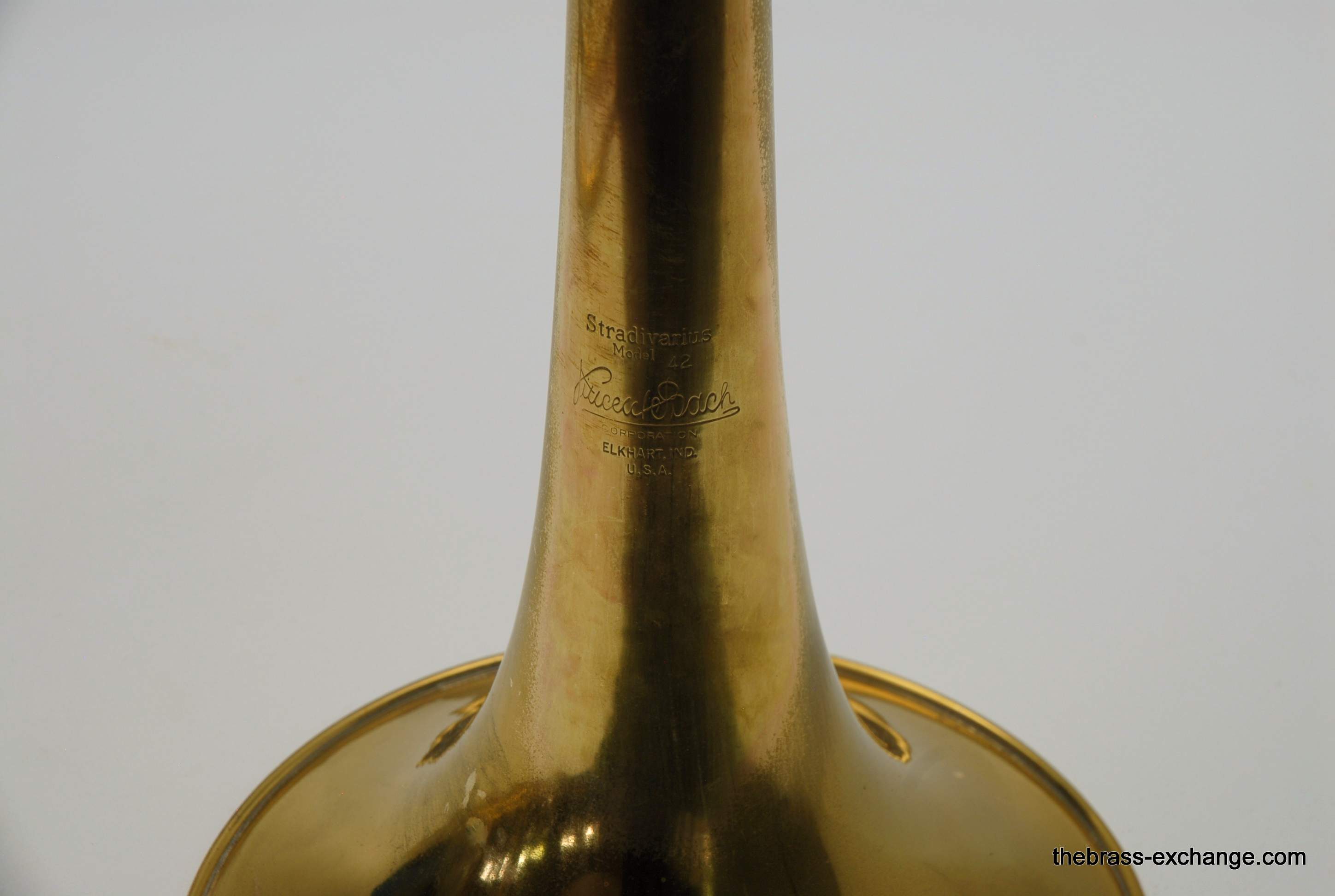 Bach 42B Corporation Era Vintage, SN 36270 made in the 1970's. We love being a vintage trombone shop because we get trombones like this one. Single owner horn, has been closet kept 30 or more years. Upon arrival here we did full shop service including chemical bath. The bell had a few dings in the flare and a small crease removed, which you can see lightly in the photo where the bell is flat on the table, is around the 8 o'clock position. Our guru did his brass magic and it came out nicely. This 42B is all original parts and lacquer. Definitely a great player. The handslide is very good. Moderate lacquer wear over the entire instrument, as Bach did not use long lasting durable lacquer in those days. Has the classic 8.5" yellow brass bell, standard weight .547 bore slide, no red rot or plating defects. It's a nice horn. Would be a perfect choice for an advancing student looking for the classic Bach sound. The 42B remains one of the most popular large bore tenor choices of all time. Once you play on them you get hooked. IF I had high school student today looking for that first pro level horn, but not ready for 5K+ this is my top recommendation. Original case in superior condition. Mouthpiece not included.