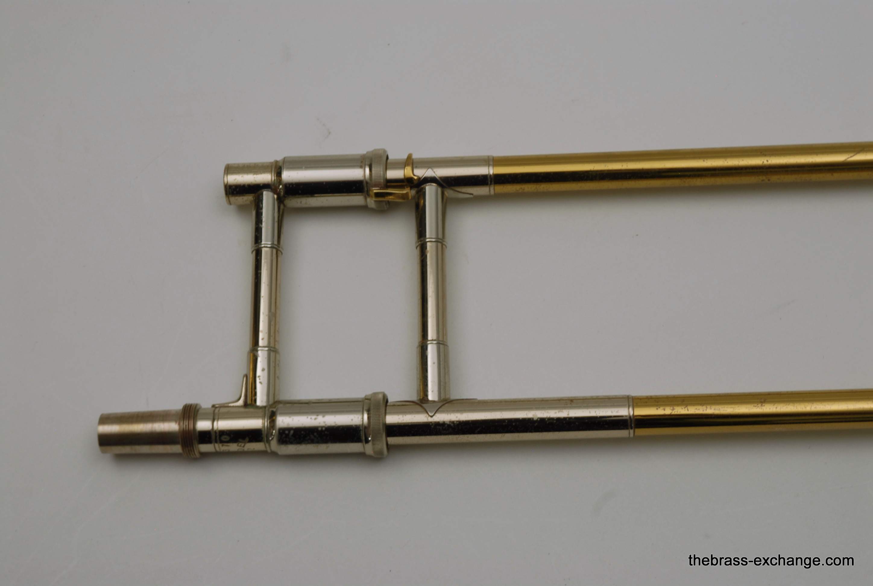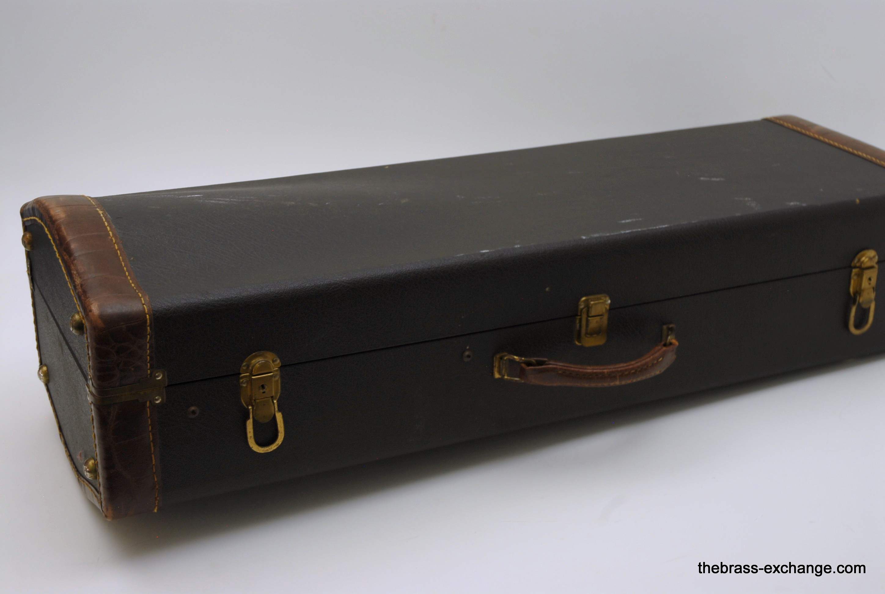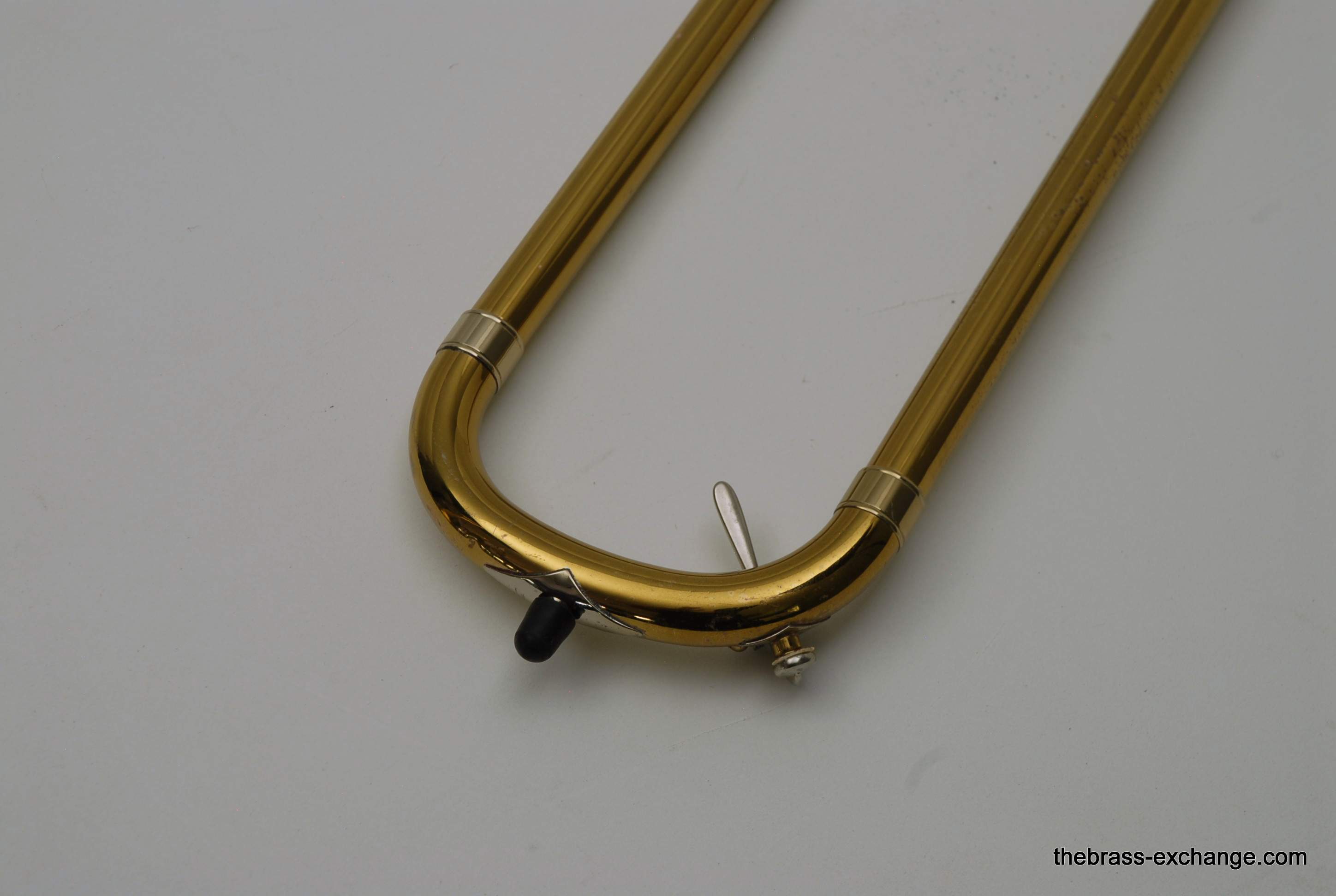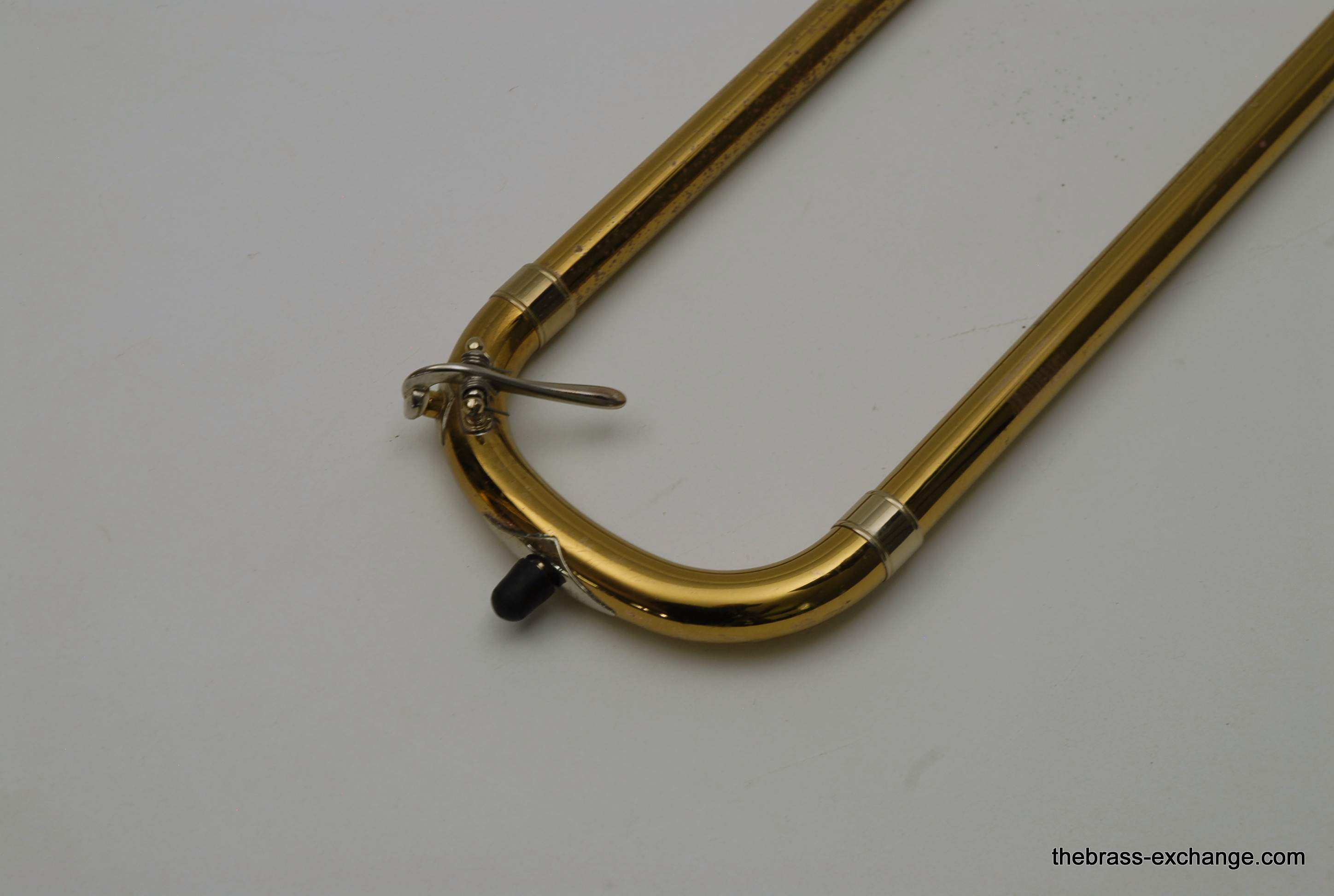 Bach 42B Corporation Era Vintage, SN 36270 made in the 1970's. We love being a vintage trombone shop because we get trombones like this one. Single owner horn, has been closet kept 30 or more years. Upon arrival here we did full shop service including chemical bath. The bell had a few dings in the flare and a small crease removed, which you can see lightly in the photo where the bell is flat on the table, is around the 8 o'clock position. Our guru did his brass magic and it came out nicely. This 42B is all original parts and lacquer. Definitely a great player. The handslide is very good. Moderate lacquer wear over the entire instrument, as Bach did not use long lasting durable lacquer in those days. Has the classic 8.5" yellow brass bell, standard weight .547 bore slide, no red rot or plating defects. It's a nice horn. Would be a perfect choice for an advancing student looking for the classic Bach sound. The 42B remains one of the most popular large bore tenor choices of all time. Once you play on them you get hooked. IF I had high school student today looking for that first pro level horn, but not ready for 5K+ this is my top recommendation. Original case in superior condition. Mouthpiece not included.