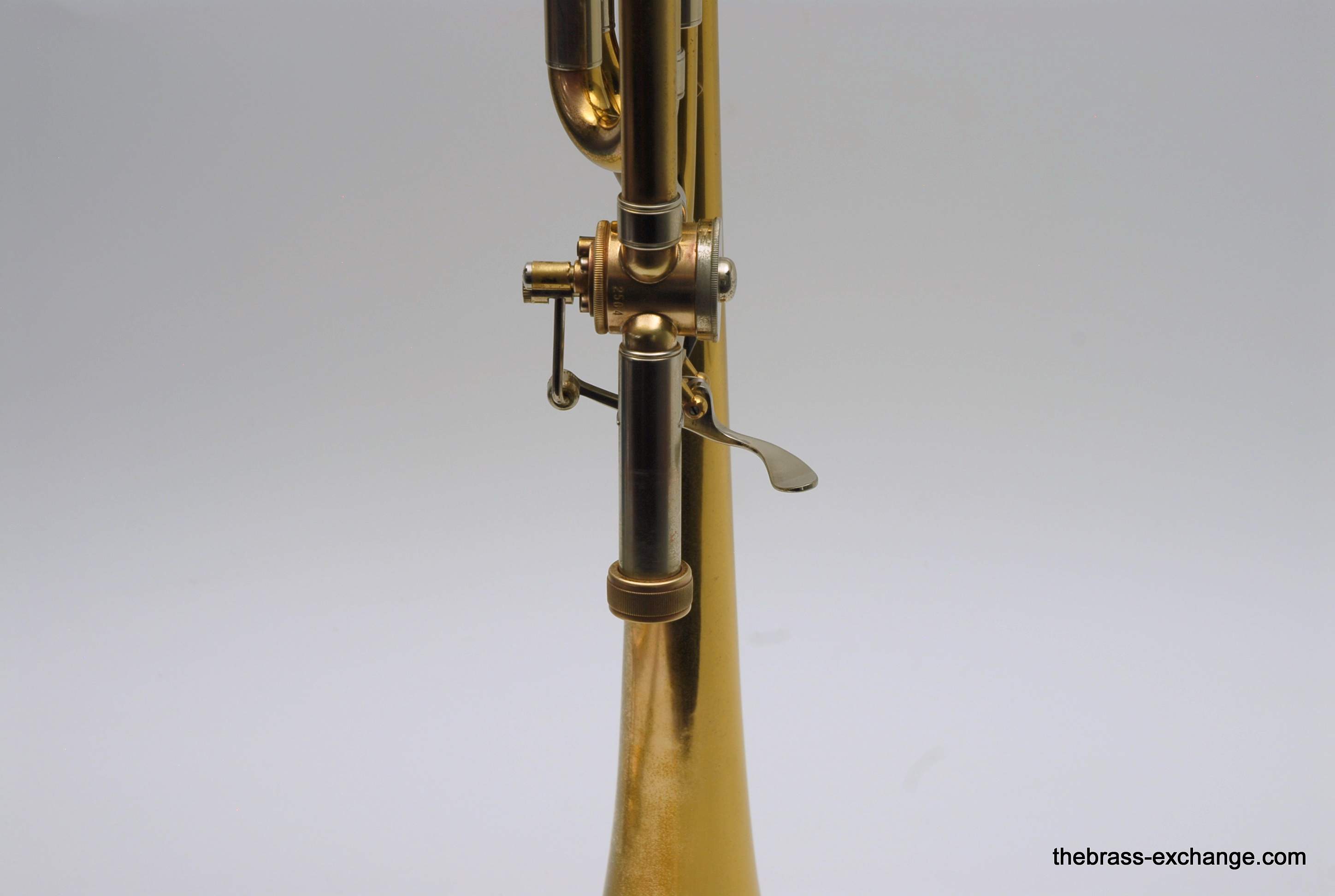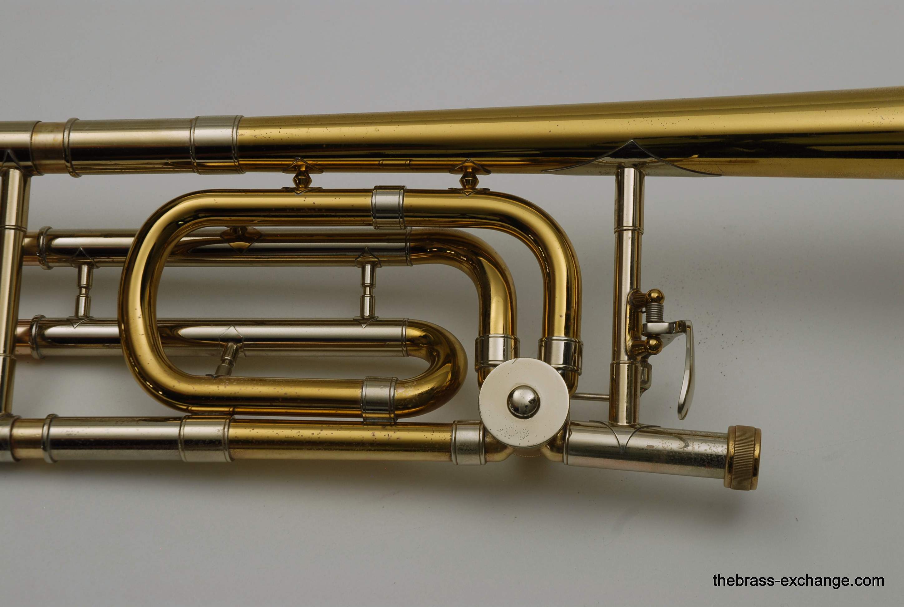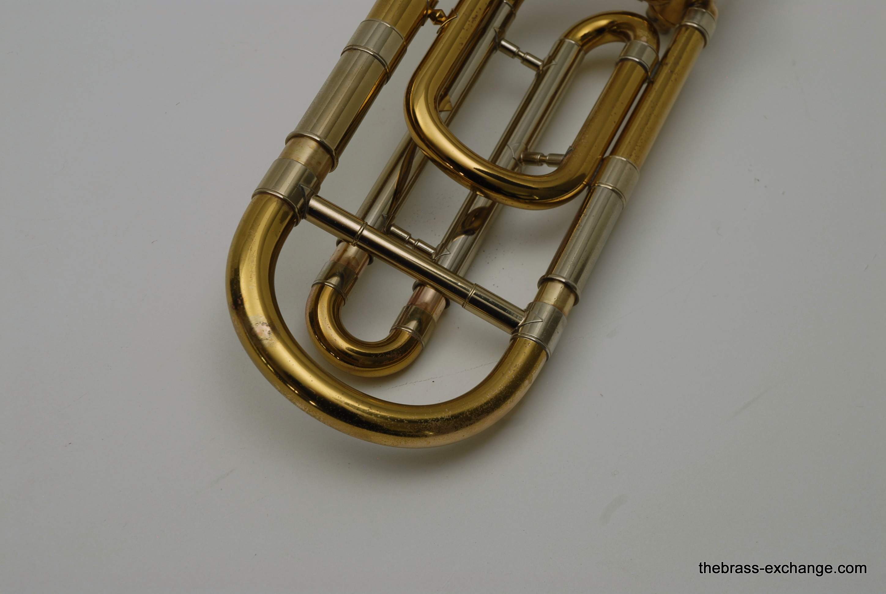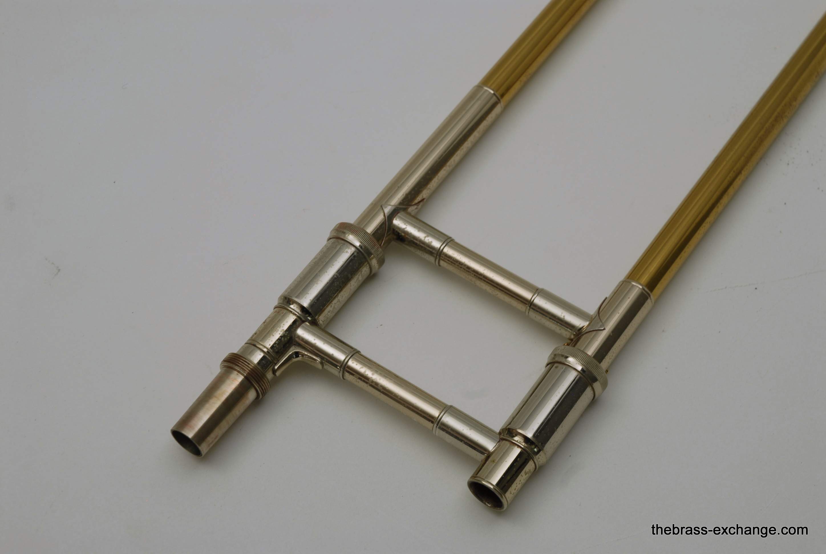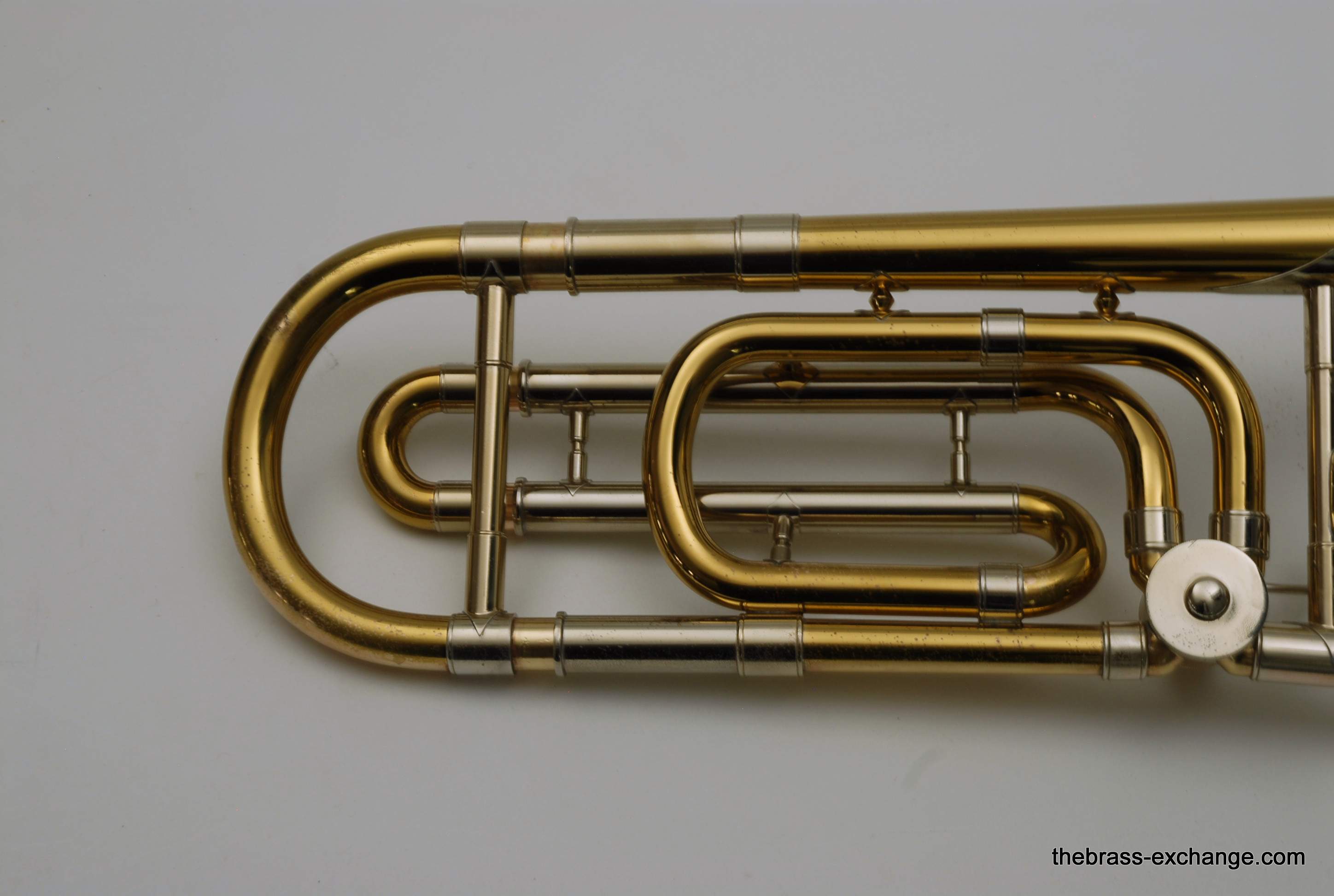 Bach 42B Corporation Era Vintage, SN 36270 made in the 1970's. We love being a vintage trombone shop because we get trombones like this one. Single owner horn, has been closet kept 30 or more years. Upon arrival here we did full shop service including chemical bath. The bell had a few dings in the flare and a small crease removed, which you can see lightly in the photo where the bell is flat on the table, is around the 8 o'clock position. Our guru did his brass magic and it came out nicely. This 42B is all original parts and lacquer. Definitely a great player. The handslide is very good. Moderate lacquer wear over the entire instrument, as Bach did not use long lasting durable lacquer in those days. Has the classic 8.5" yellow brass bell, standard weight .547 bore slide, no red rot or plating defects. It's a nice horn. Would be a perfect choice for an advancing student looking for the classic Bach sound. The 42B remains one of the most popular large bore tenor choices of all time. Once you play on them you get hooked. IF I had high school student today looking for that first pro level horn, but not ready for 5K+ this is my top recommendation. Original case in superior condition. Mouthpiece not included.