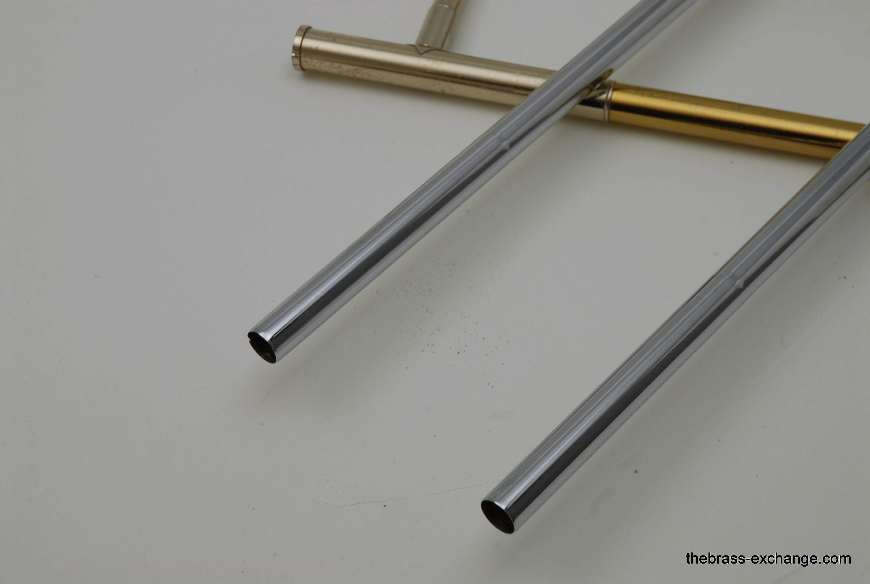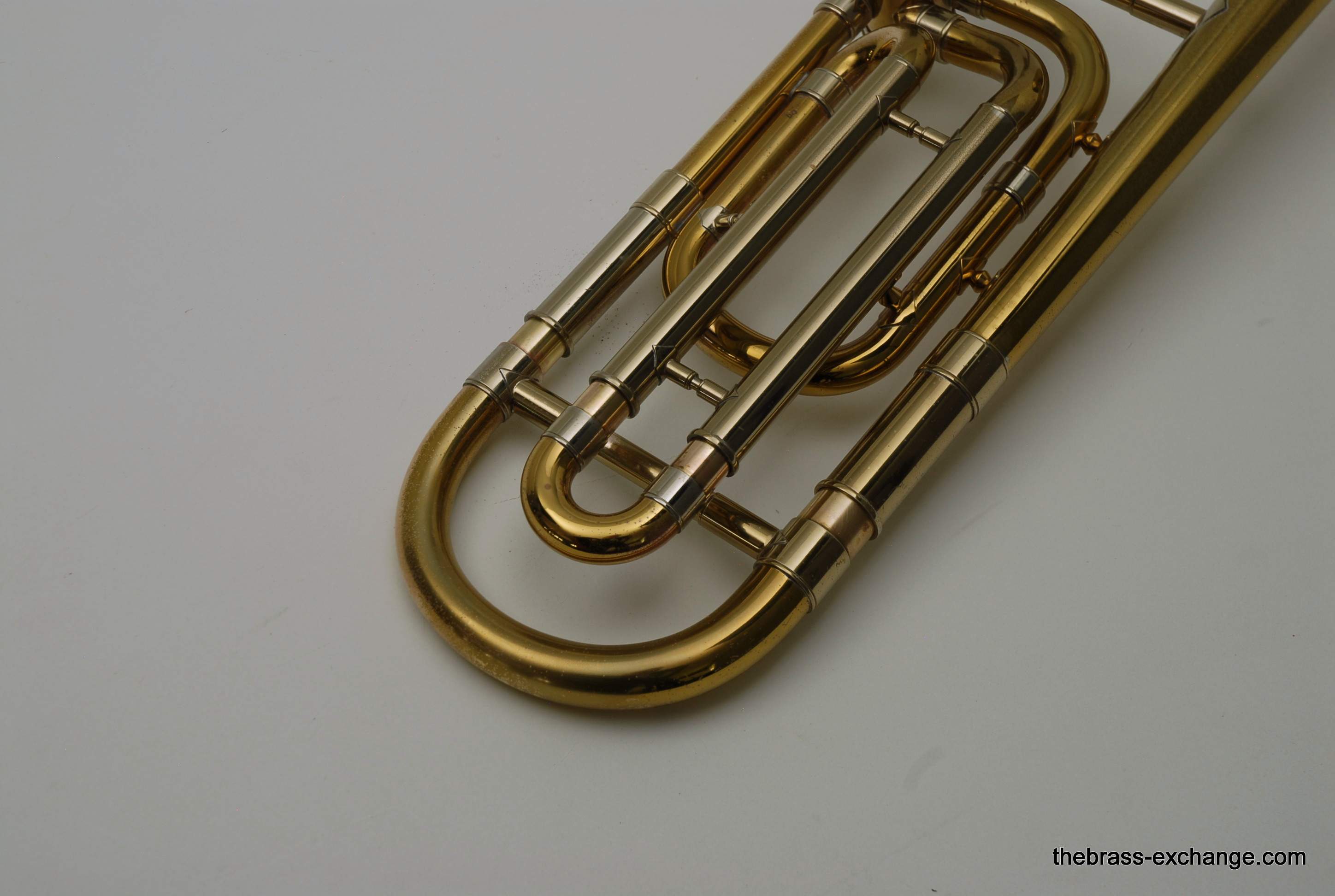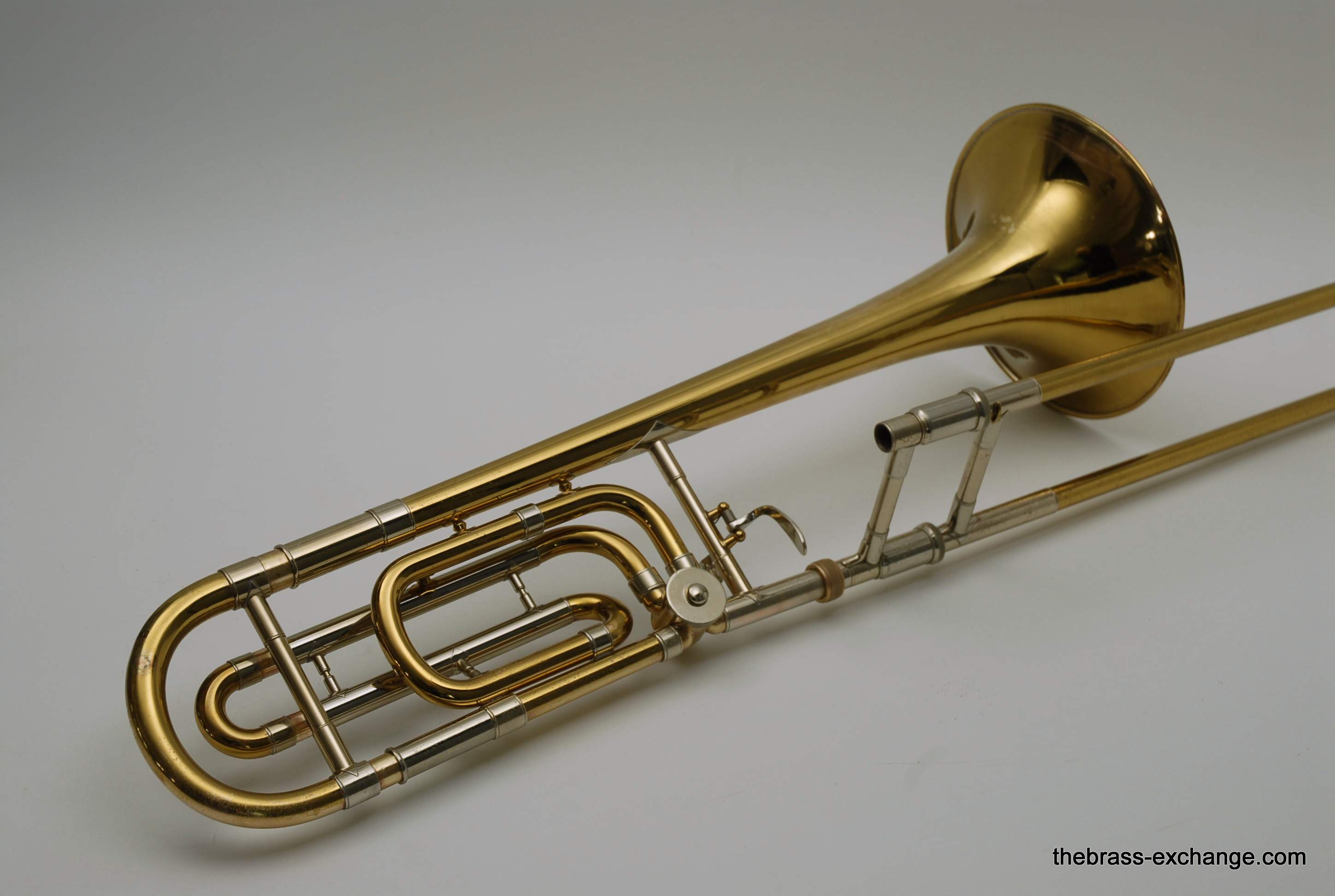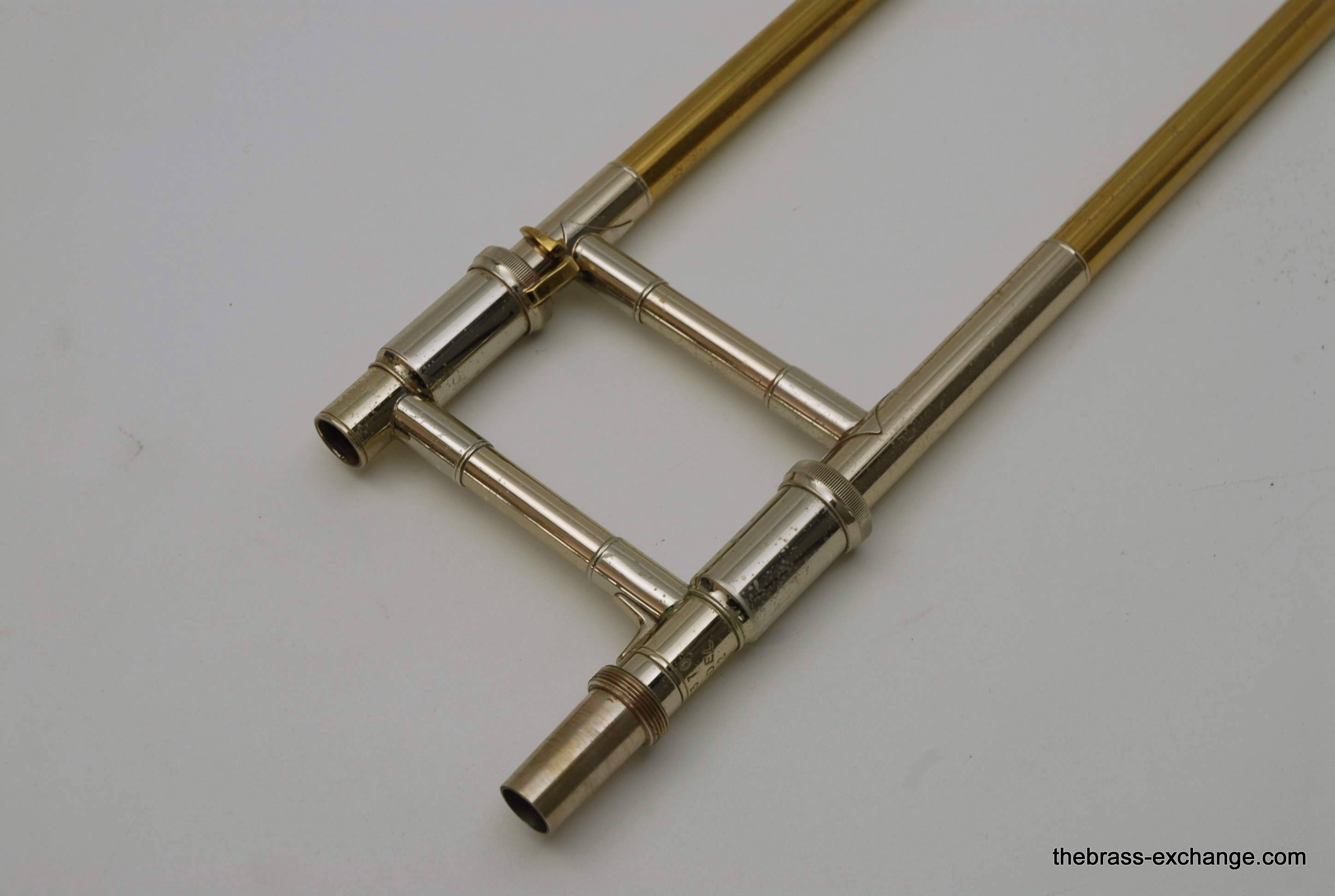Bach 42B Corporation Era Vintage, SN 36270 made in the 1970's. We love being a vintage trombone shop because we get trombones like this one. Single owner horn, has been closet kept 30 or more years. Upon arrival here we did full shop service including chemical bath. The bell had a few dings in the flare and a small crease removed, which you can see lightly in the photo where the bell is flat on the table, is around the 8 o'clock position. Our guru did his brass magic and it came out nicely. This 42B is all original parts and lacquer. Definitely a great player. The handslide is very good. Moderate lacquer wear over the entire instrument, as Bach did not use long lasting durable lacquer in those days. Has the classic 8.5" yellow brass bell, standard weight .547 bore slide, no red rot or plating defects. It's a nice horn. Would be a perfect choice for an advancing student looking for the classic Bach sound. The 42B remains one of the most popular large bore tenor choices of all time. Once you play on them you get hooked. IF I had high school student today looking for that first pro level horn, but not ready for 5K+ this is my top recommendation. Original case in superior condition. Mouthpiece not included.