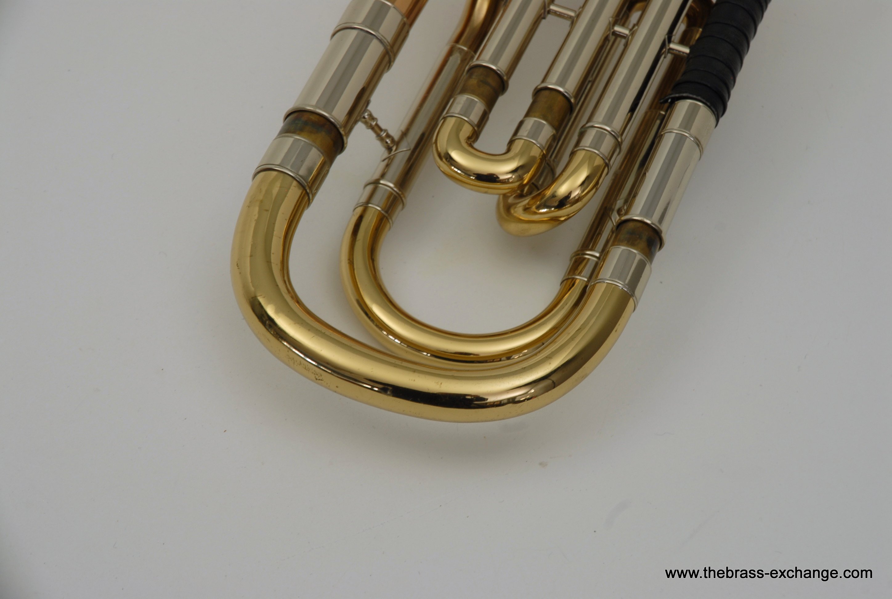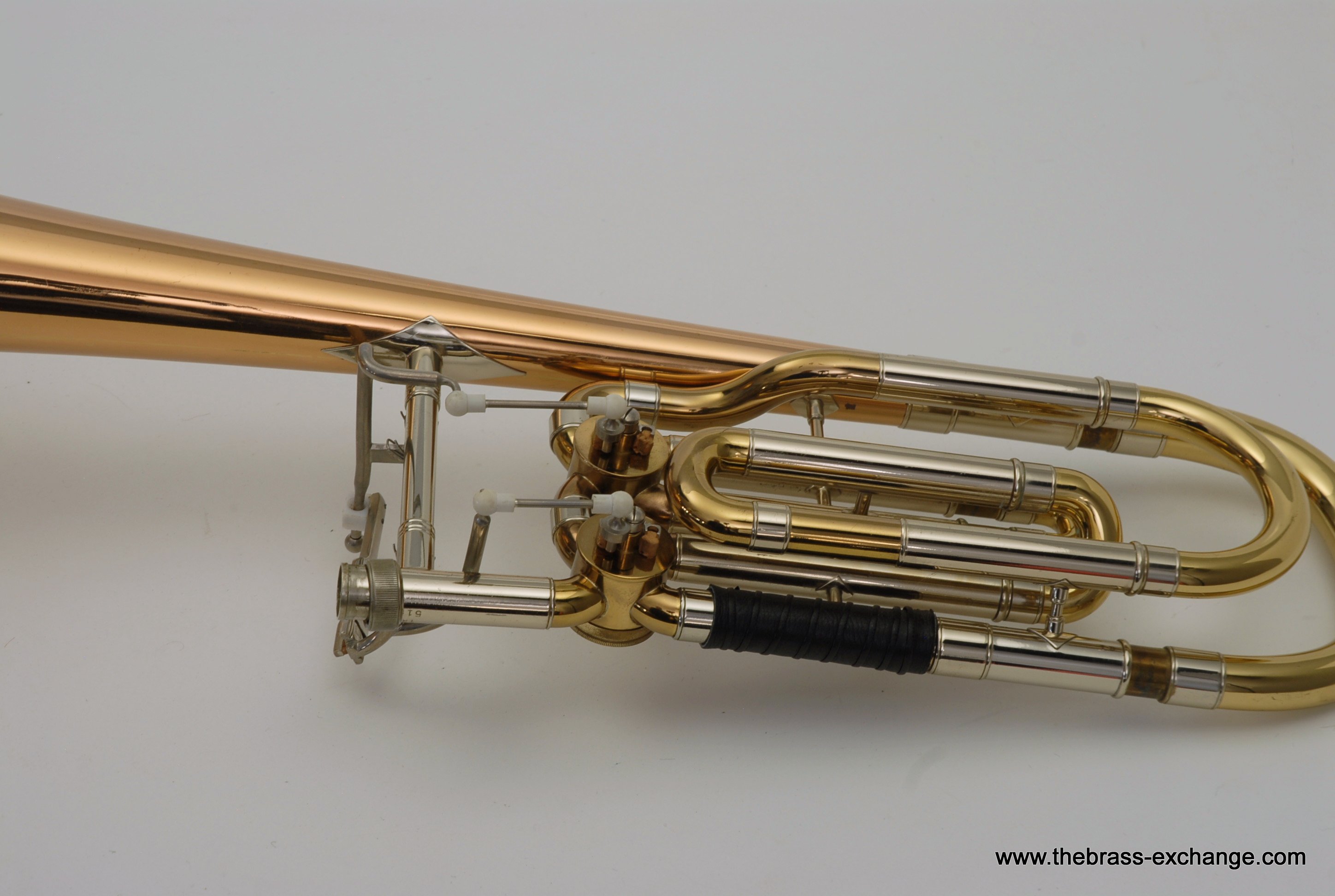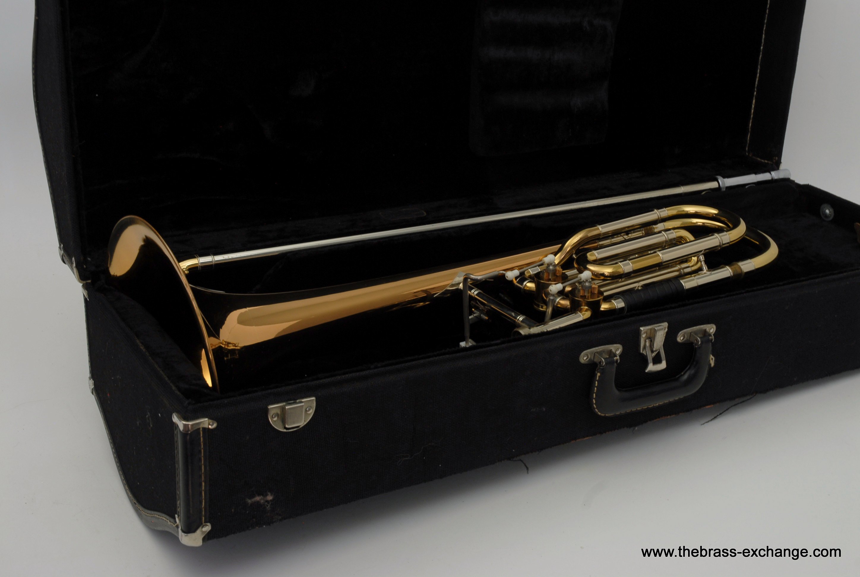 Holton TR180 Bass Trombone SN 515622 Made around 1972, Elkhorn, WI. Excellent condition TR180, Single Owner Bass. Has rose brass bell, just a little under 10", around 9.85". Has had no prior damage or repairs, and is all original parts and lacquer. Is in amazing shape for it's age. Dependent tuning Bb/F/Eb. Glantz Bar single lever. Here is how it works: When you pull the F lever you get C or F in First position, just like all other Bass Trombones. Then to play low Eb in first, you move your thumb slightly to the left and both valves engage. This puts low B around 6th position. Excellent choice for anyone looking to learn to play bass on a proper instrument. Some players like to split the valves and add a D slide. It actually works really nice when converted properly. But, we are offering it as is. Has an excellent handslide and is without defects, no inner tube plating loss. Has leather slide grip and leather neck guard already installed. Includes original clean case, two Schilke mouthpieces, and multiple accessory kits for for maintenance and cleaning. Would be an excellent Bass for anyone looking for the Classic Holton make/sound, or for anyone wanting to play bass but not ready to go up to current new prices in the 5-8K Range. This TR180 will not disappoint.