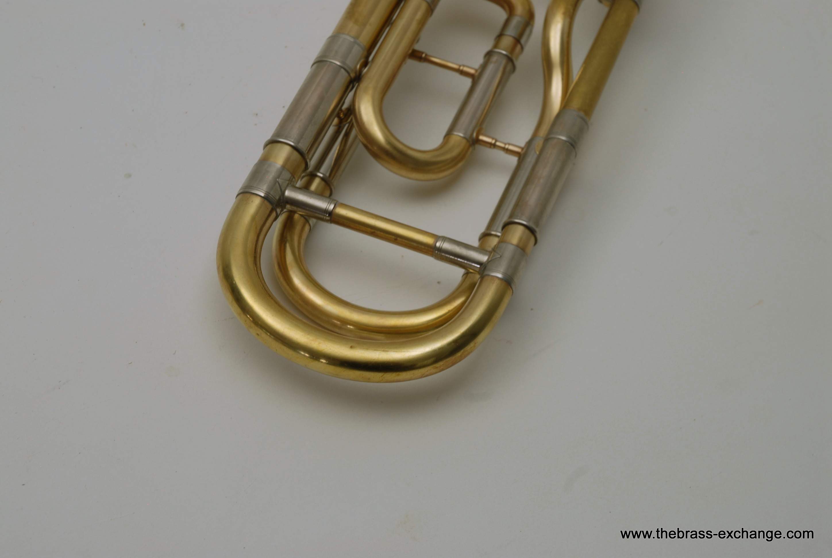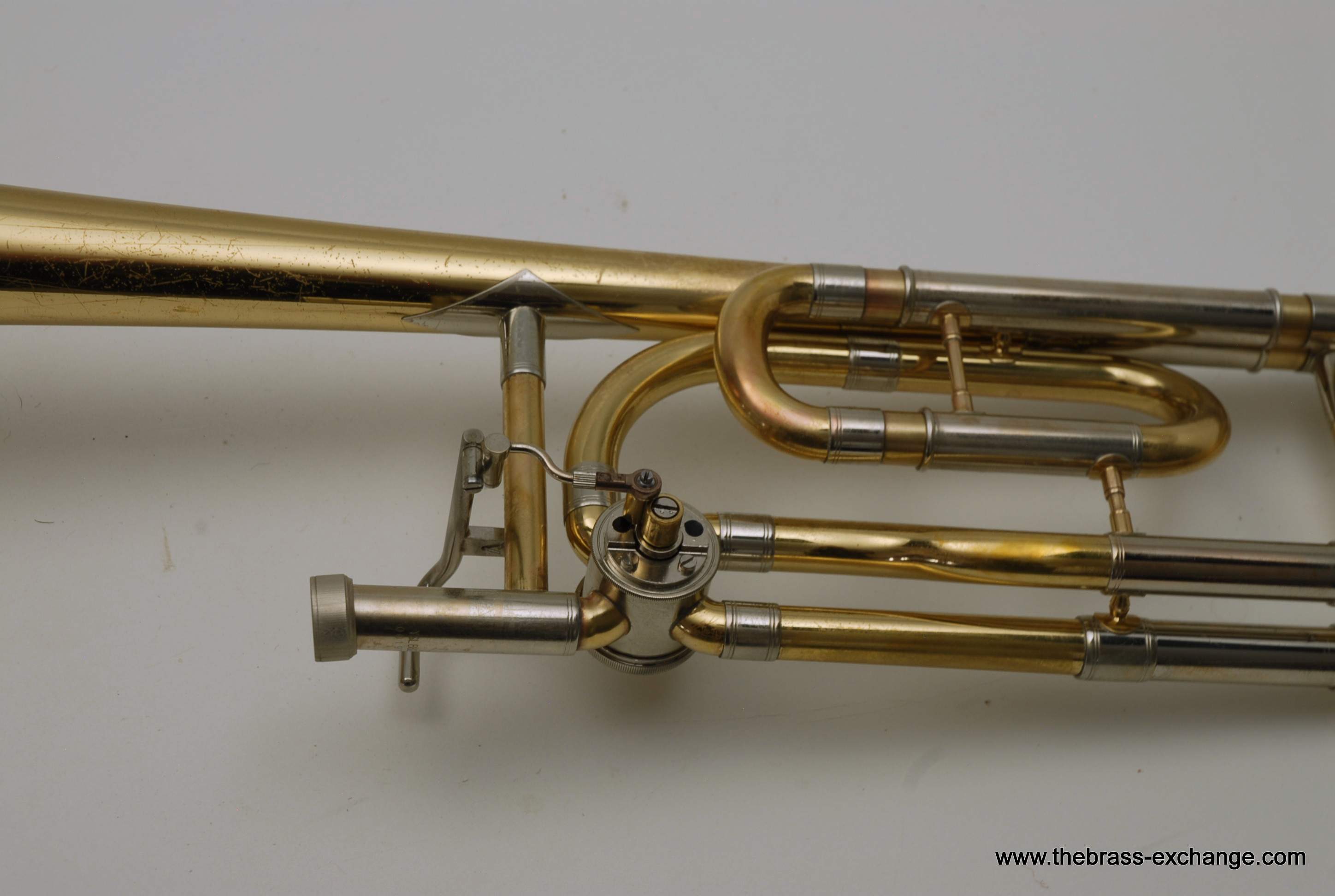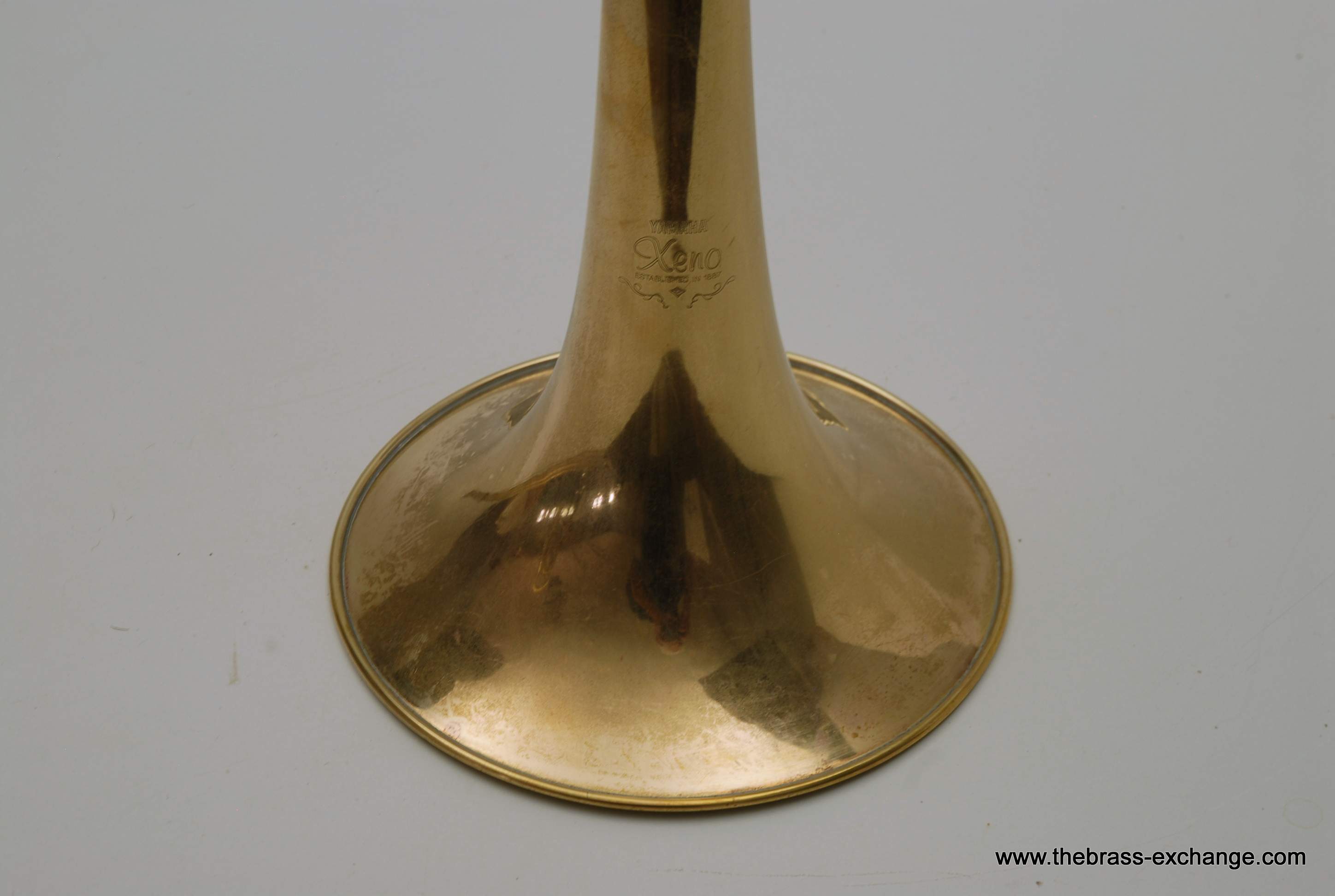 Professional Yamaha Trombone Xeno Model YSL-882. Pre-owned Large bore tenor .547 with 8.5" Xeno Bell, Traditional Rotor, .547 Bore wide slide. Is very similar to the YSL-882O Xeno model that sells new today for over $3900. The primary difference is the valve wrap. This is the traditional wrap. The F tuning slide does not extend past the main tuning slide, which makes it a more compact instrument, perfect for tight band set-ups where there isn't much room behind you. But, even if it is not a tight band set up space, it is still nice to play on a Xeno valve regardless of traditional vs. Open wrap. For students that are moving up to a large tenor from a starter horn without F attachment this is a great choice. Open wrap vs. Trad wrap is not an issue in my opinion for younger players that have yet to develop as players. The valve wrap will not make them play better. This is a very sensible choice for any player not looking to move up to a $3900 purchase. Has had full shop service here, including chemical bath and one over. No dents or dings. Handslide is very good and plays proper. Some fading and lacquer wear on bell, but still looks pretty good. Includes Yamaha Professional Xeno flight case. Mouthpiece also included. Save Now! Play Pro Level!
