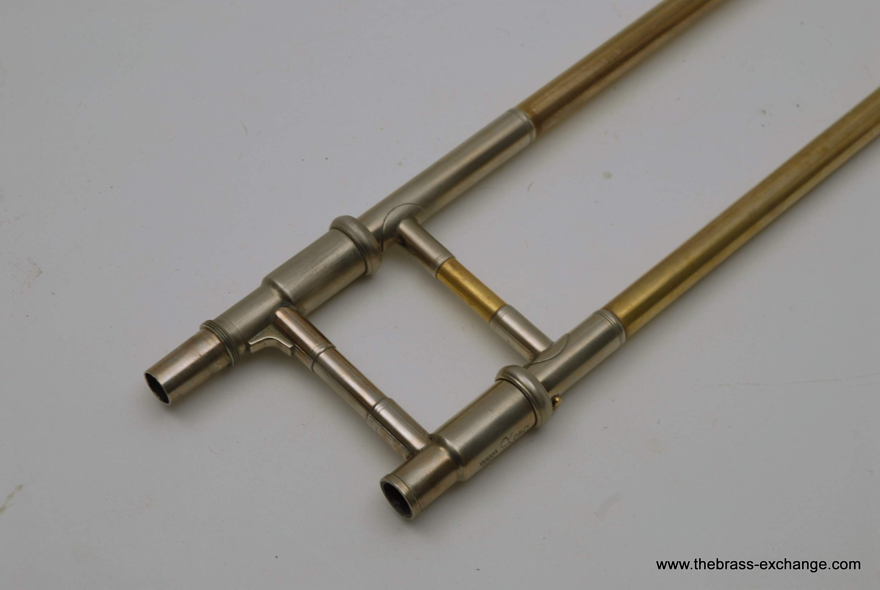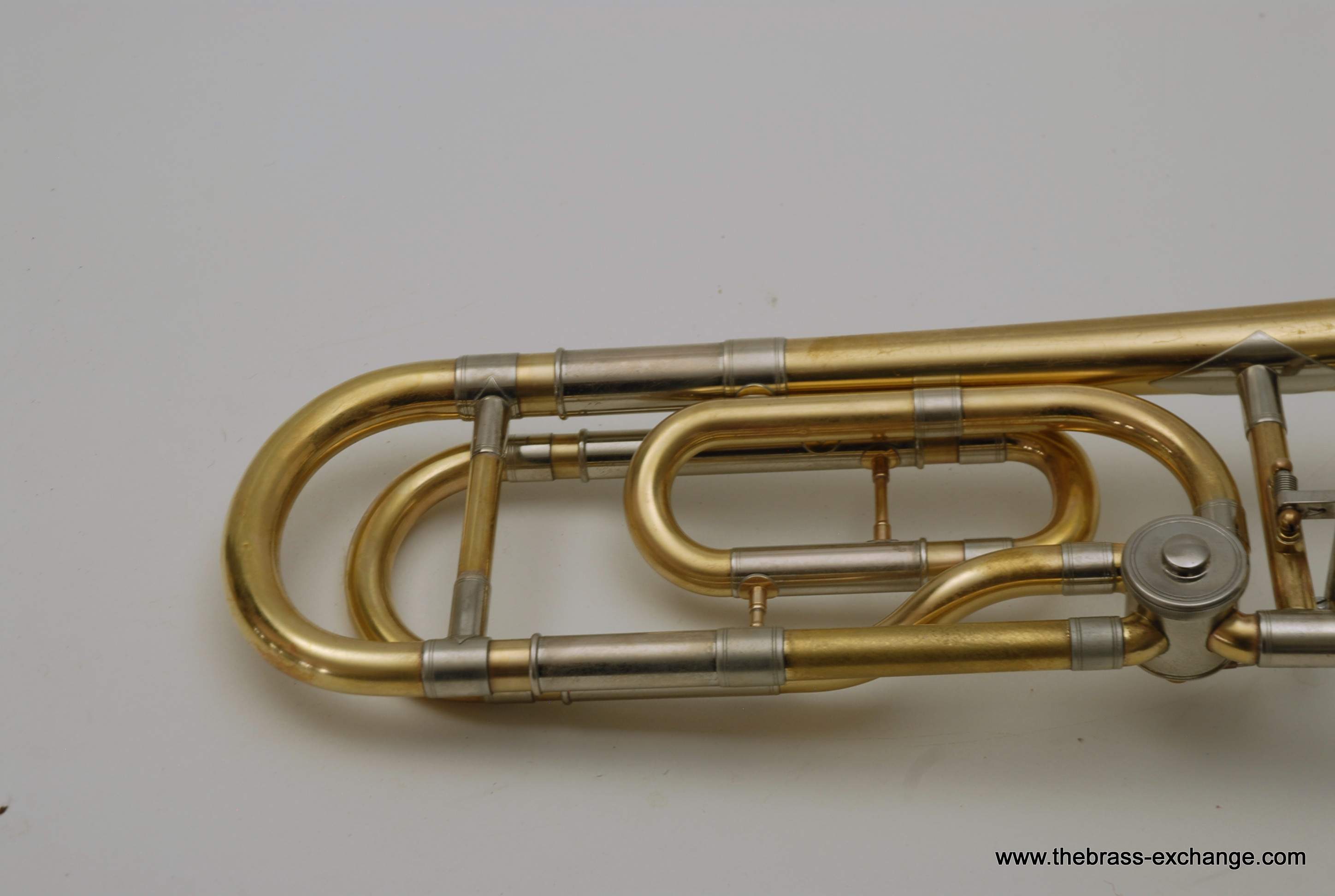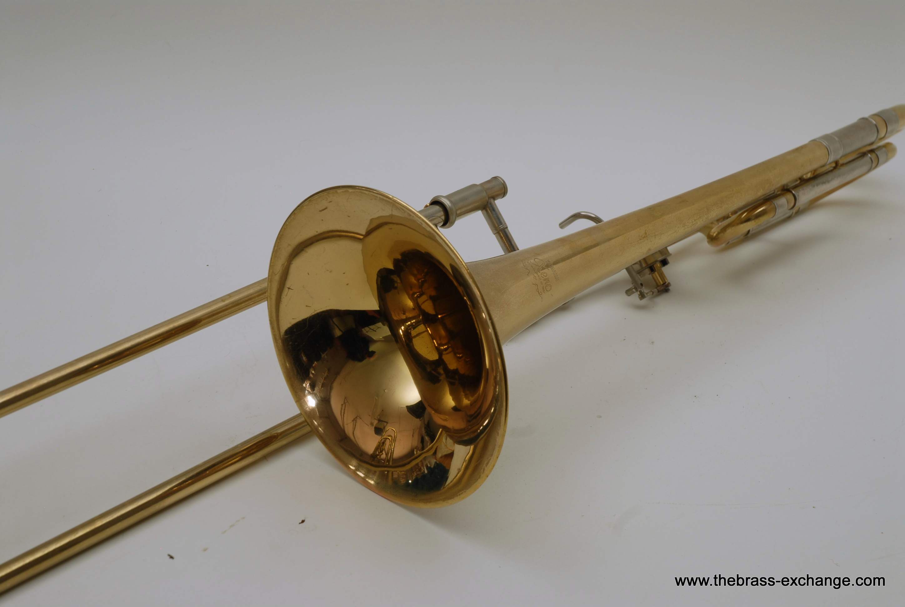 Professional Yamaha Trombone Xeno Model YSL-882. Pre-owned Large bore tenor .547 with 8.5" Xeno Bell, Traditional Rotor, .547 Bore wide slide. Is very similar to the YSL-882O Xeno model that sells new today for over $3900. The primary difference is the valve wrap. This is the traditional wrap. The F tuning slide does not extend past the main tuning slide, which makes it a more compact instrument, perfect for tight band set-ups where there isn't much room behind you. But, even if it is not a tight band set up space, it is still nice to play on a Xeno valve regardless of traditional vs. Open wrap. For students that are moving up to a large tenor from a starter horn without F attachment this is a great choice. Open wrap vs. Trad wrap is not an issue in my opinion for younger players that have yet to develop as players. The valve wrap will not make them play better. This is a very sensible choice for any player not looking to move up to a $3900 purchase. Has had full shop service here, including chemical bath and one over. No dents or dings. Handslide is very good and plays proper. Some fading and lacquer wear on bell, but still looks pretty good. Includes Yamaha Professional Xeno flight case. Mouthpiece also included. Save Now! Play Pro Level!