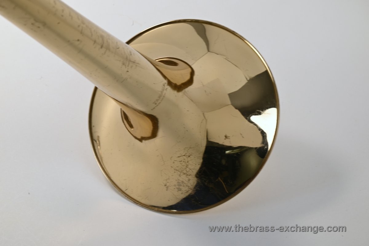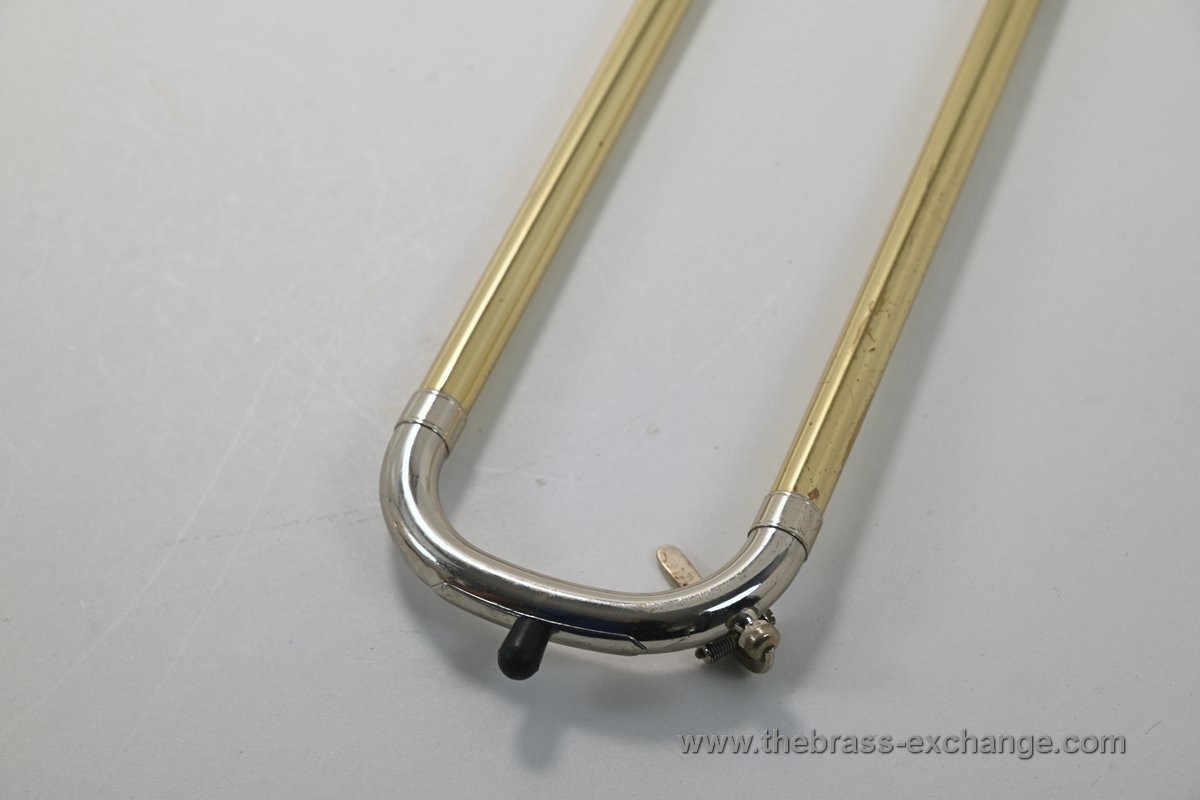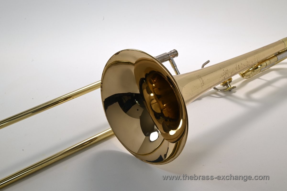 There are no dents or dings, and the overall appearance is good considering its age and use. You will notice some lacquer wear on the outer slide grip areas, neck area, and tuning slides, along with some surface scratches and lacquer loss on the bell. We have improved the cosmetics as much as possible without performing a full re-lacquer, which is not recommended at this price point.