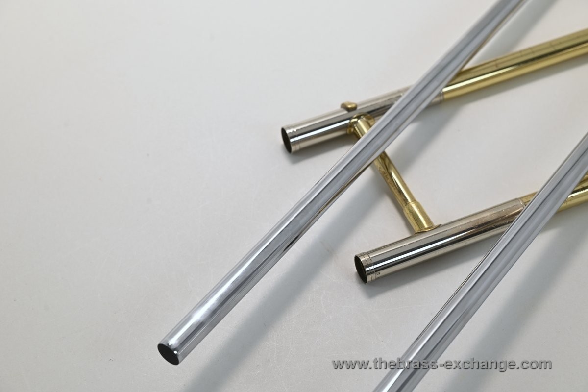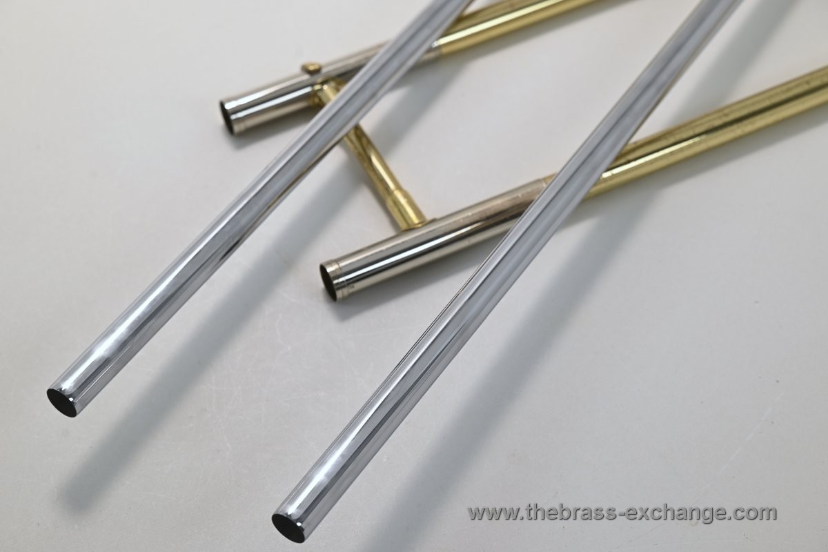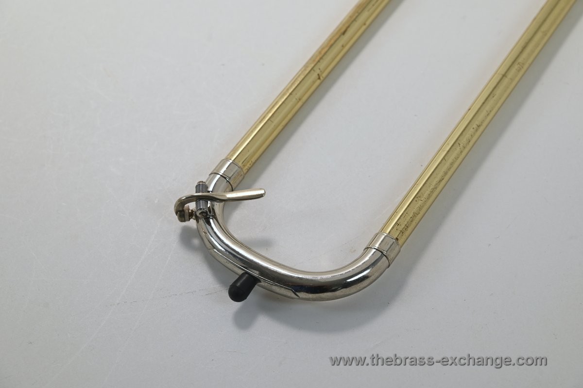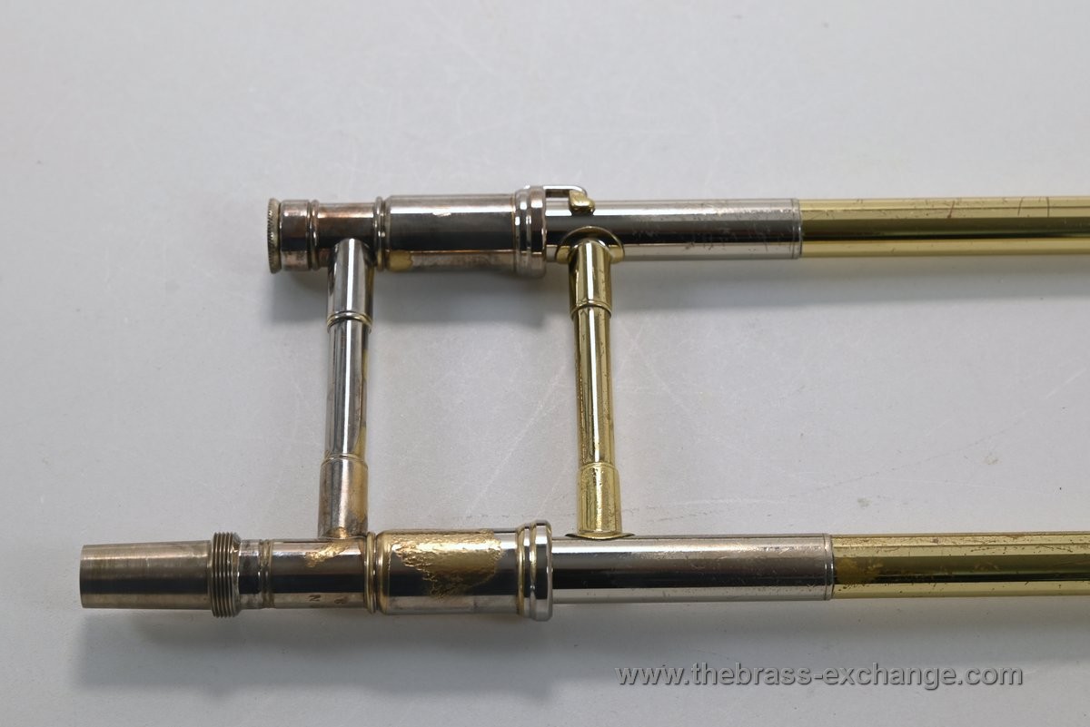 There are no dents or dings, and the overall appearance is good considering its age and use. You will notice some lacquer wear on the outer slide grip areas, neck area, and tuning slides, along with some surface scratches and lacquer loss on the bell. We have improved the cosmetics as much as possible without performing a full re-lacquer, which is not recommended at this price point.
