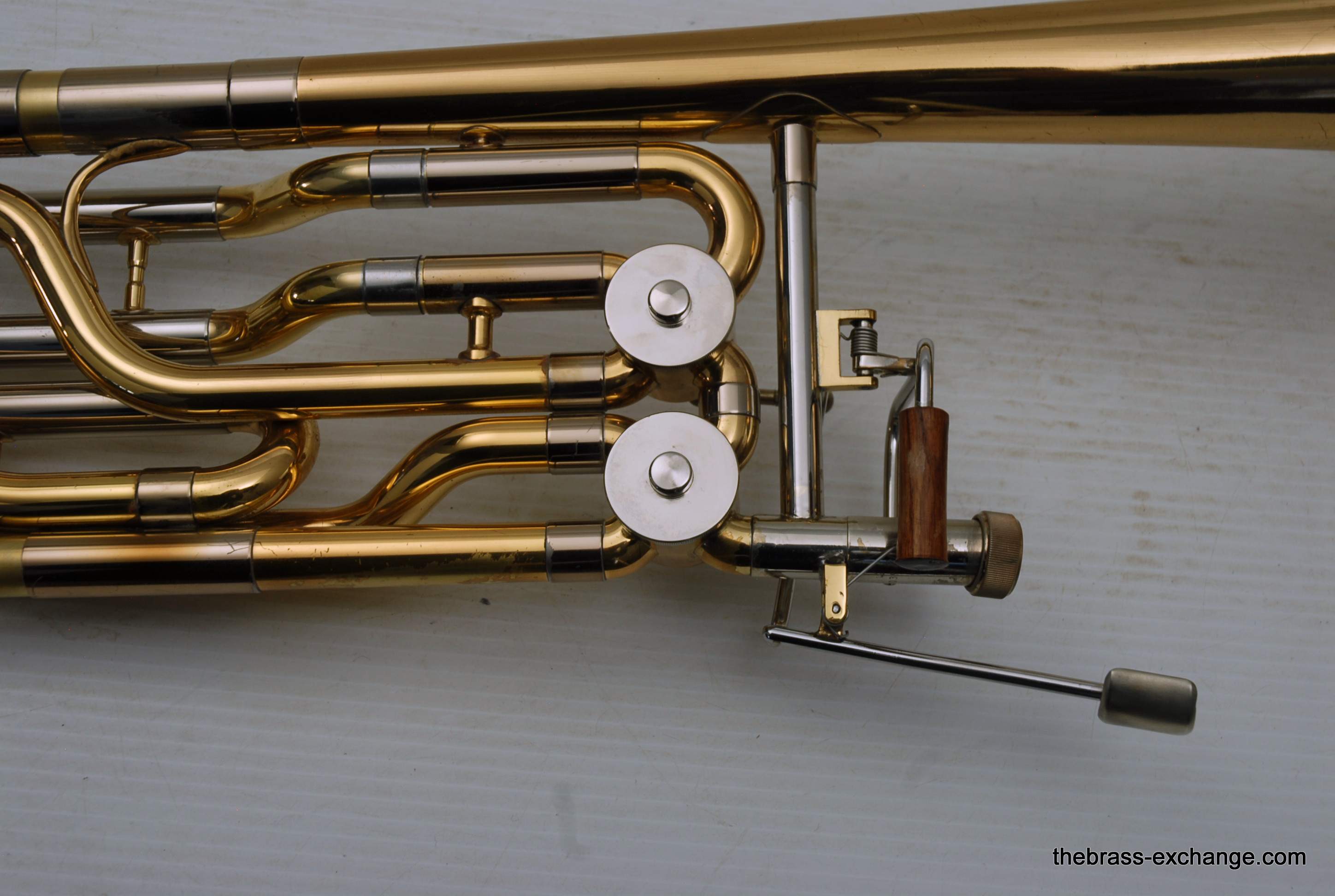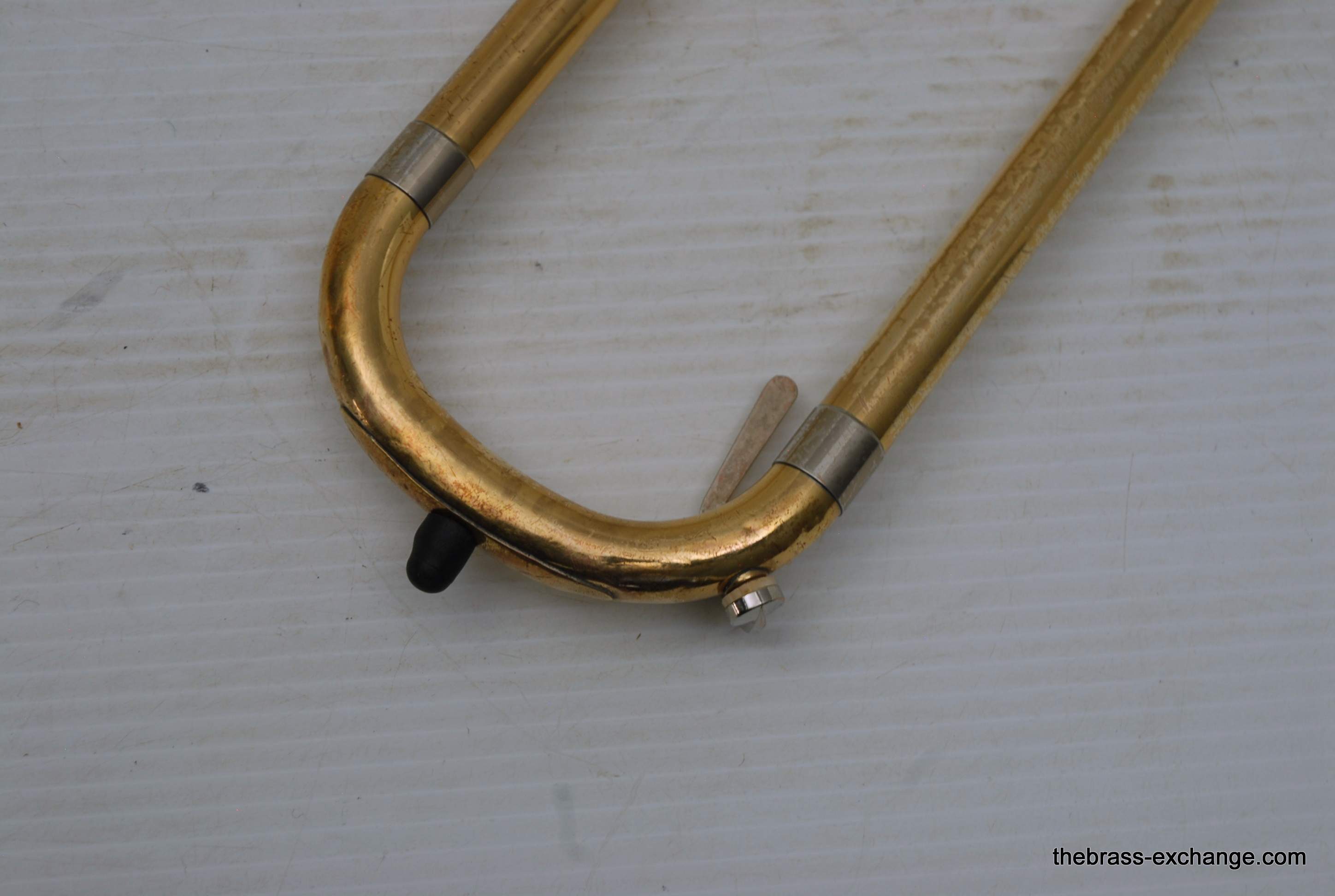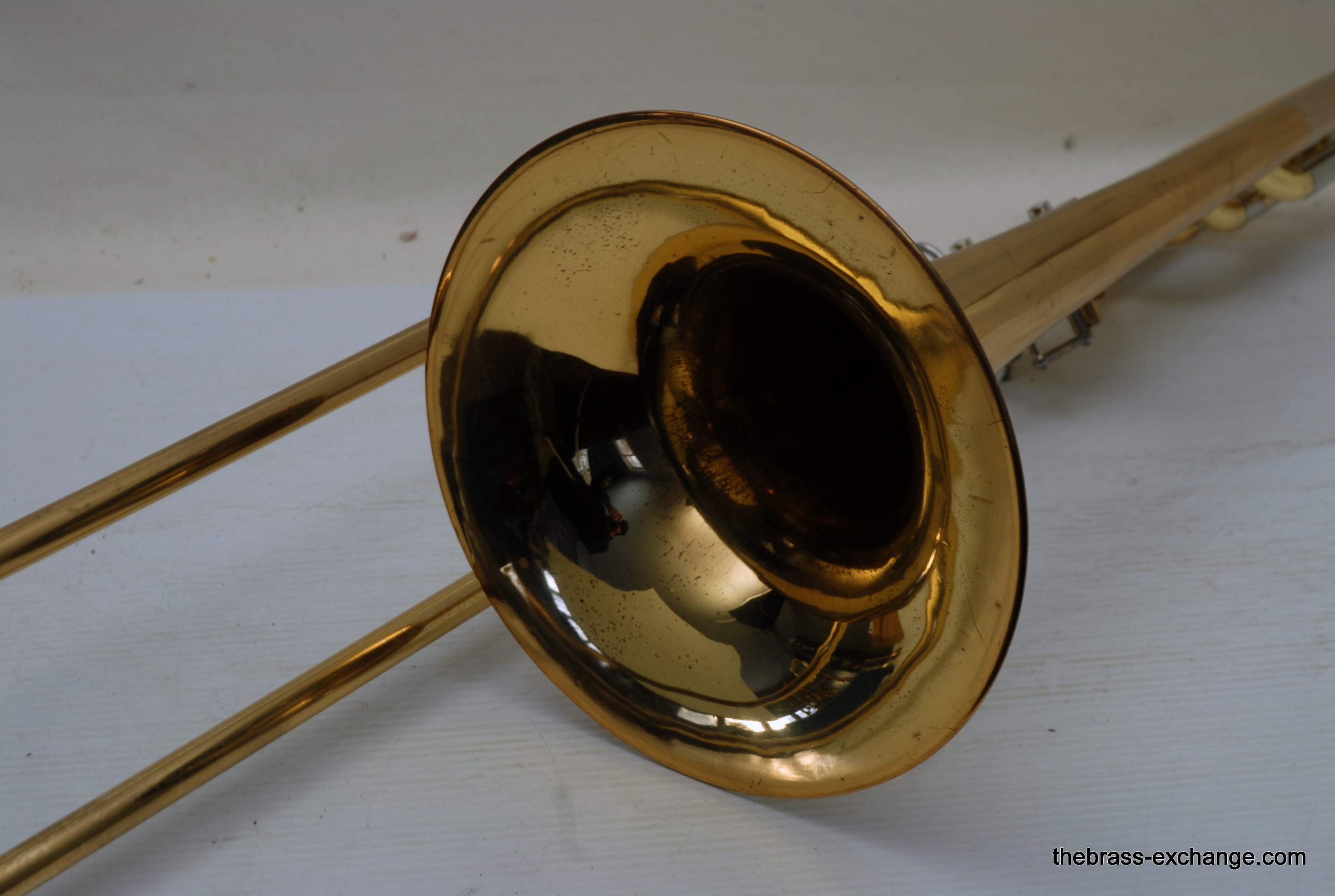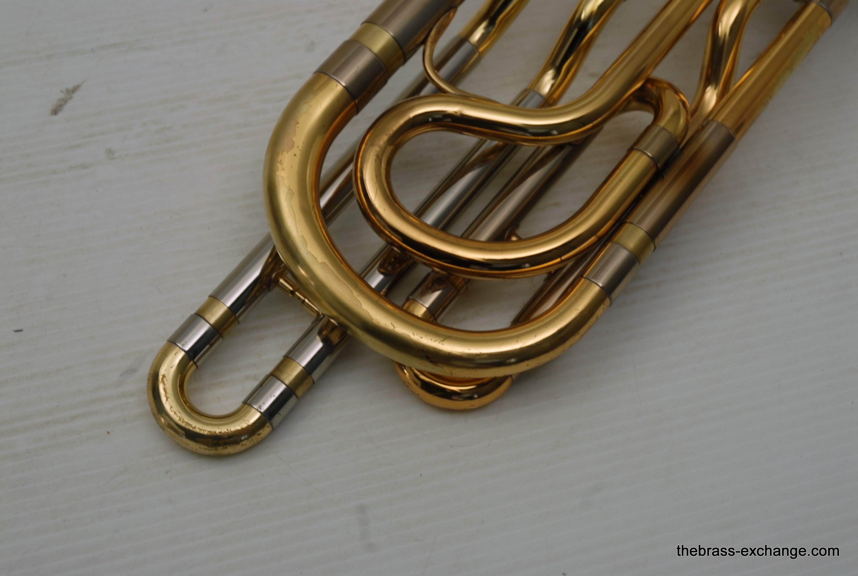 Yamaha YBL-612G Bass Trombone, Used Bass Trombone.  This model was produced between 1985-1991.  Has 10" gold brass bell.  Dependent rotors with modernized split triggers, done in St. Louis. The second valve tuning slide has an extension which enables you to play it as Eb or D with both valves in.  Yamaha’s are known for good valve sections.  This bass trombone has had full shop service including chemical bath and a once over on all of the components, and of course play tested.  No dents/dings or need to visit a repairman, we just set it up. You may be able to inspect it closely and see remnants of minor dings removed but not much.  This one does have a proven track record with results.  Will not disappoint any advancing player. Is a very nice entry level pro bass trombone.  Includes case, fresh lubricants and slide set up. In stock for immediate delivery.