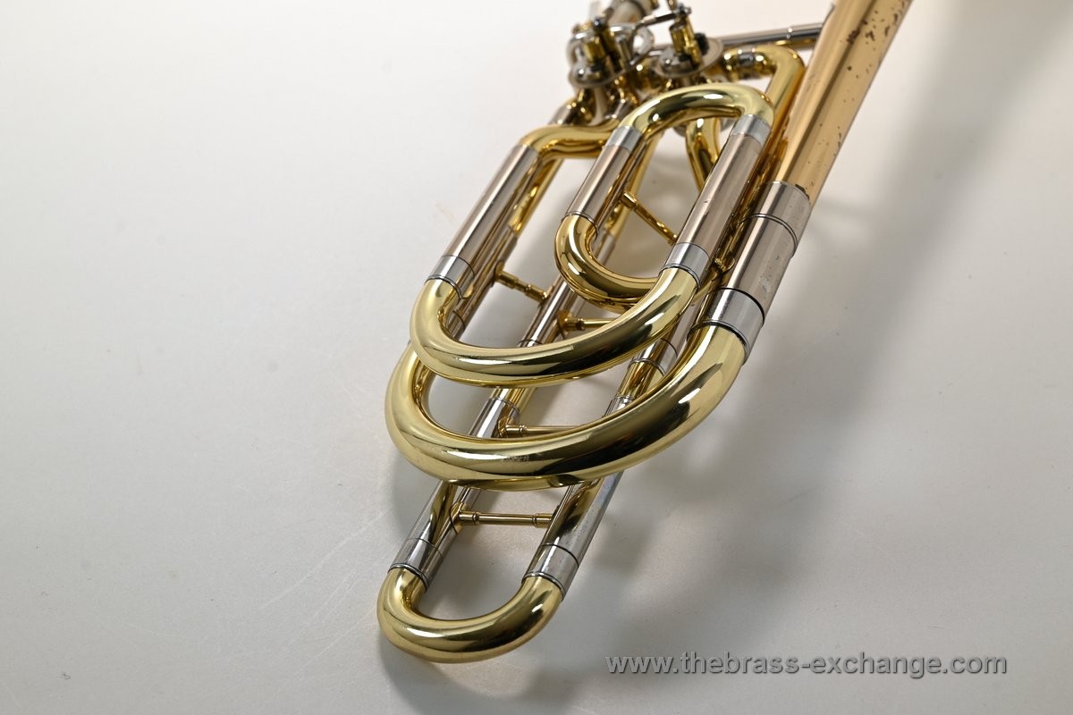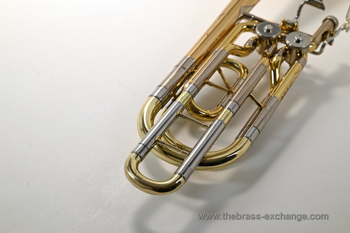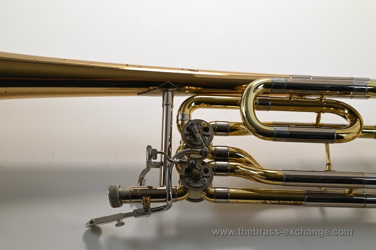 The 9.5" gold brass bell provides a rich, warm tone with excellent projection, while the .562 bore handslide ensures a balanced response across all registers. The dependent rotor system offers Bb/F/Gb/D configurations, making it a highly flexible bass trombone setup.
