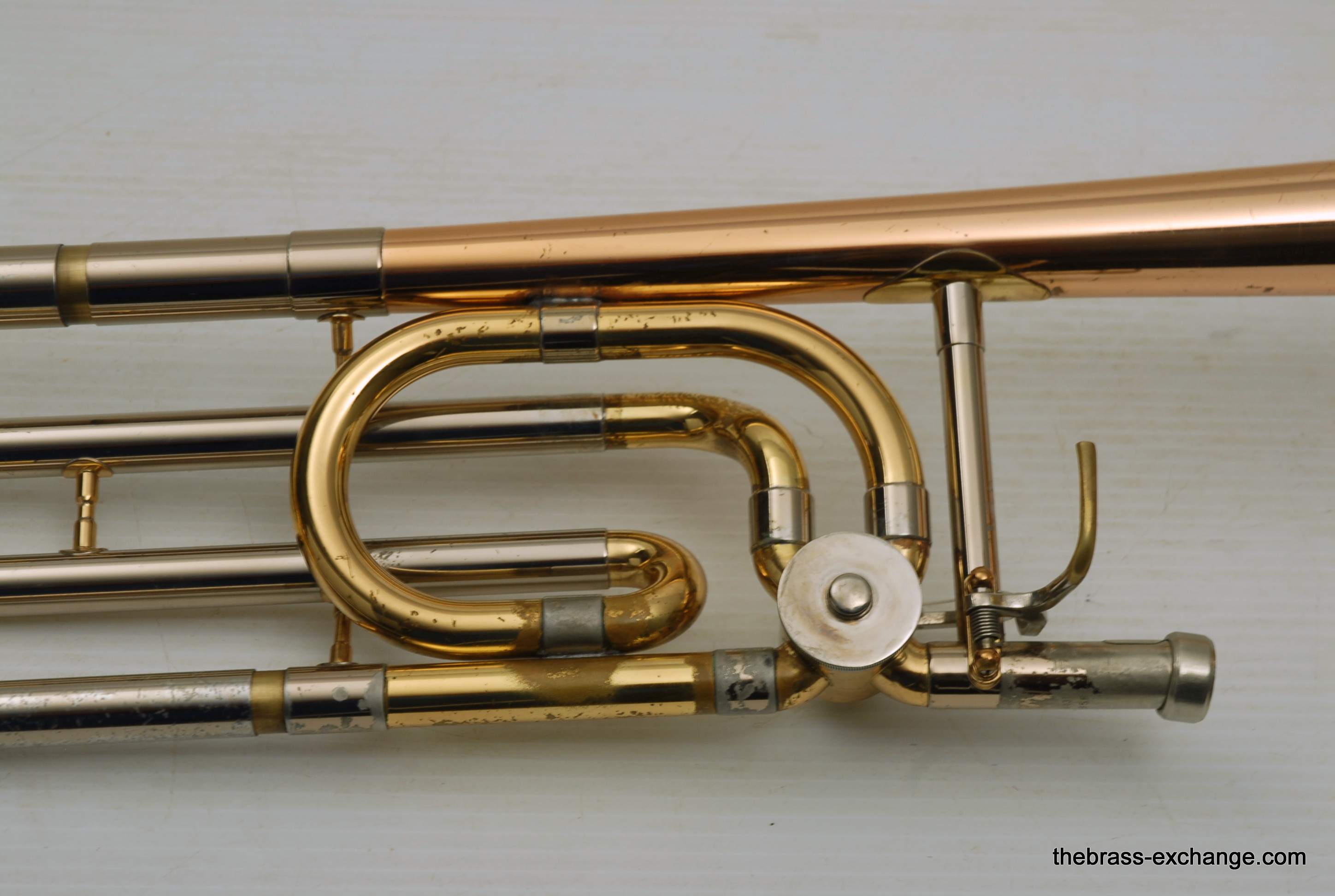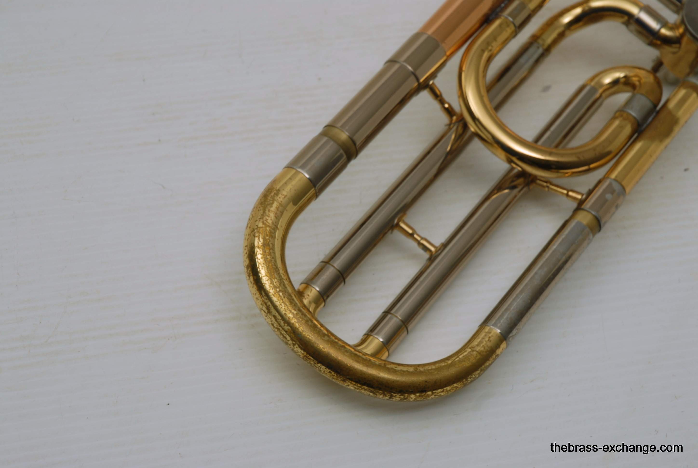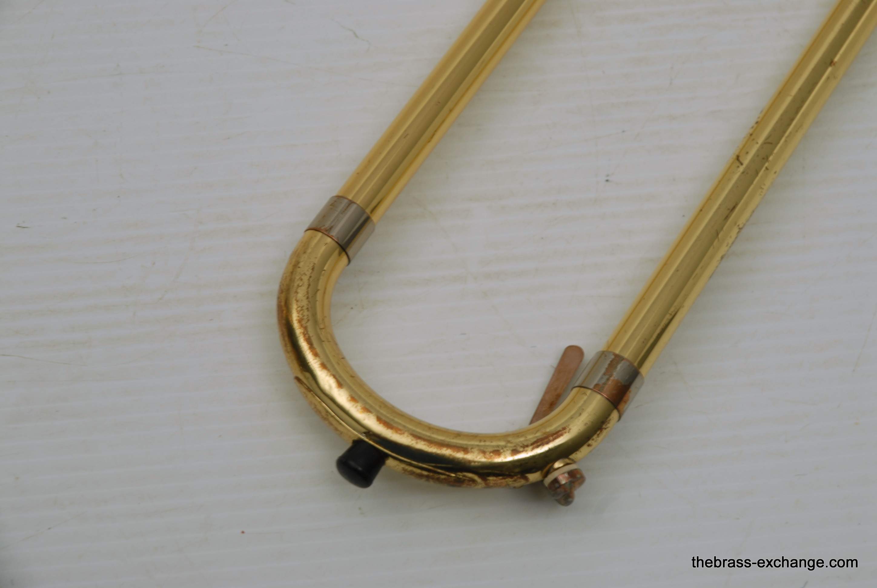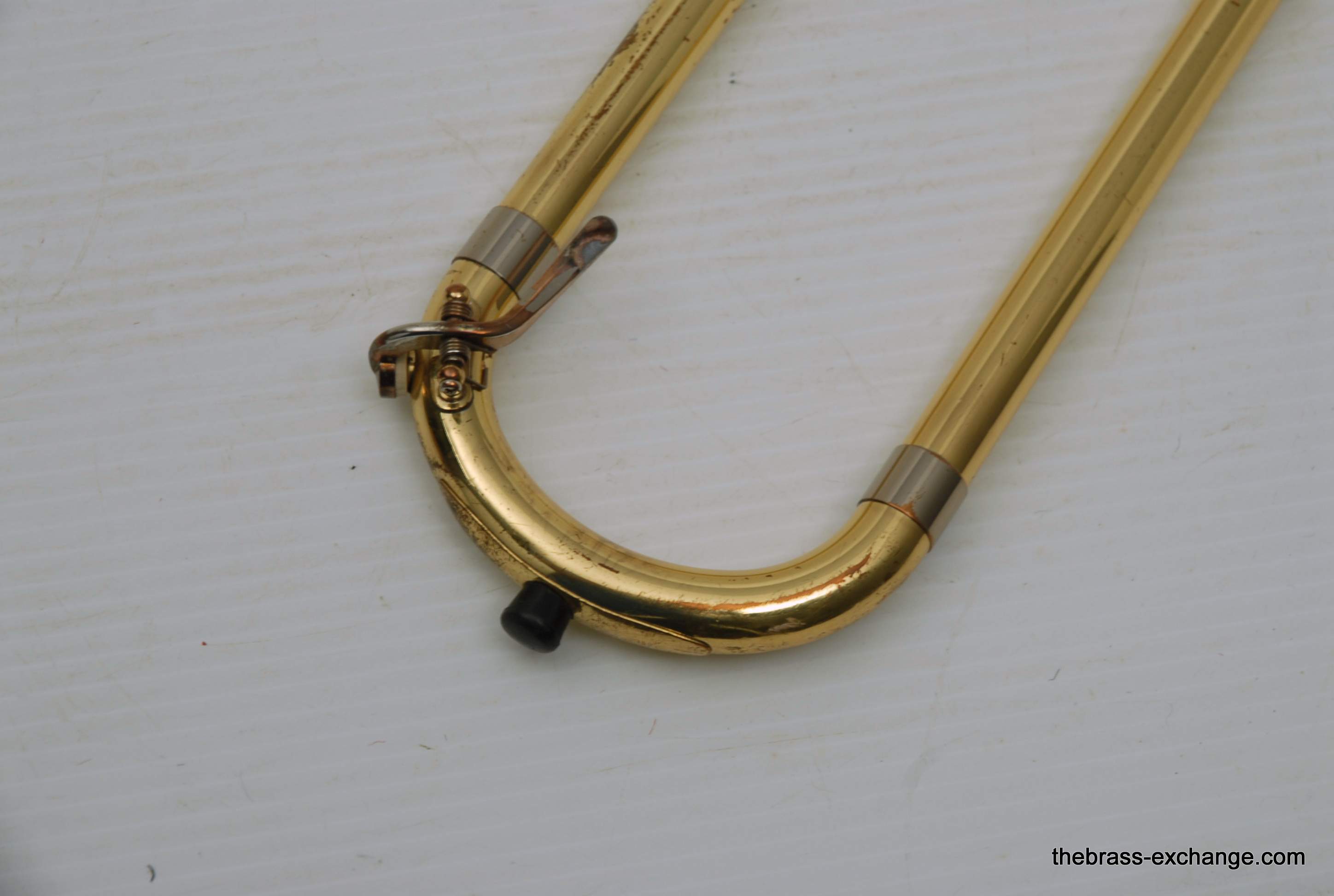 Yamaha YSL-643II Experienced Large Bore Tenor. This is the classic Yamaha model similar to the Conn 88H. Has the 8.5" rose brass bell and large bore .547 tenor handslide. This one has been played on quite a bit, it's mainly just lacquer wear. Everything else is good, rotor, handslide, although there is a patch brace on the slide grip area. Original case and mouthpiece included. Not many pro level tenors with .547 bore and f-attachment under $1000 in playable conditon these days. Would make a perfect first trigger horn for anyone looking at this price point. In-stock for immediate delivery.