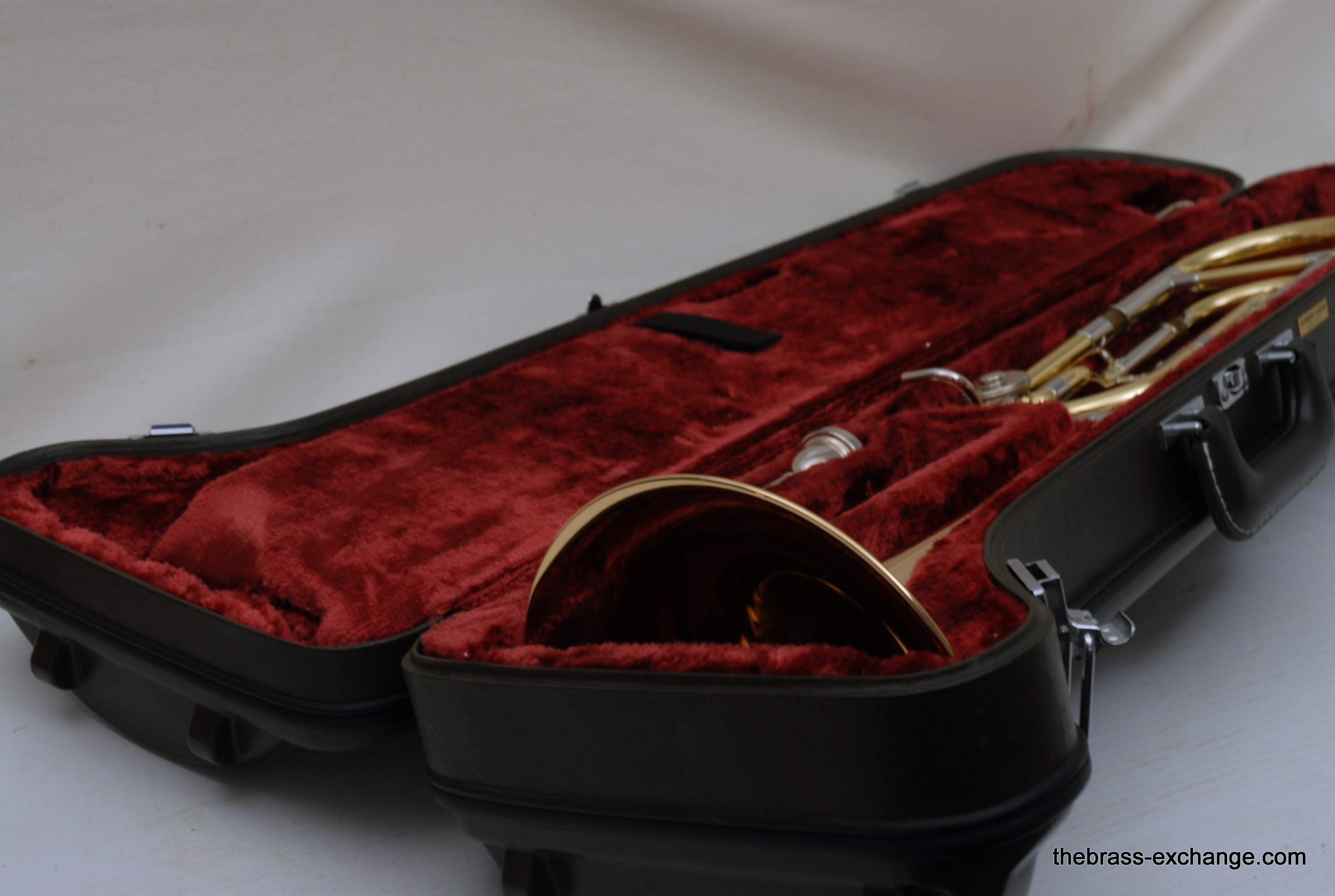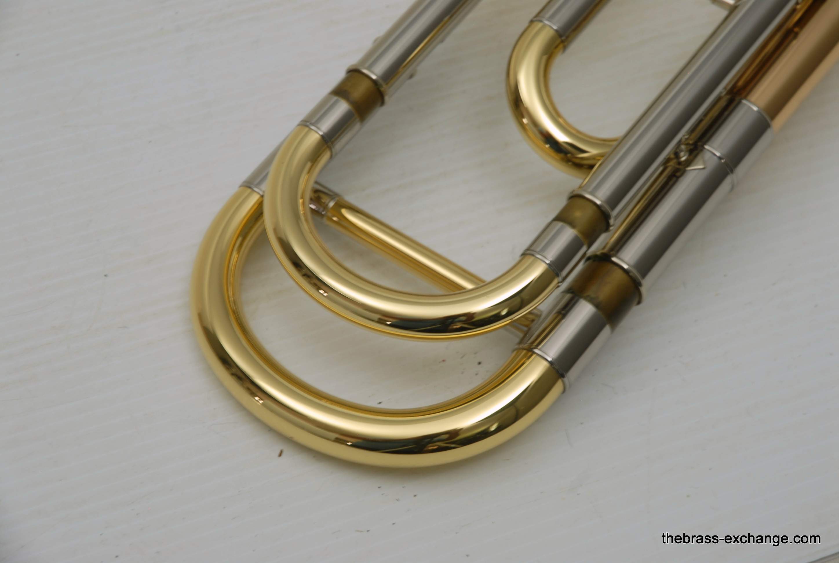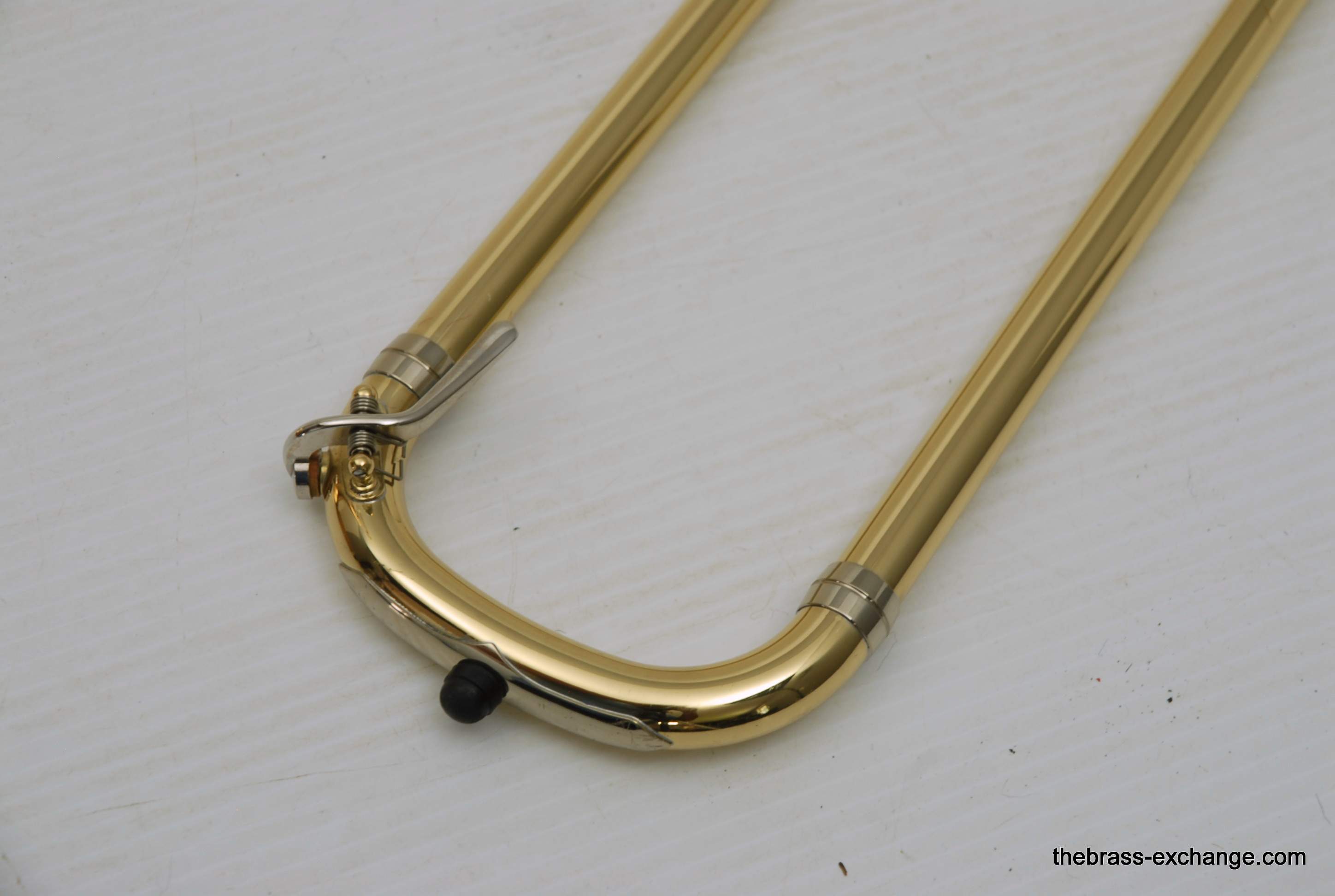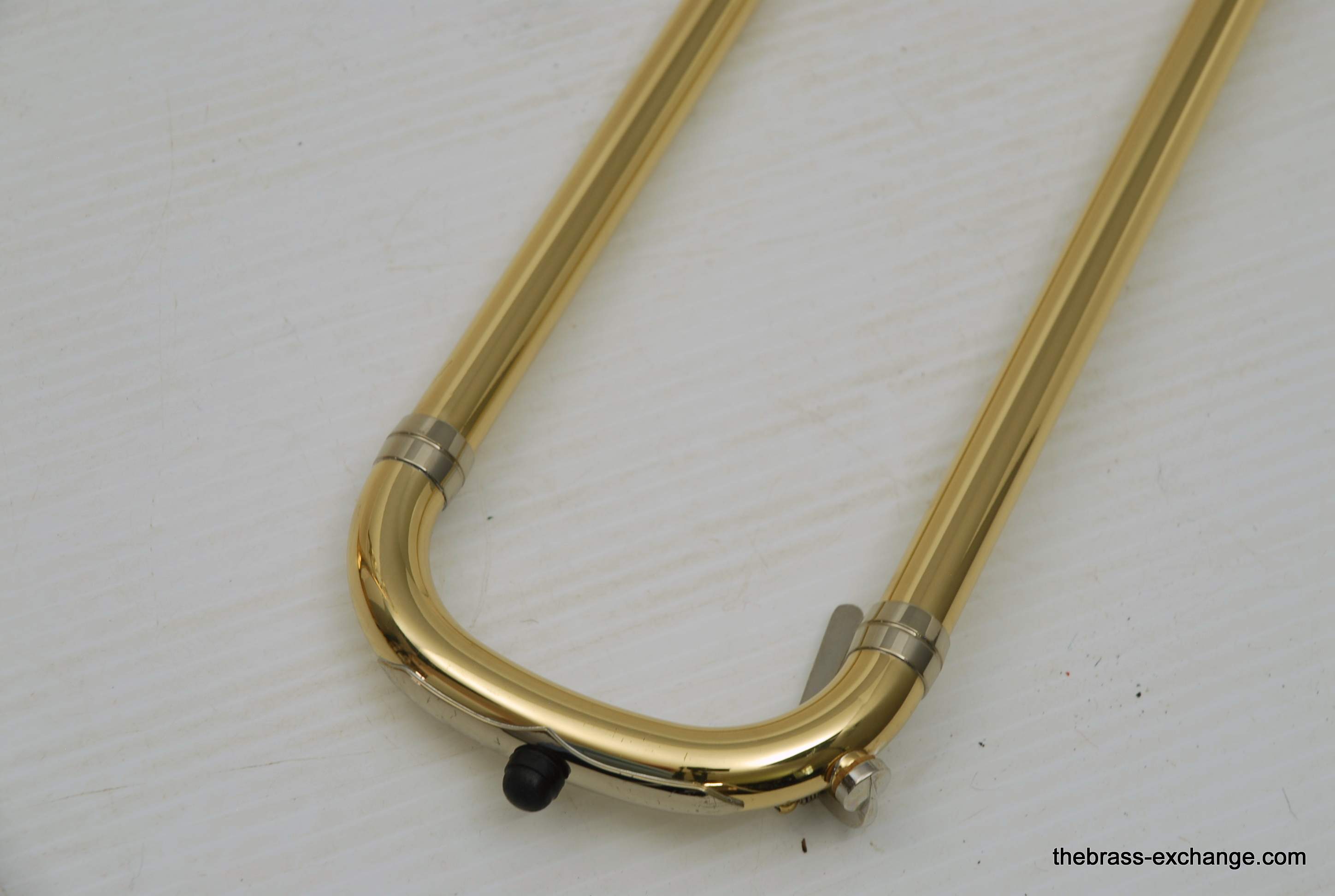 Yamaha YSL-820GD Very Mint Japan Only Model. Large bore tenor .547 bore with 8.5" gold brass bell, lightweight yellow brass handslide. This is a perfect condition Japan Only model from out trading partner in Japan. Has a lightweight gold brass bell. No previous damage or repairs. Single owner horn lightly played. Case and mouthpiece included. Would make an excellent first large bore trigger horn for any advancing player. In-stock for immediate delivery.